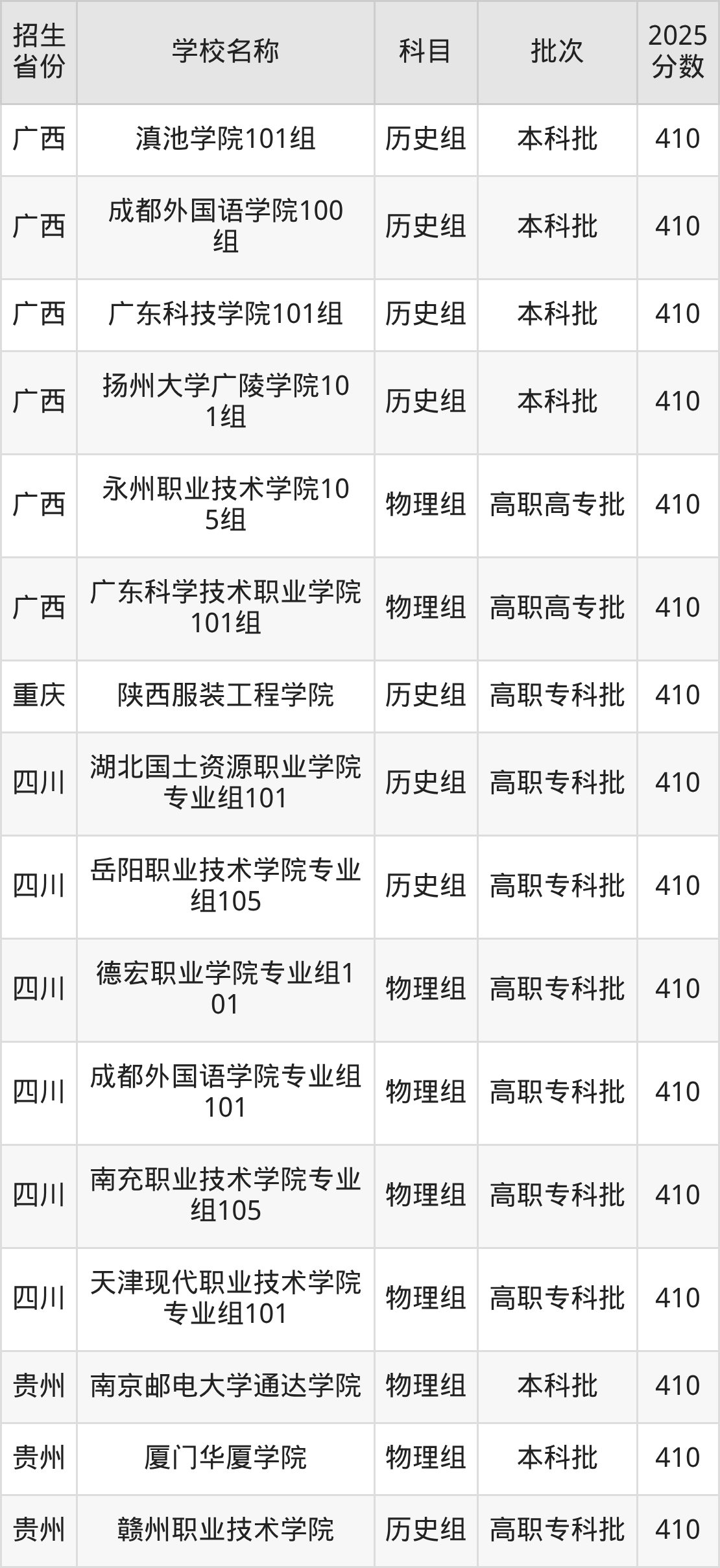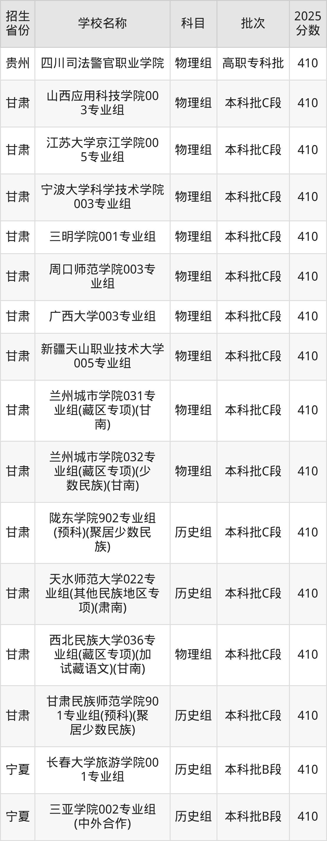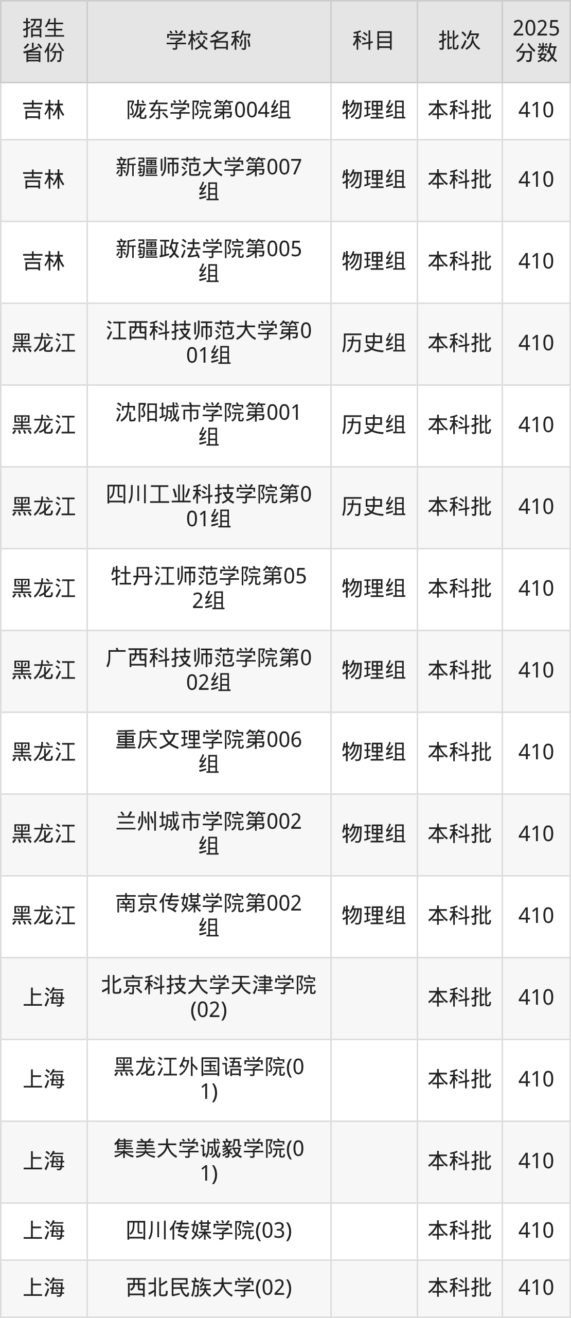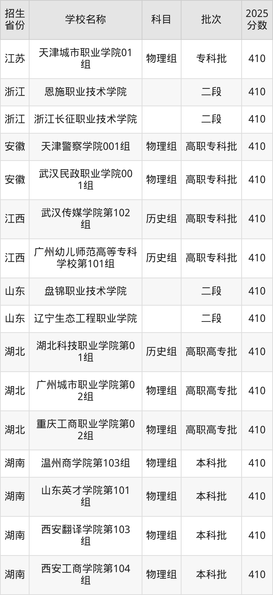 筛选全国各省2025年录取分数线为410分的文科大学如下: