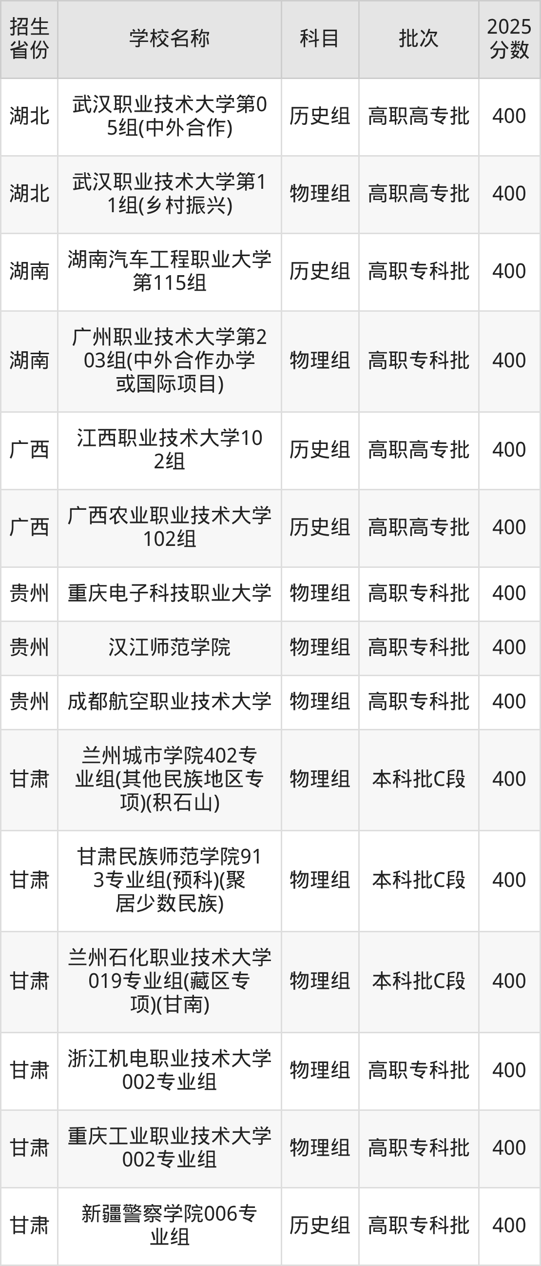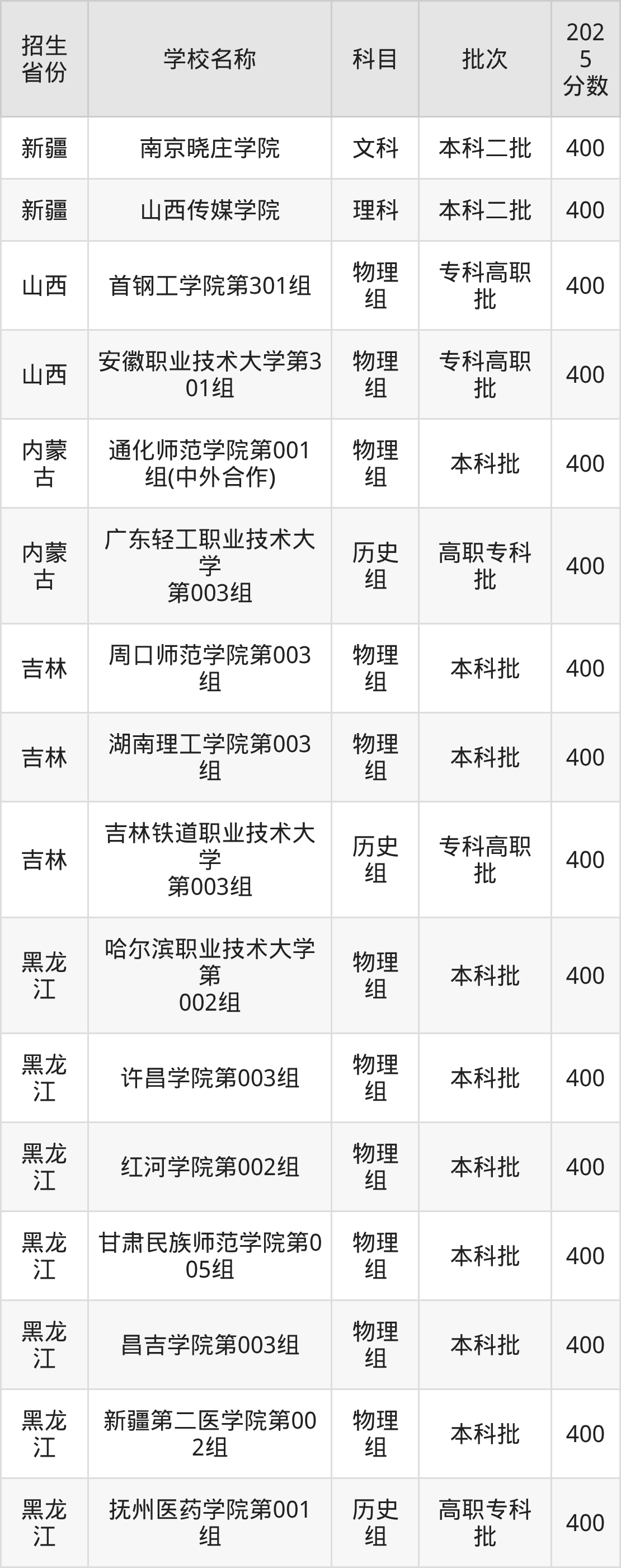 筛选全国各省2025年录取分数线为400分的二本公办大学如下: