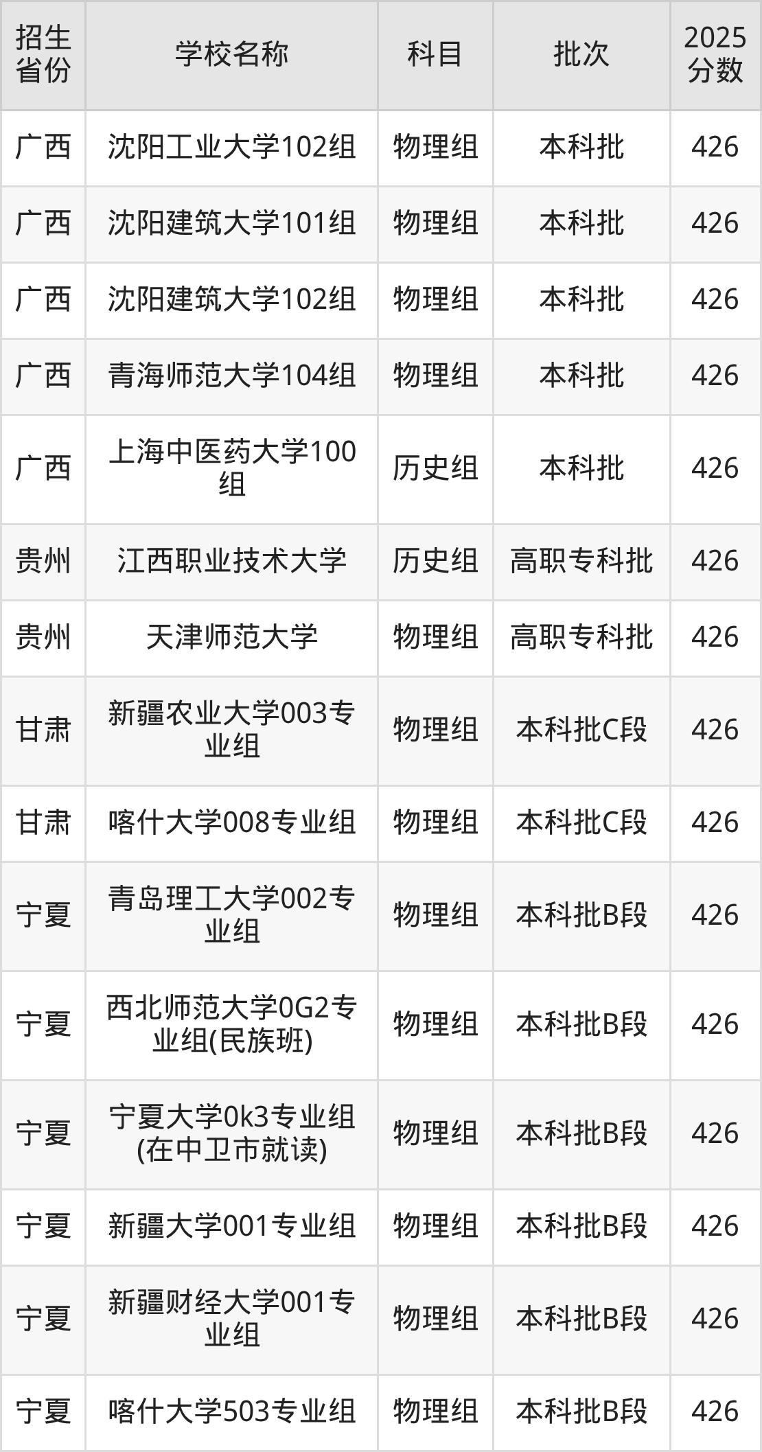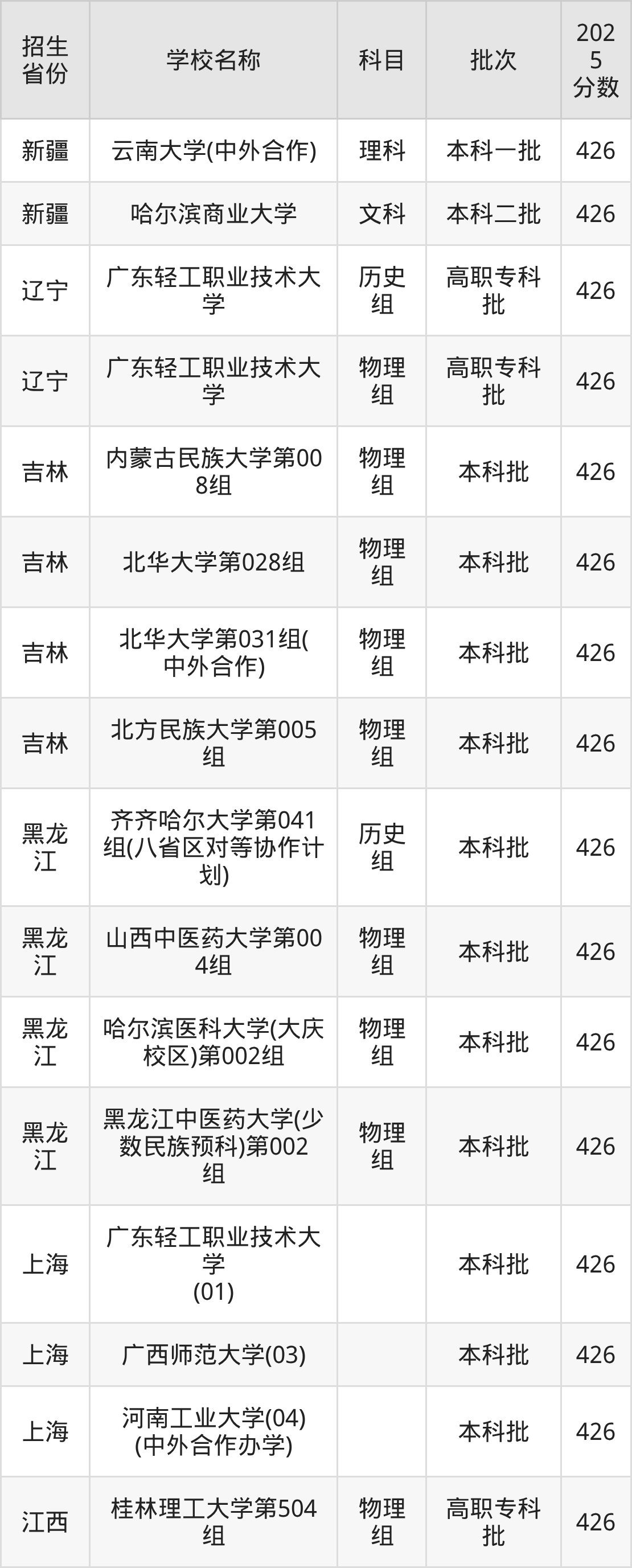 筛选全国各省2025年录取分数线为426分的重点大学如下: