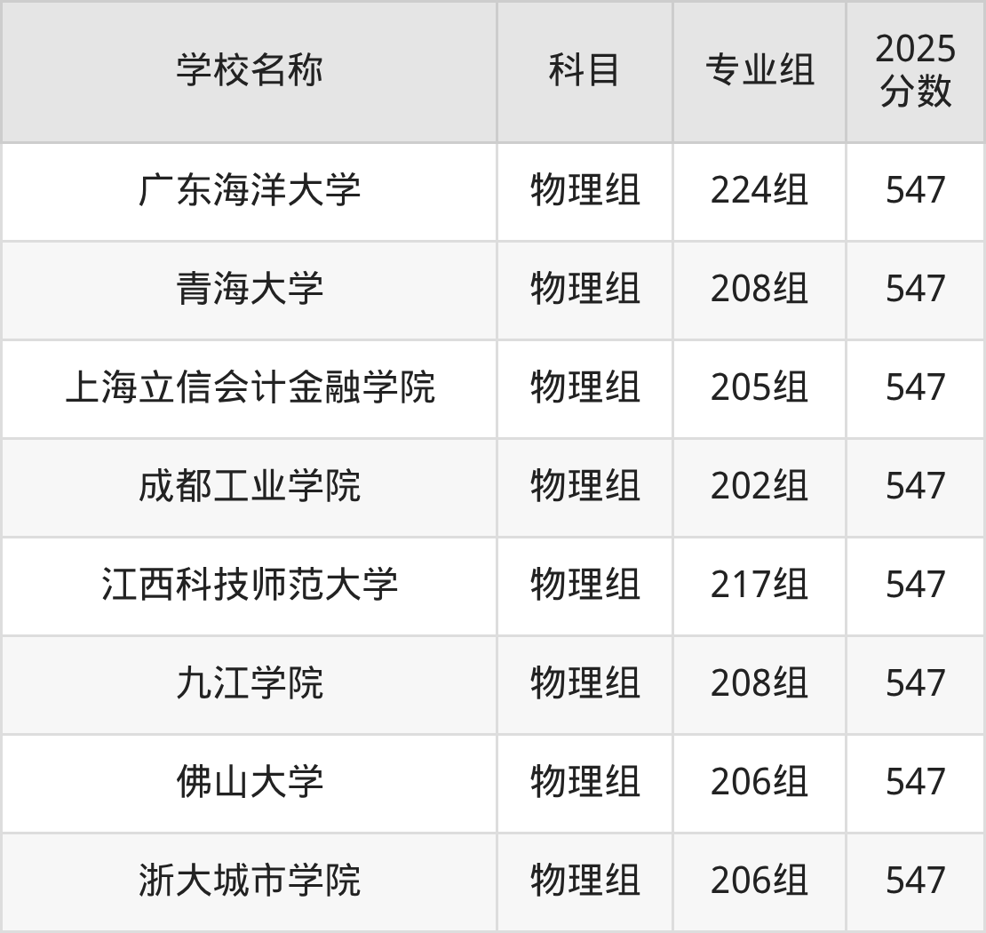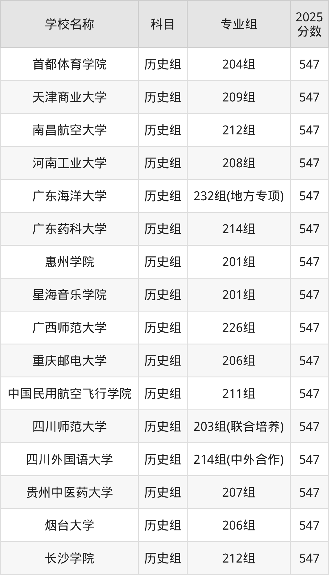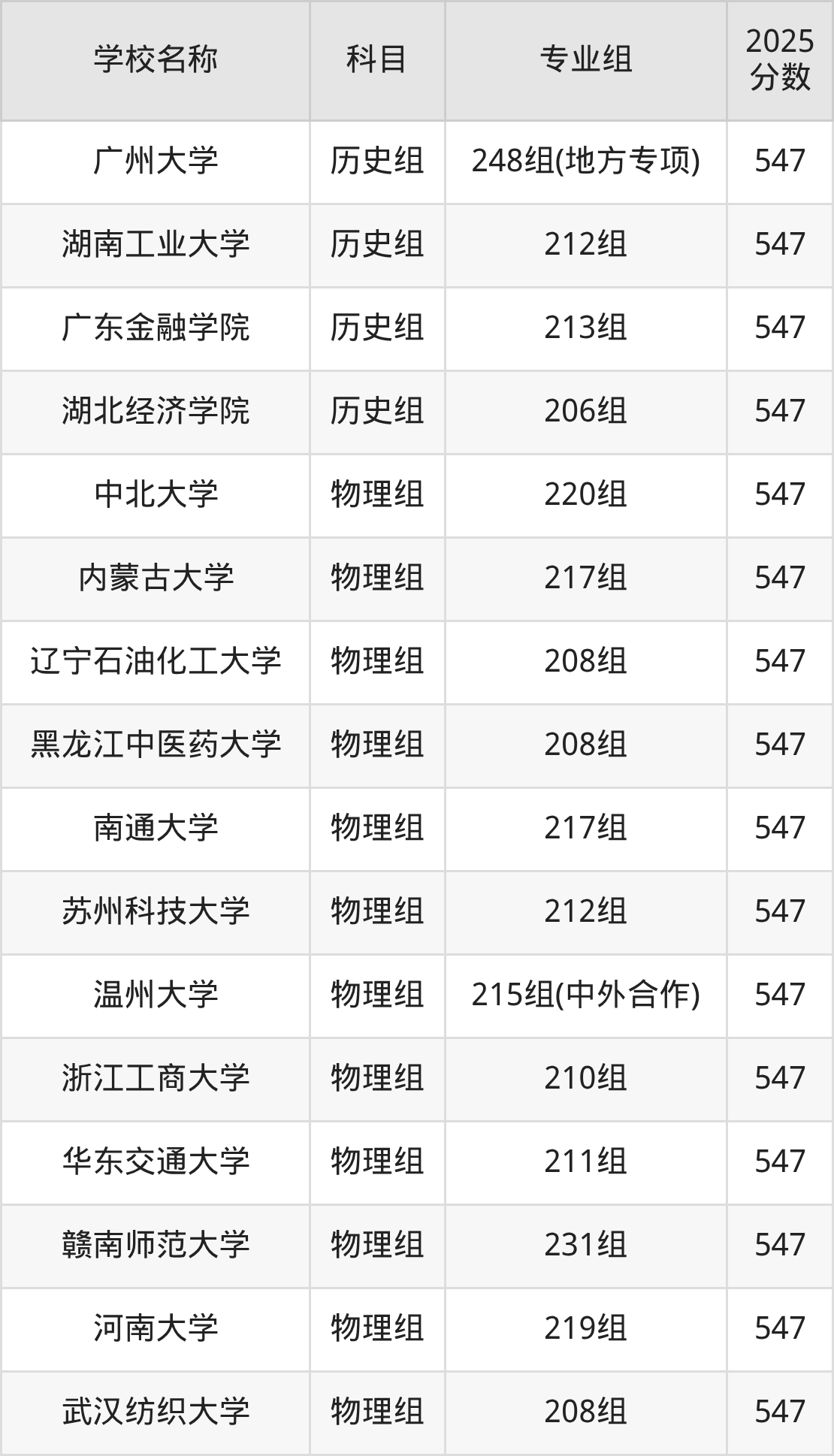 广东高考录取分数线在547分左右的公办院校专业组一共有40个,其中历史组有:首都体育学院(547分)、天津商业大学(547分)、南昌航空大学(547分),物理组有:中北大学(547分)、内蒙古大学(547分)、辽宁石油化工大学(547分)。