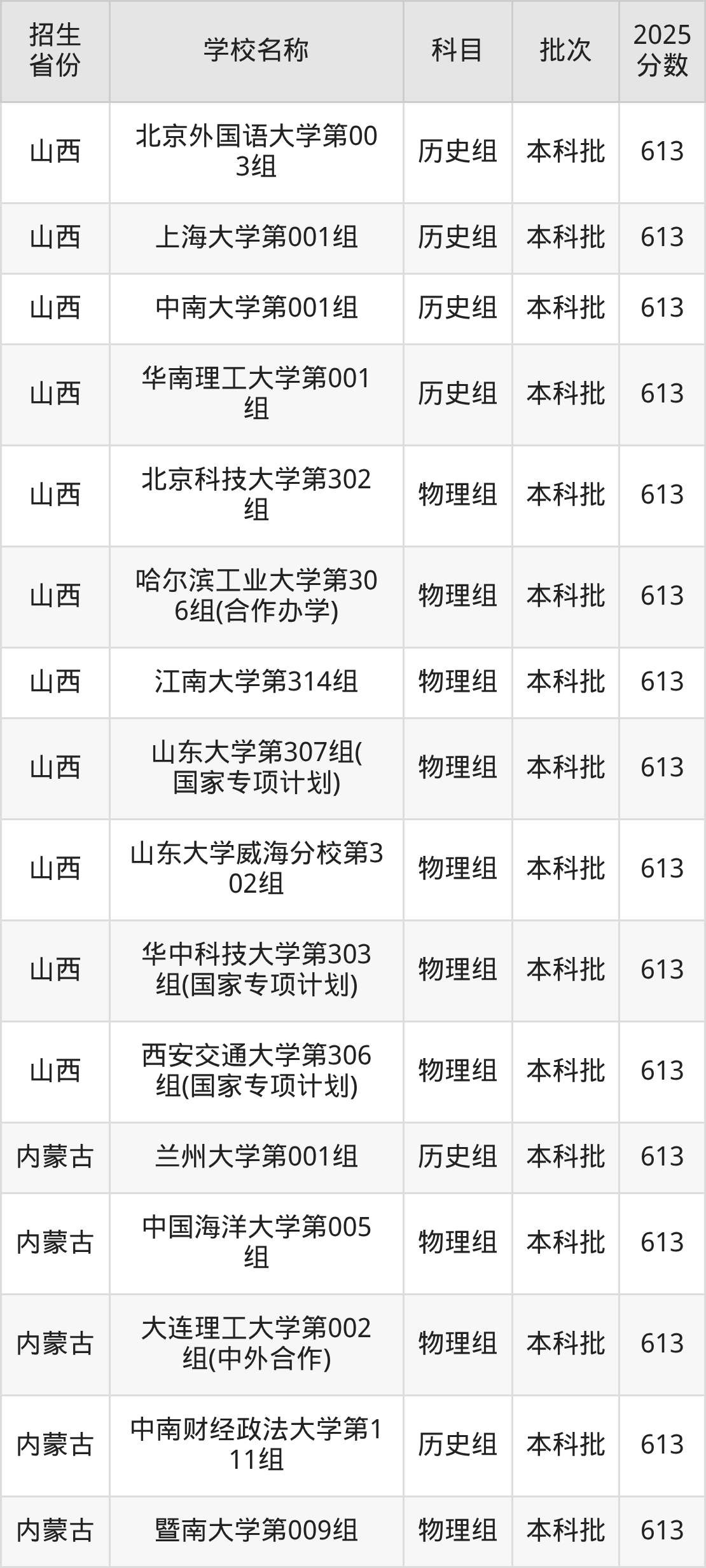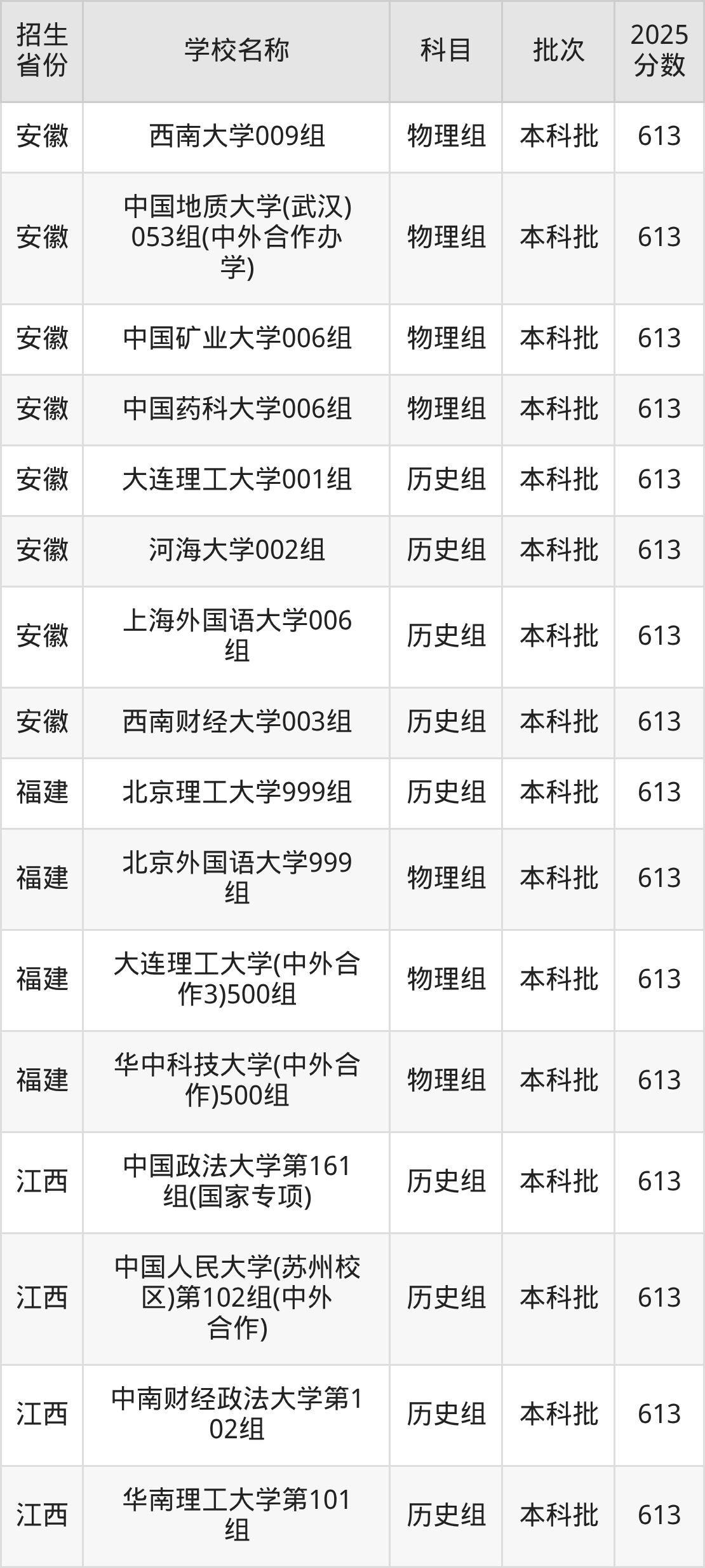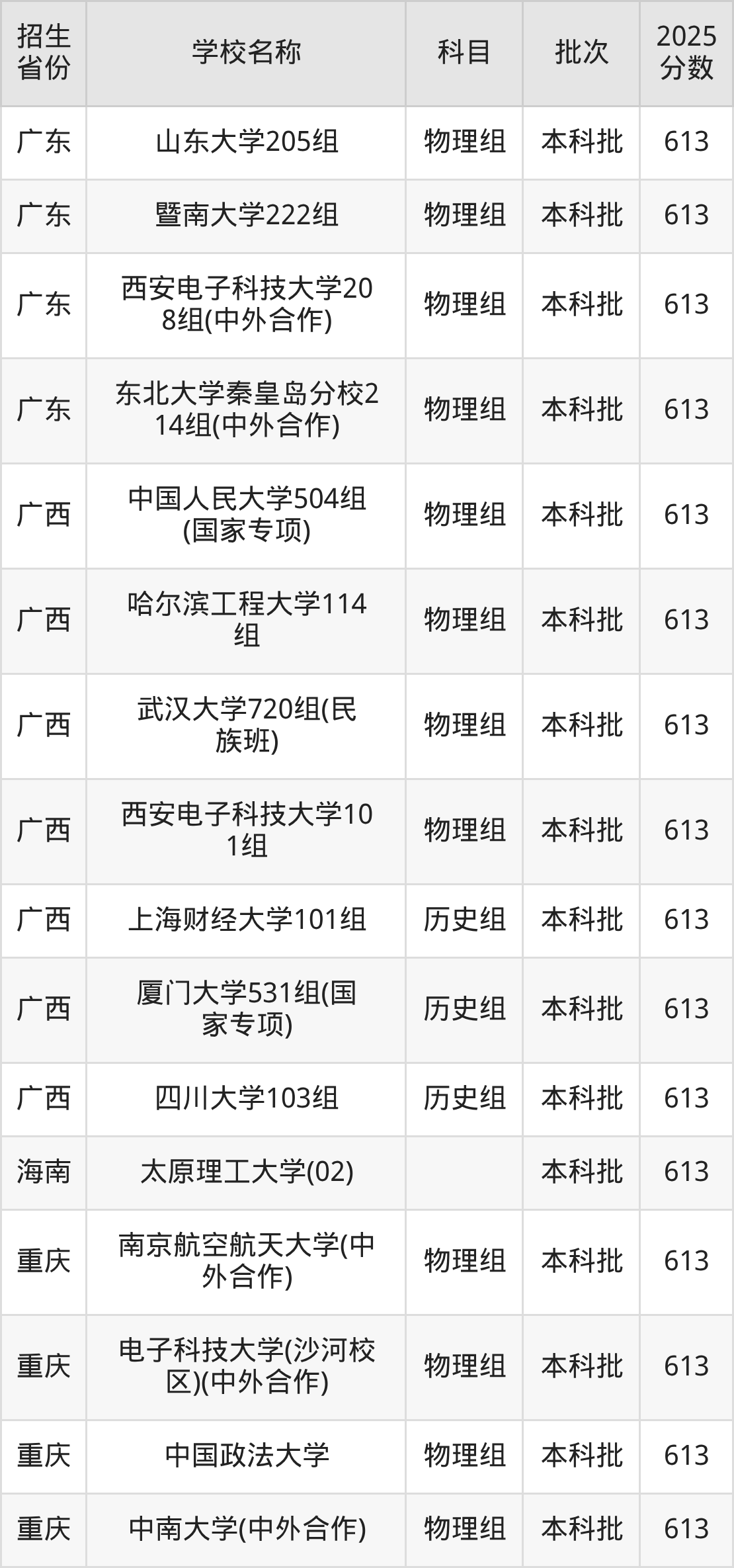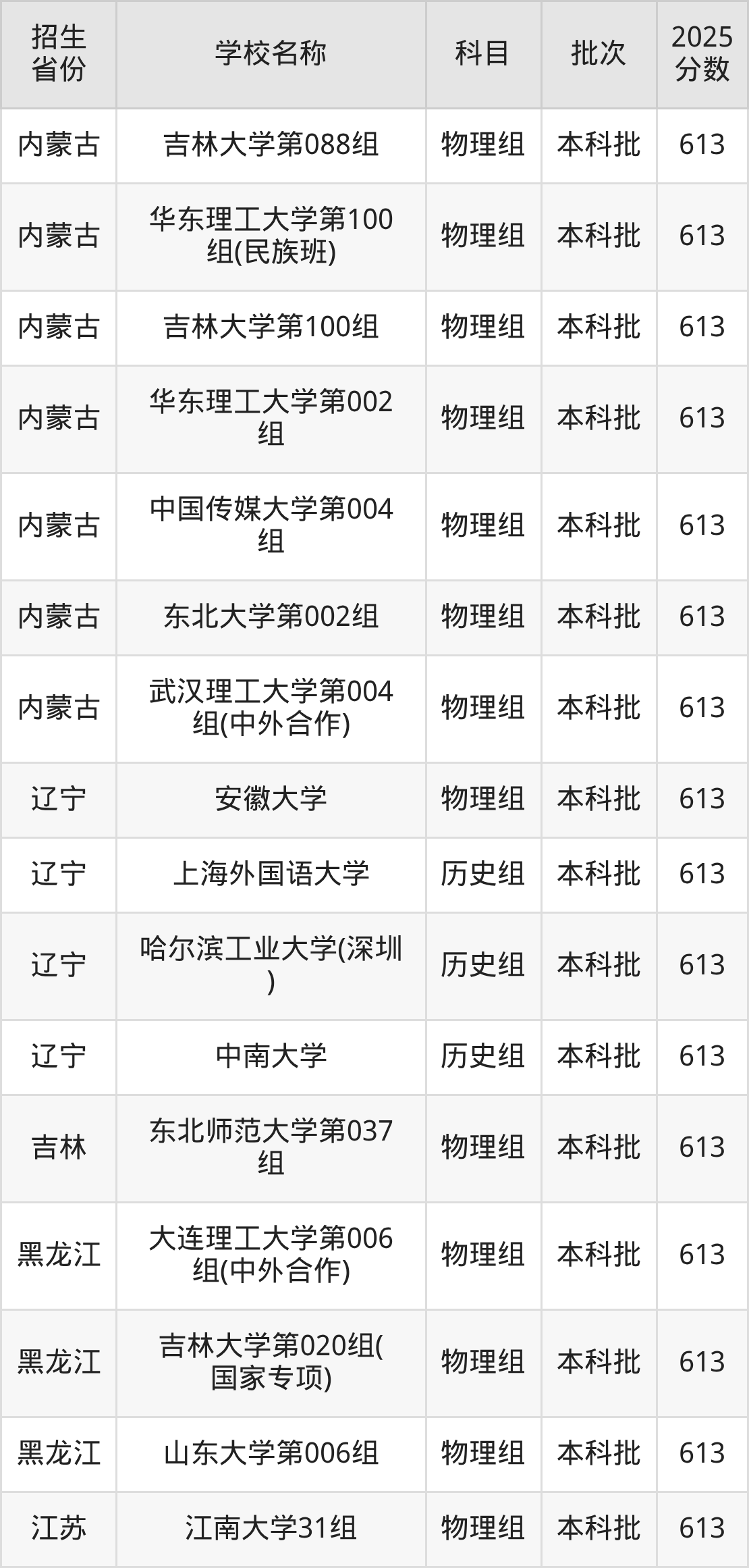 筛选全国各省2025年录取分数线为613分的211大学如下: