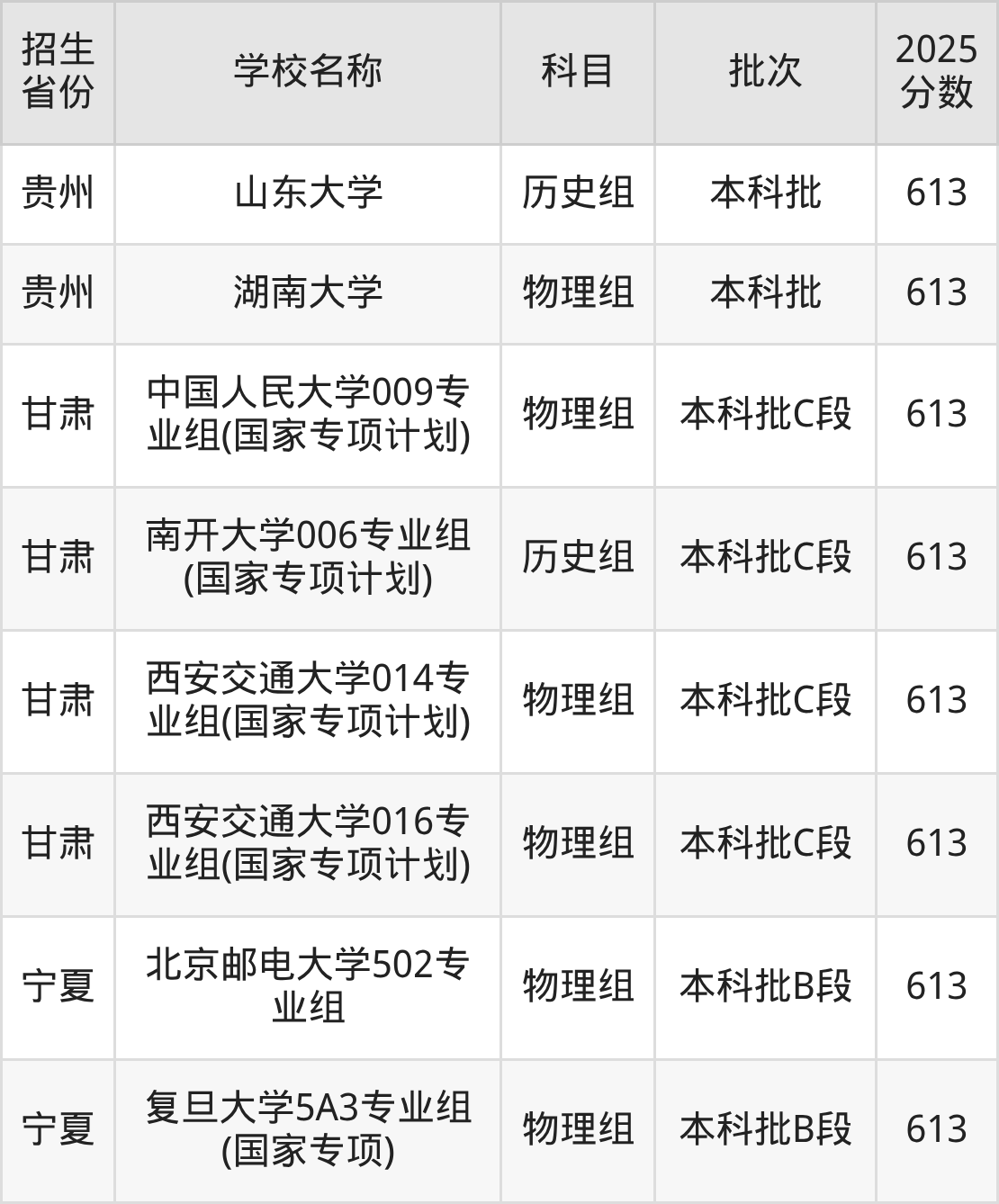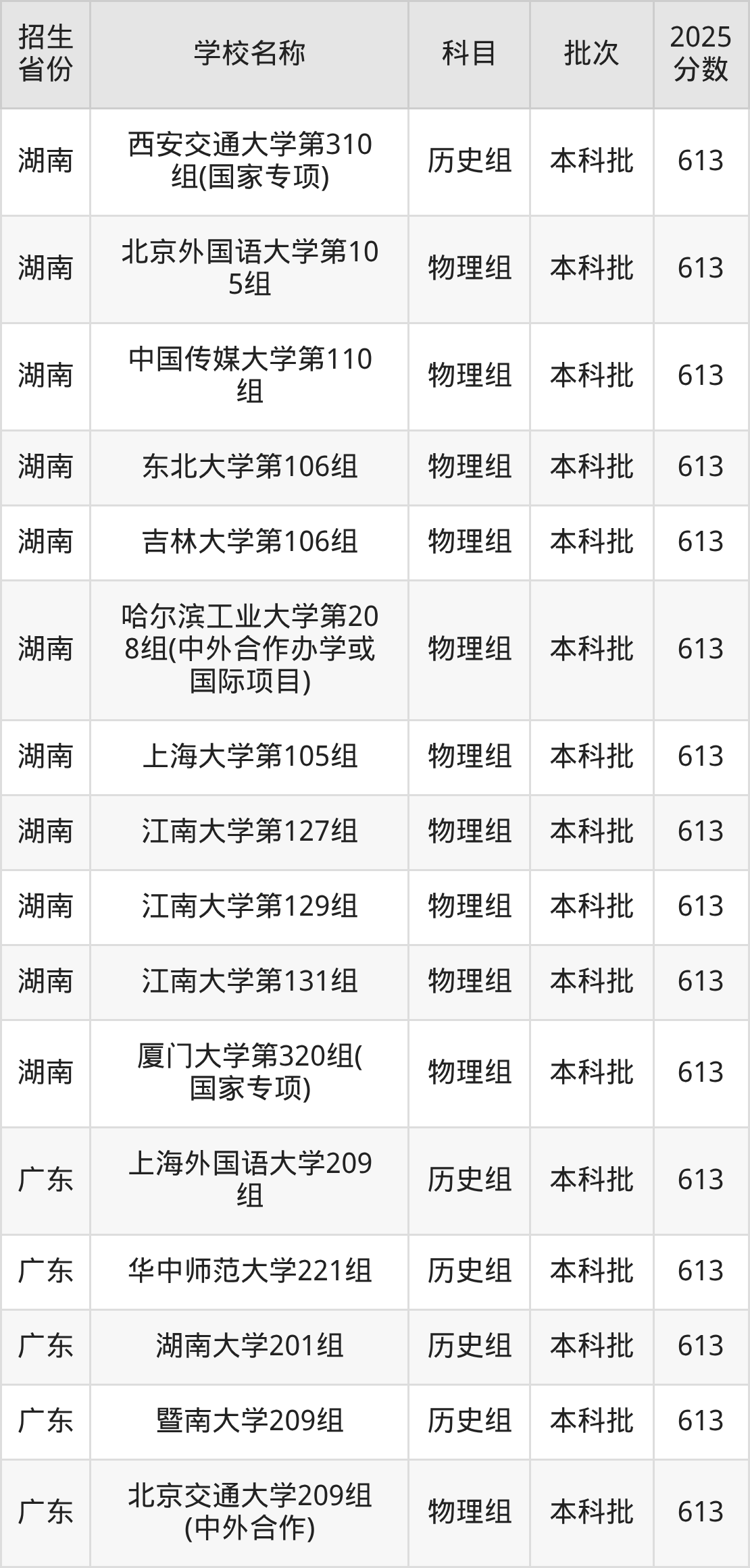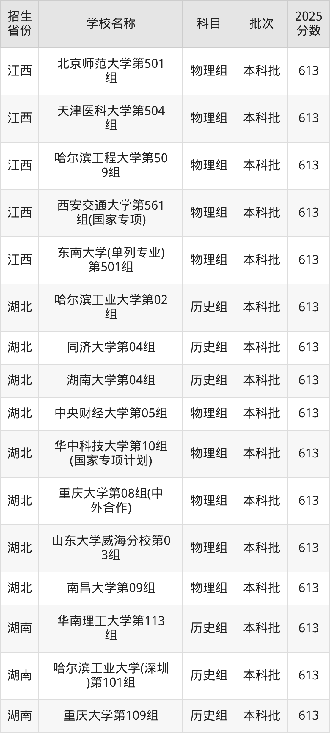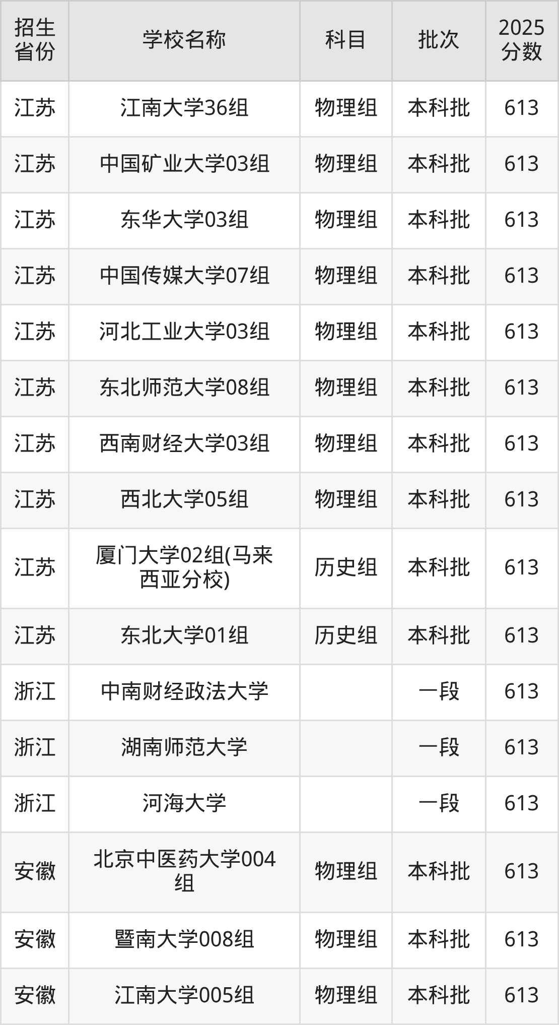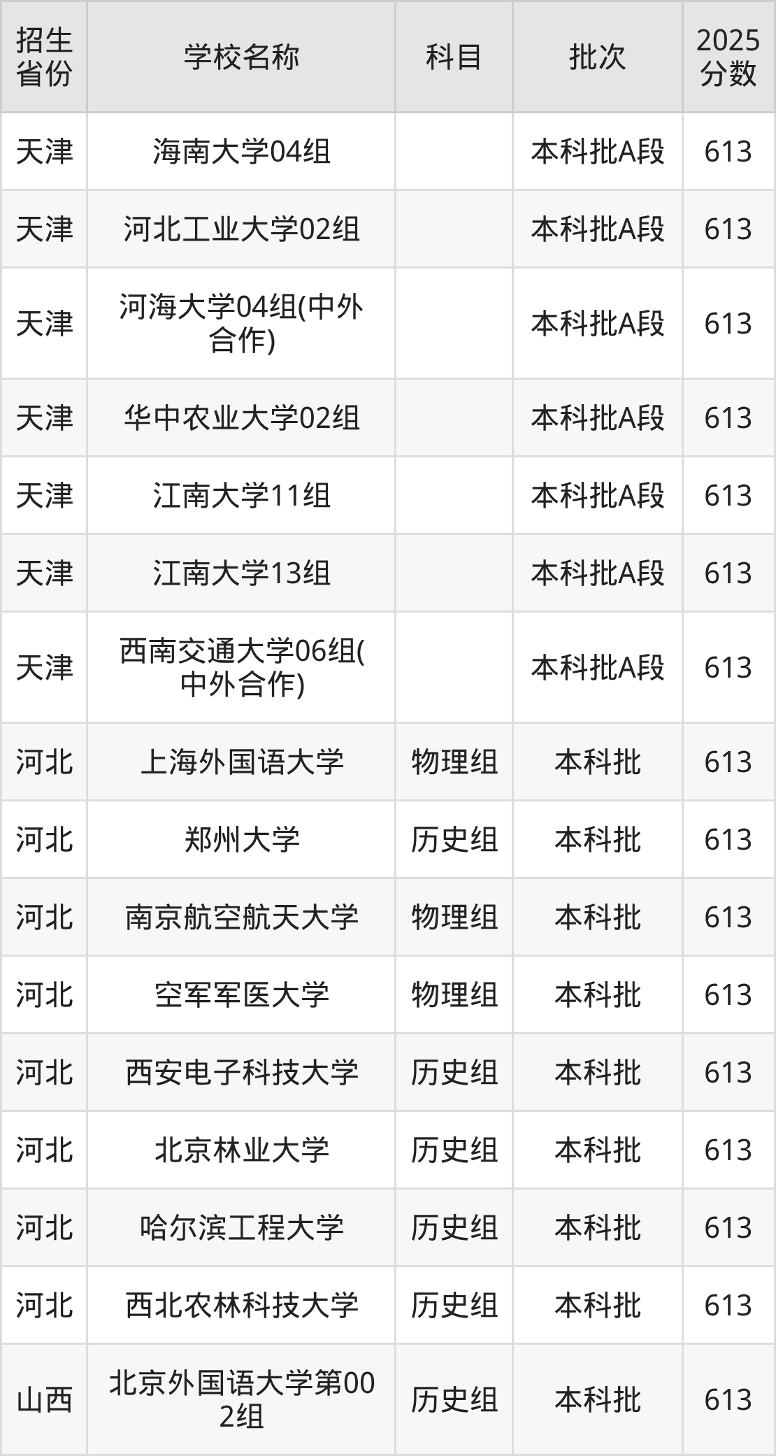 筛选全国各省2025年录取分数线为613分的211大学如下: