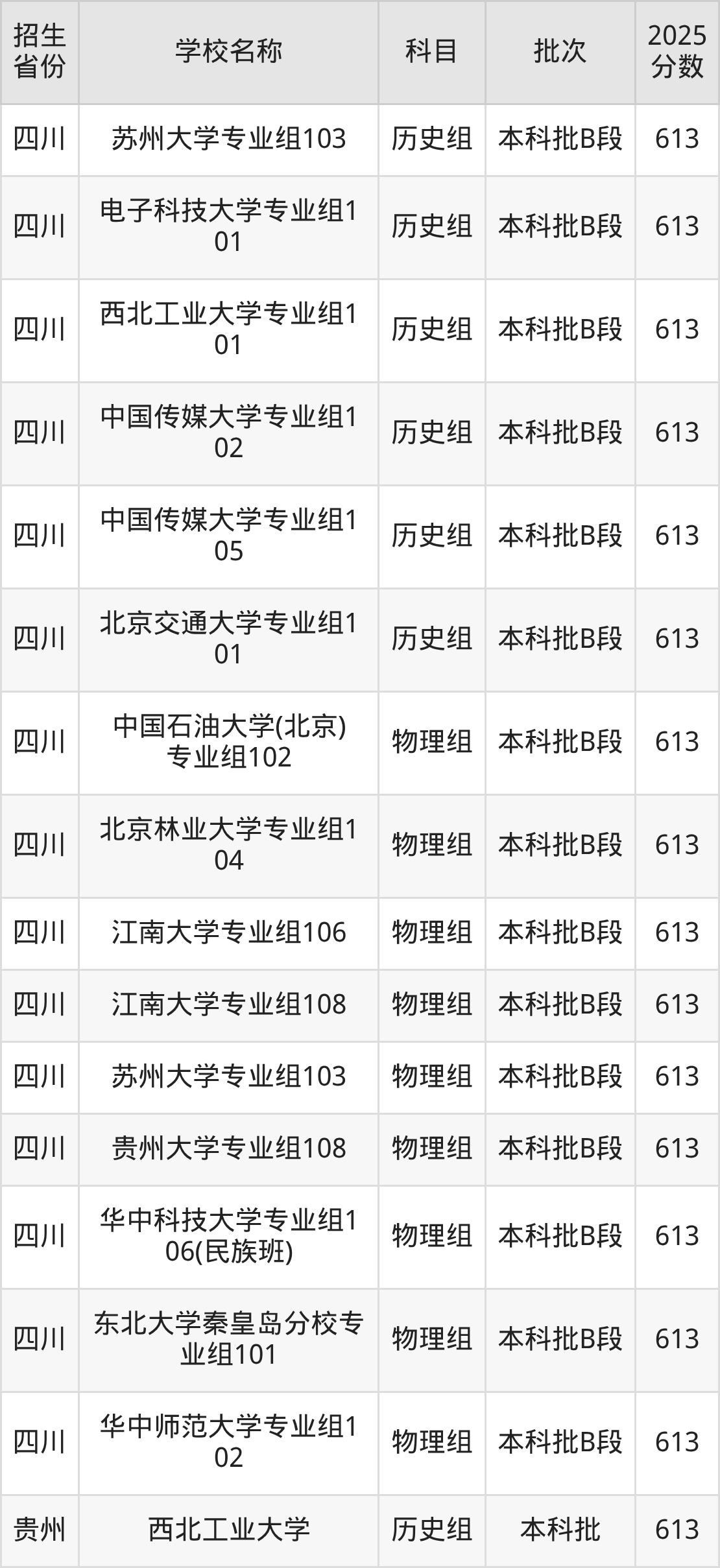 四川省历史组分数线是613分的211大学有:苏州大学、电子科技大学、西北工业大学、中国传媒大学、北京交通大学。