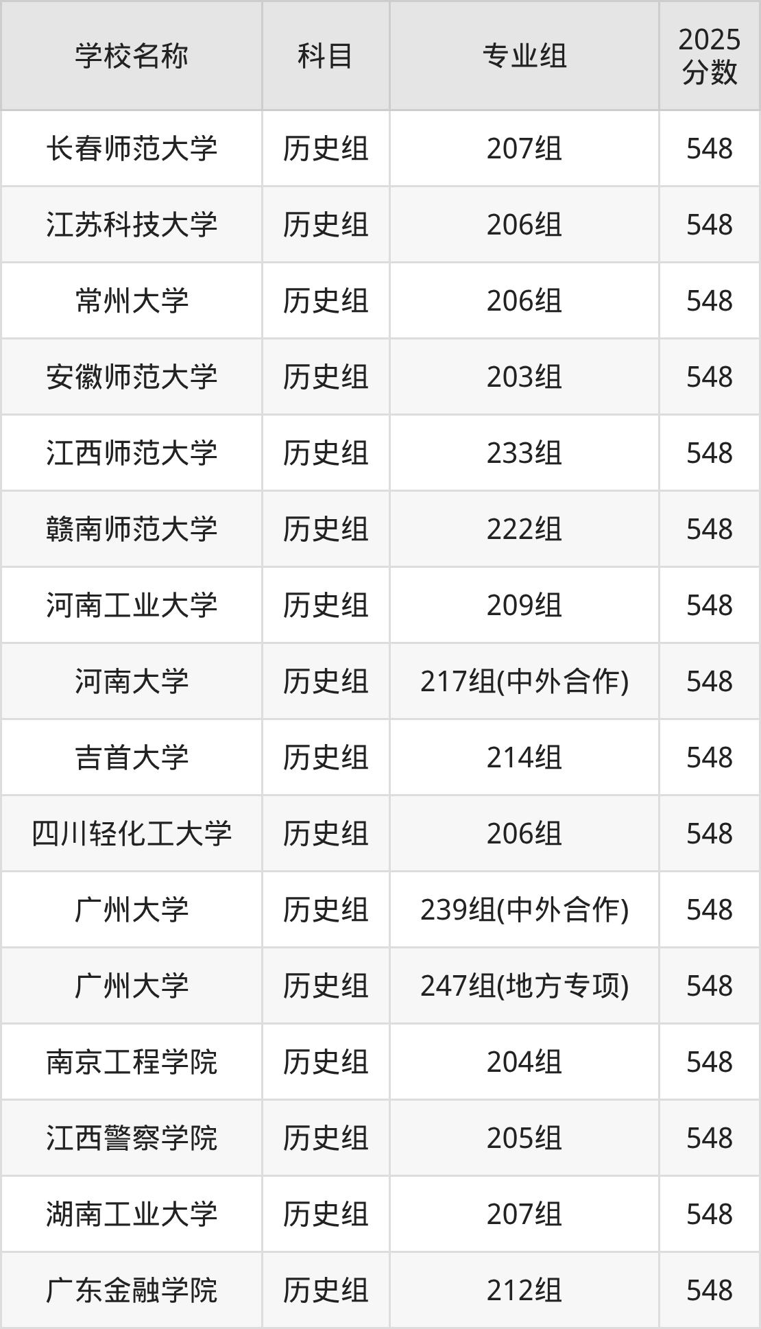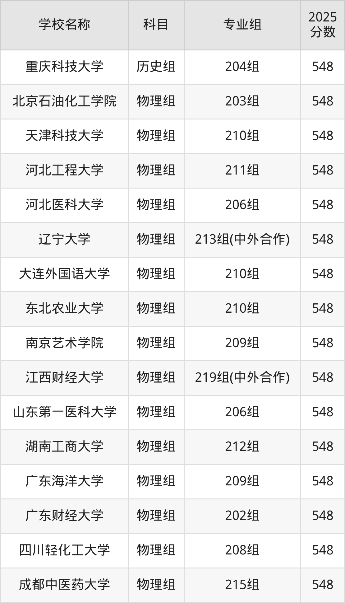 广东高考录取分数线在548分左右的公办院校专业组一共有38个,其中历史组有:长春师范大学(548分)、江苏科技大学(548分)、常州大学(548分),物理组有:北京石油化工学院(548分)、天津科技大学(548分)、河北工程大学(548分)。