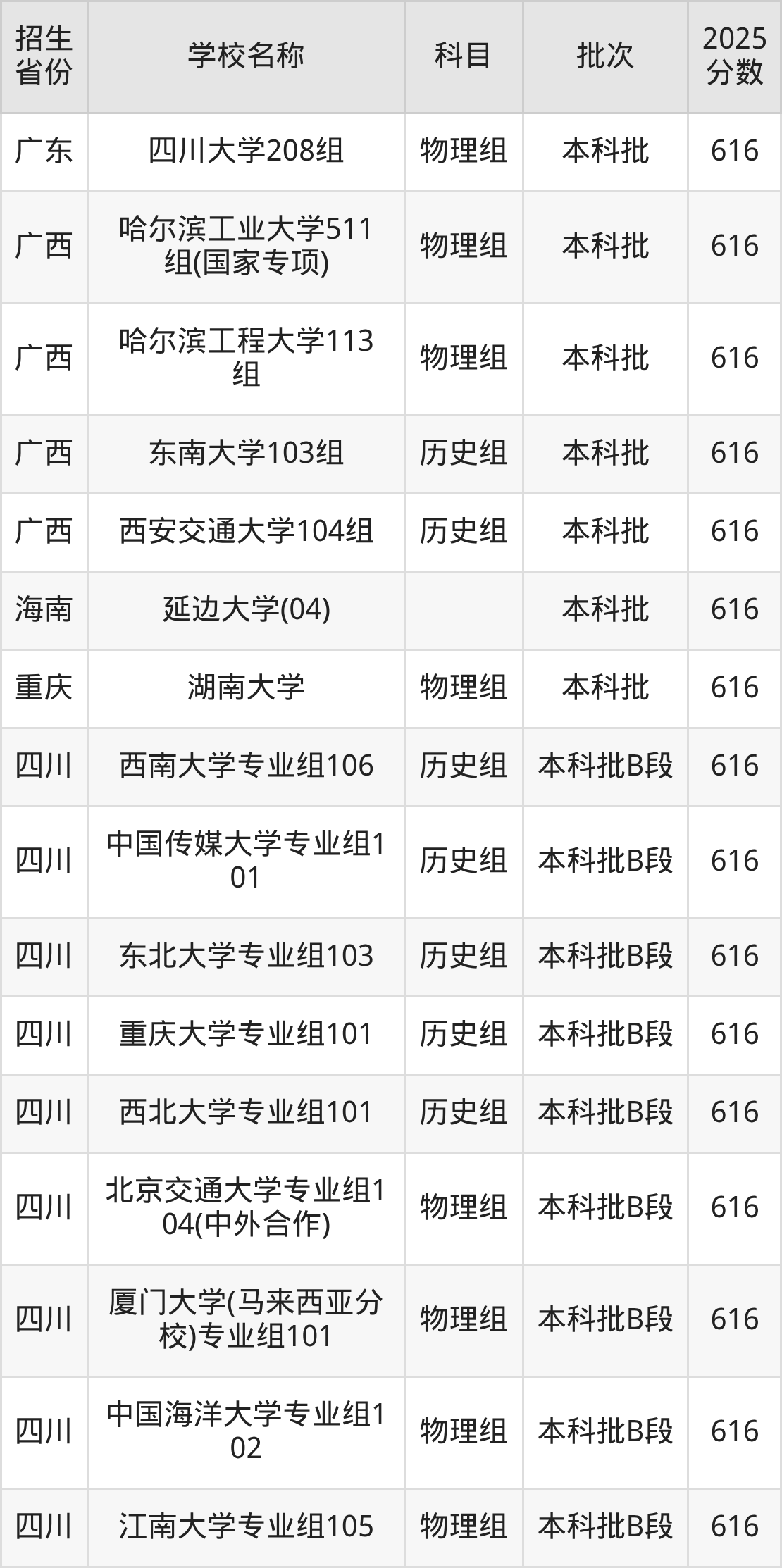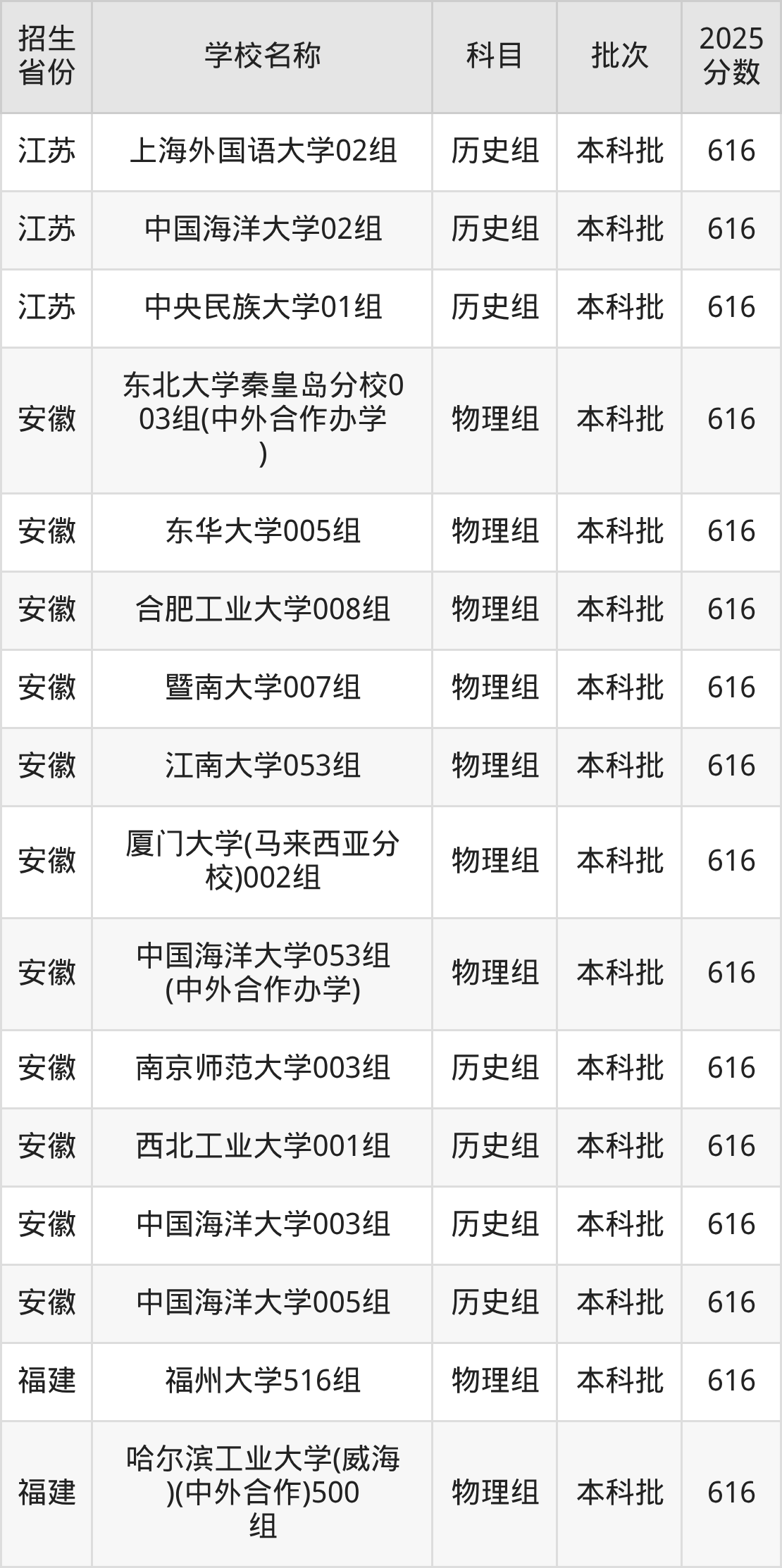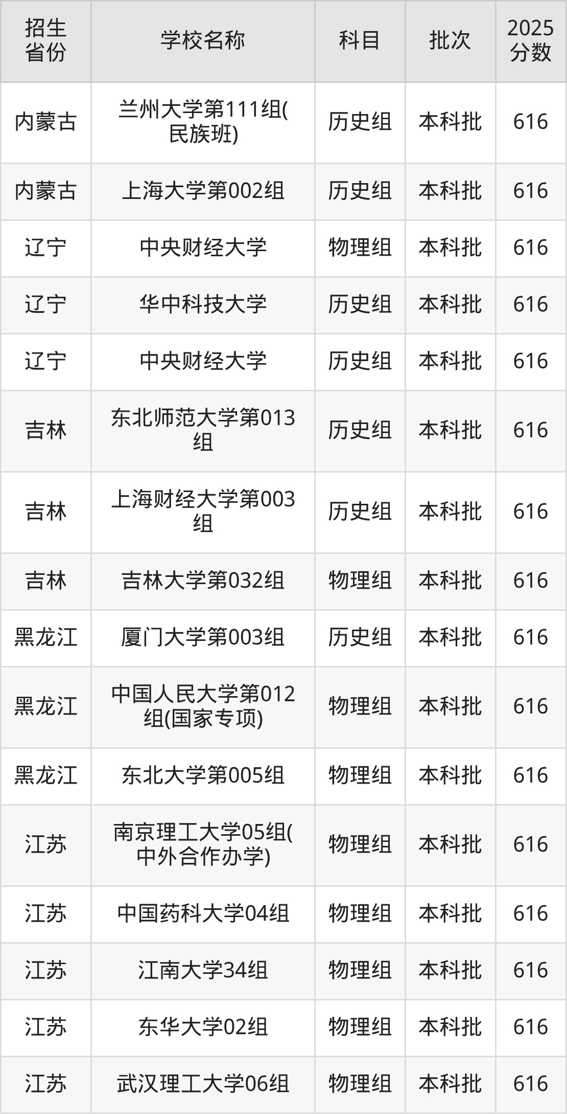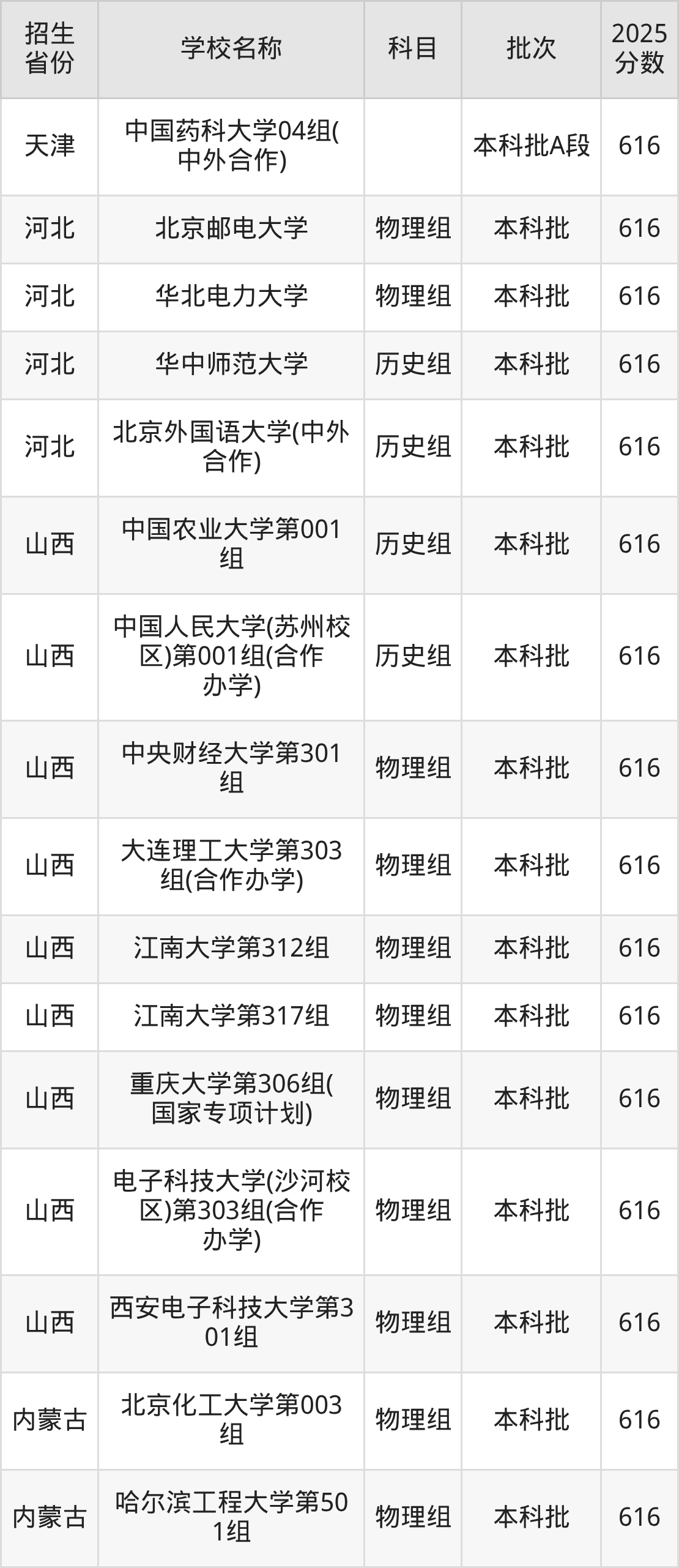 筛选全国各省2025年录取分数线为616分的211大学如下:
