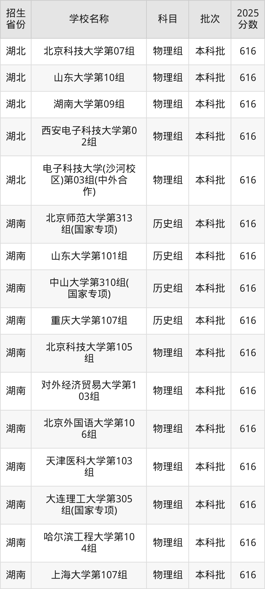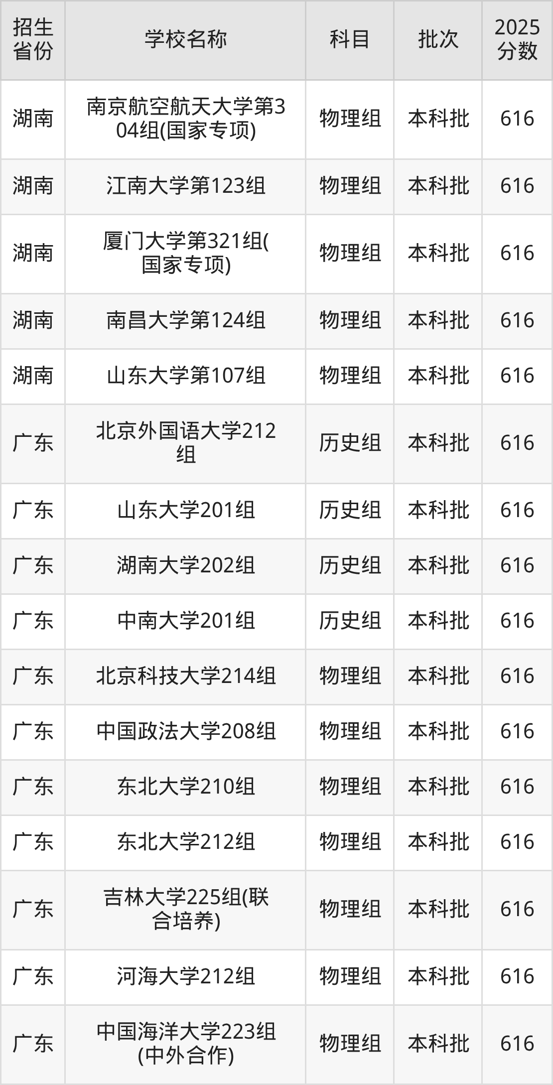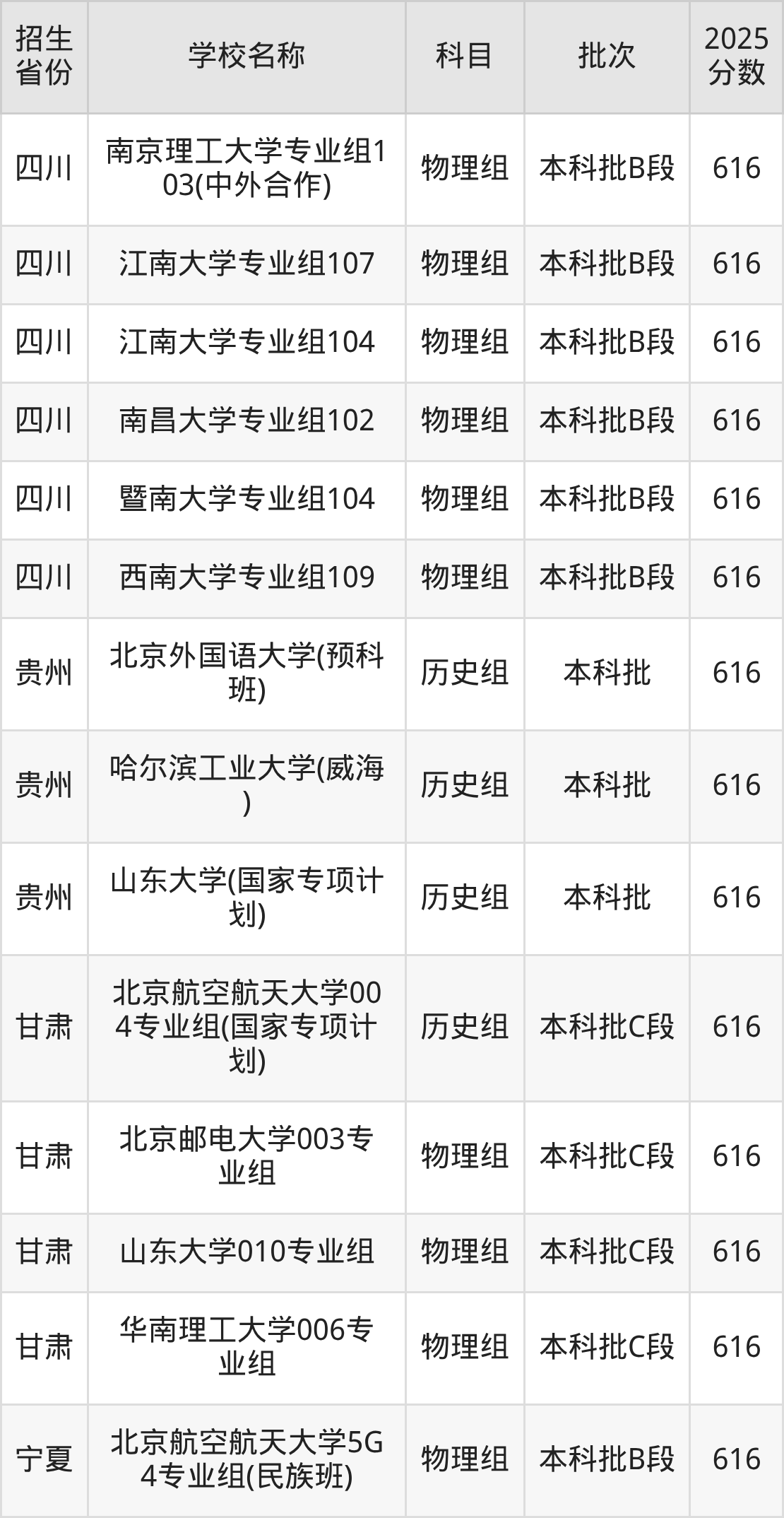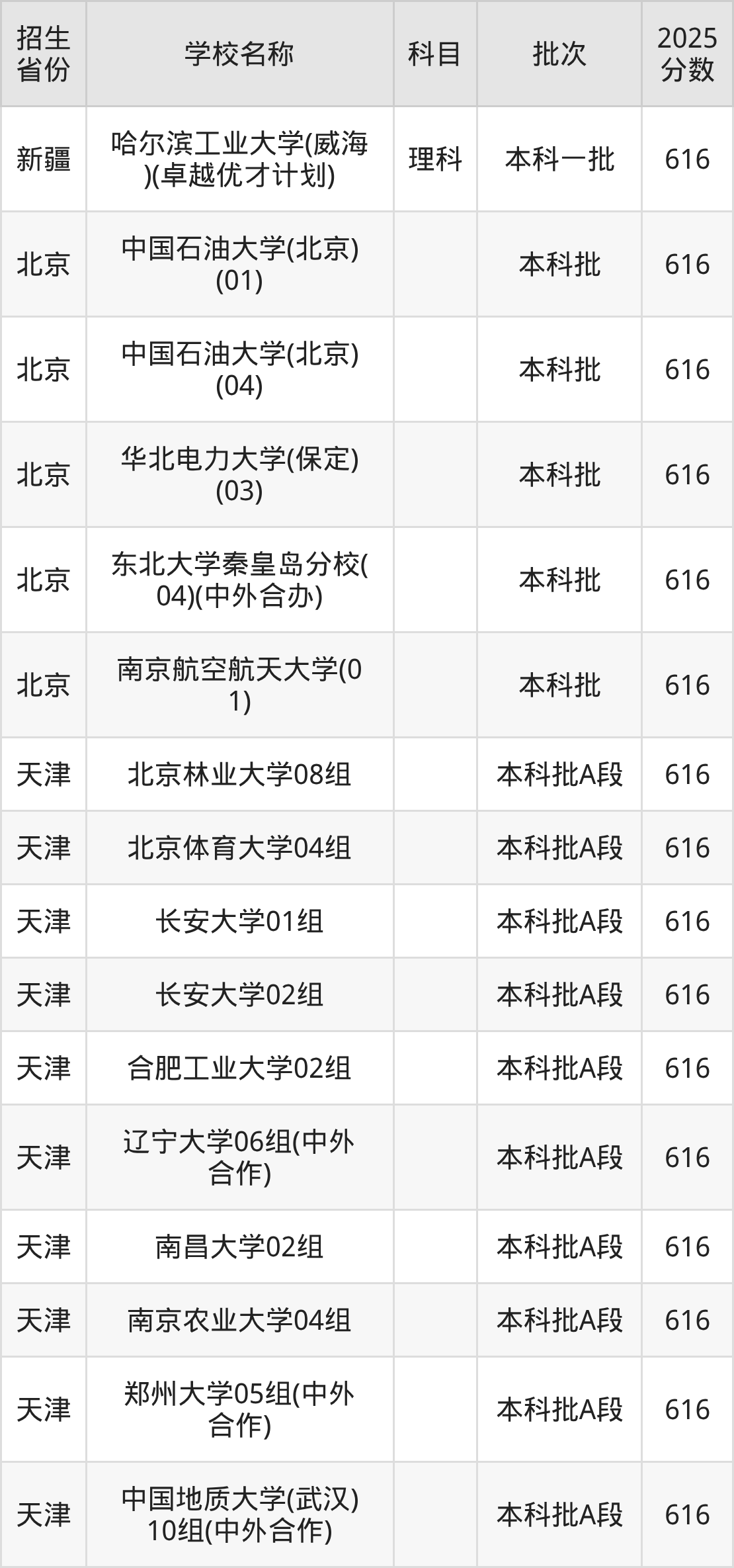 筛选全国各省2025年录取分数线为616分的211大学如下: