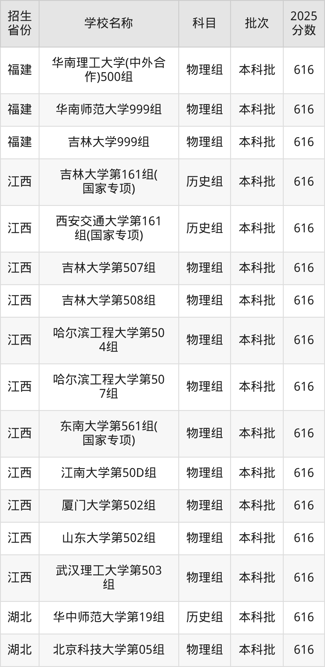 江西省物理组分数线是616分的211大学有:吉林大学、哈尔滨工程大学、东南大学、江南大学、厦门大学、山东大学、武汉理工大学。