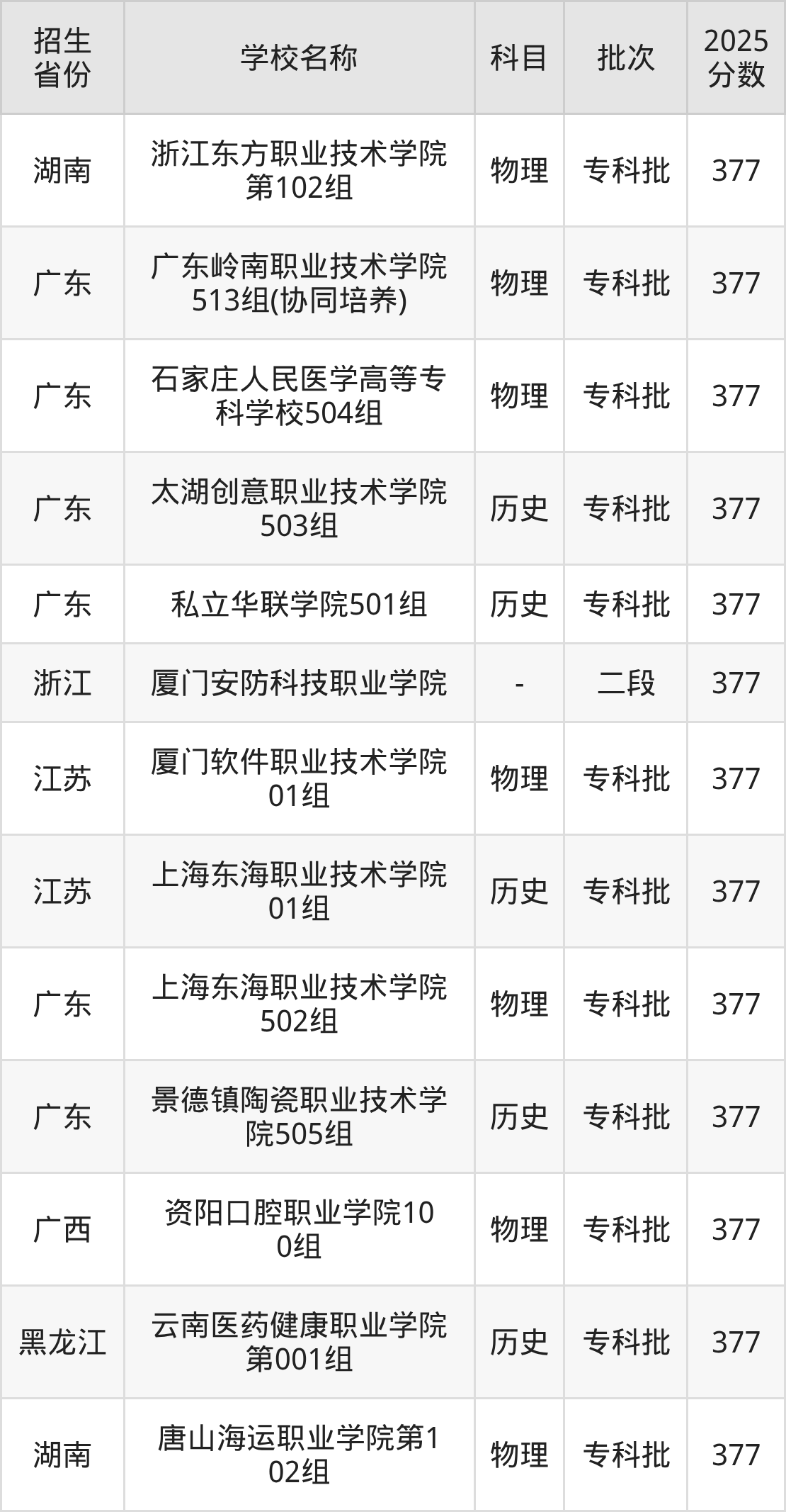 广东省物理组分数线是377分的民办专科学校有:广东岭南职业技术学院、石家庄人民医学高等专科学校、上海东海职业技术学院。