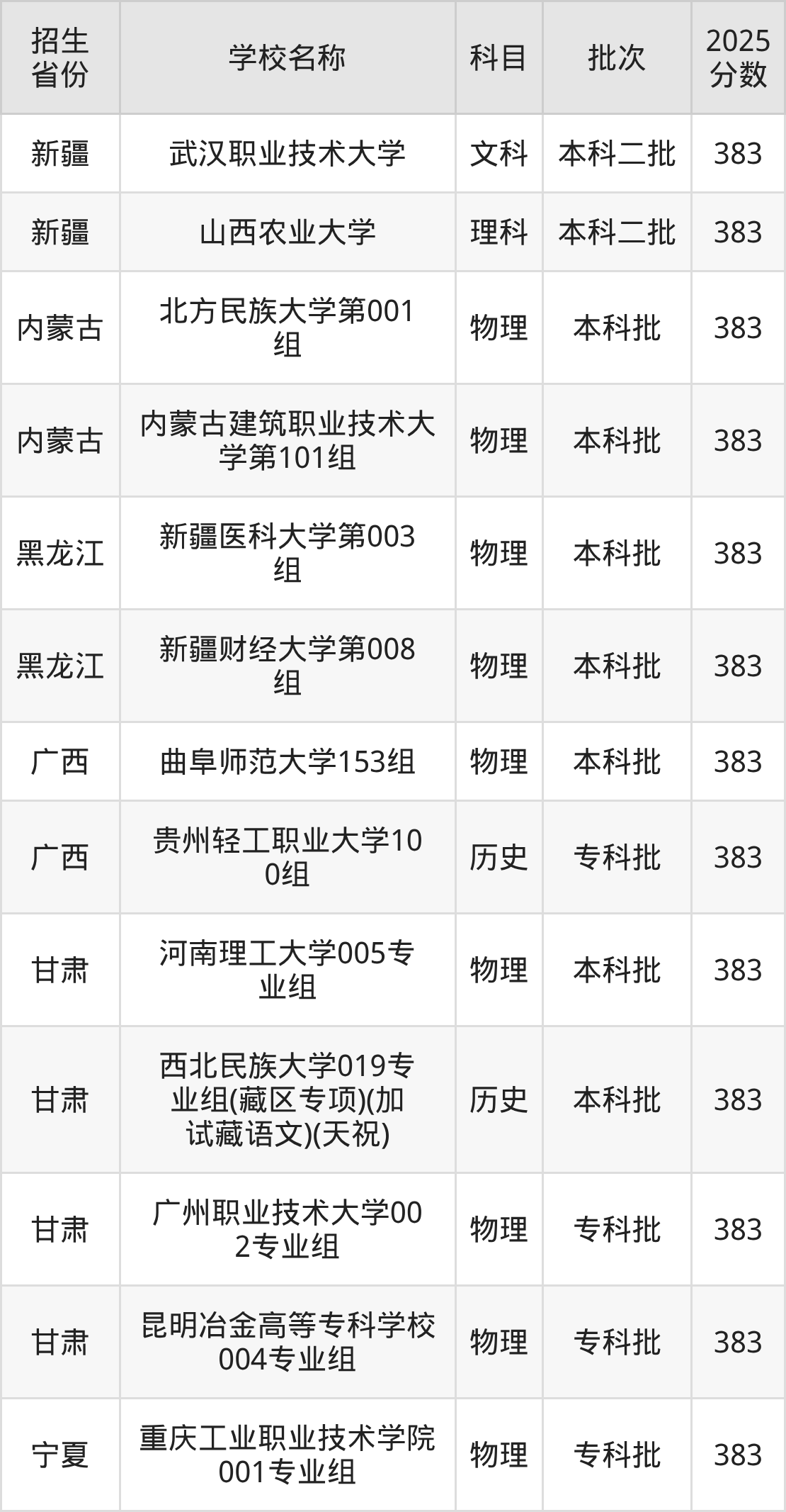 筛选全国各省2025年录取分数线为383分的重点大学如下: