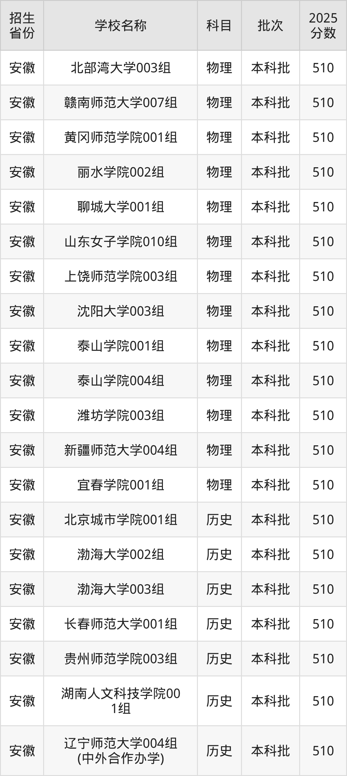 安徽省物理组分数线是510分的文科大学有:北部湾大学、赣南师范大学、黄冈师范学院、丽水学院、聊城大学、山东女子学院、上饶师范学院、沈阳大学、泰山学院、潍坊学院。
