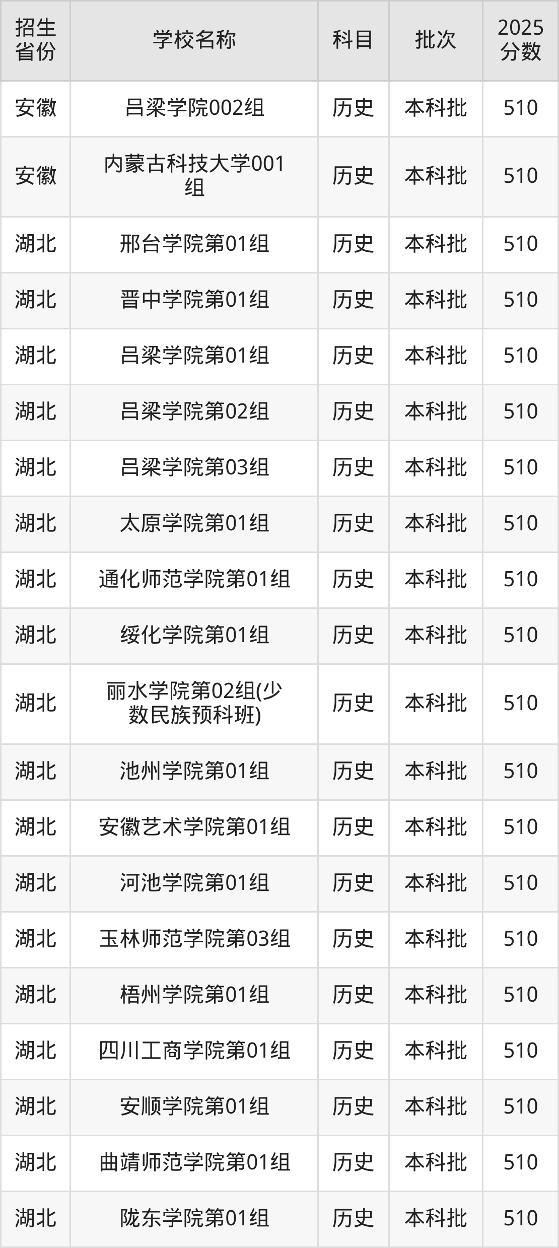 湖北省历史组分数线是510分的文科大学有:邢台学院、晋中学院、吕梁学院、太原学院、通化师范学院、绥化学院、丽水学院、池州学院、安徽艺术学院、河池学院。