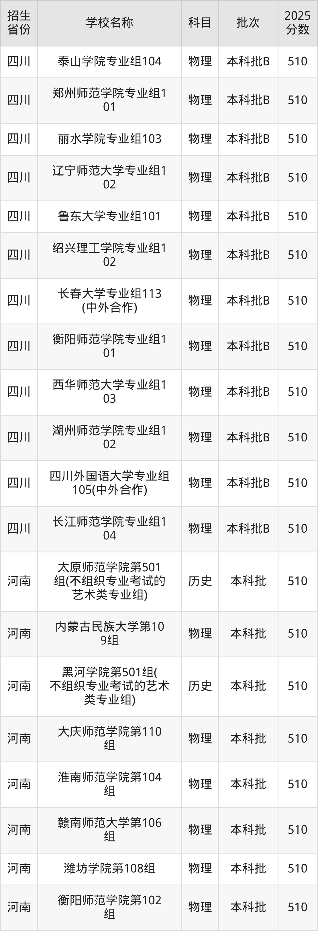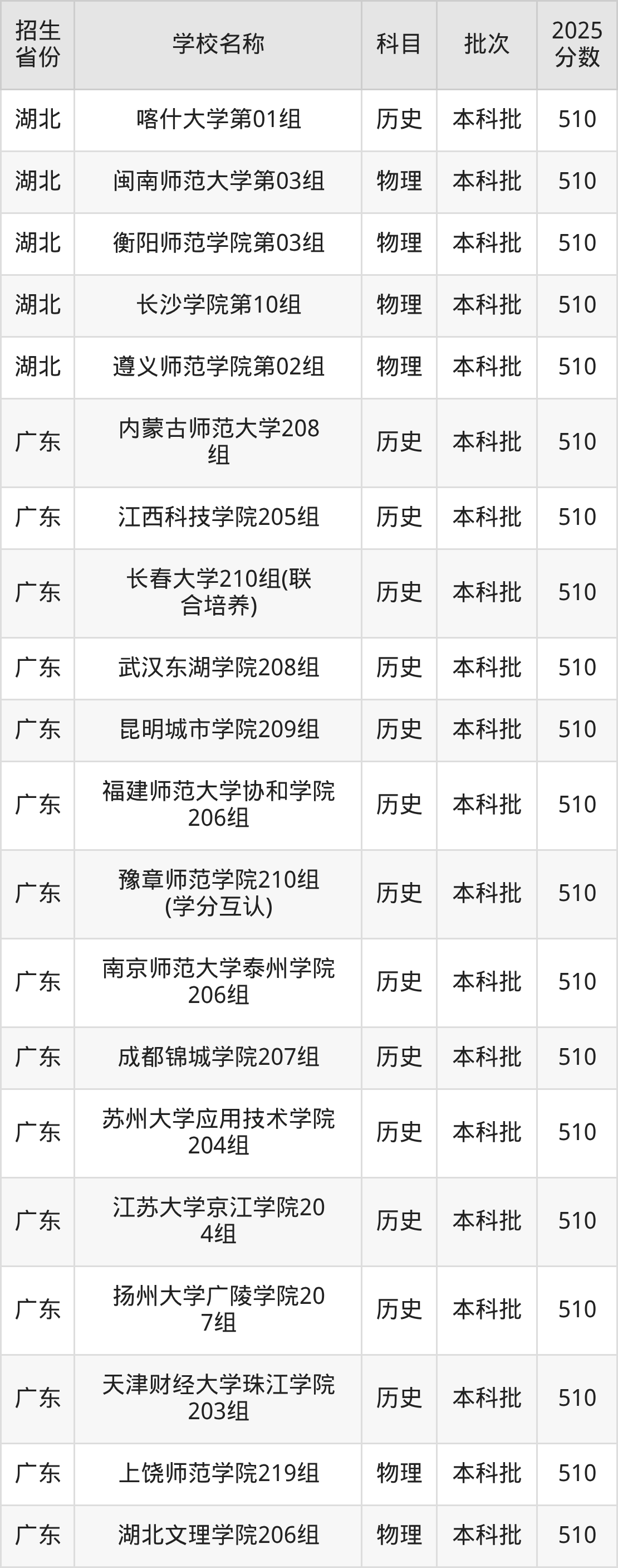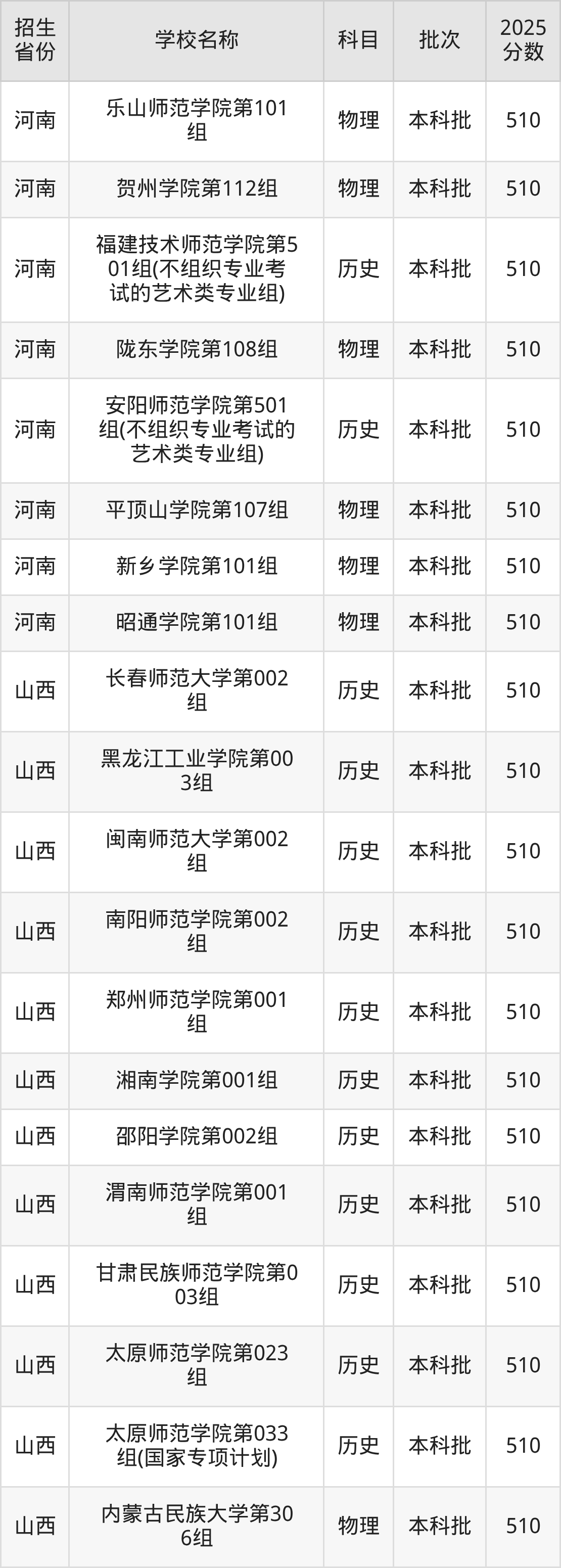 筛选全国各省2025年录取分数线为510分的文科大学如下: