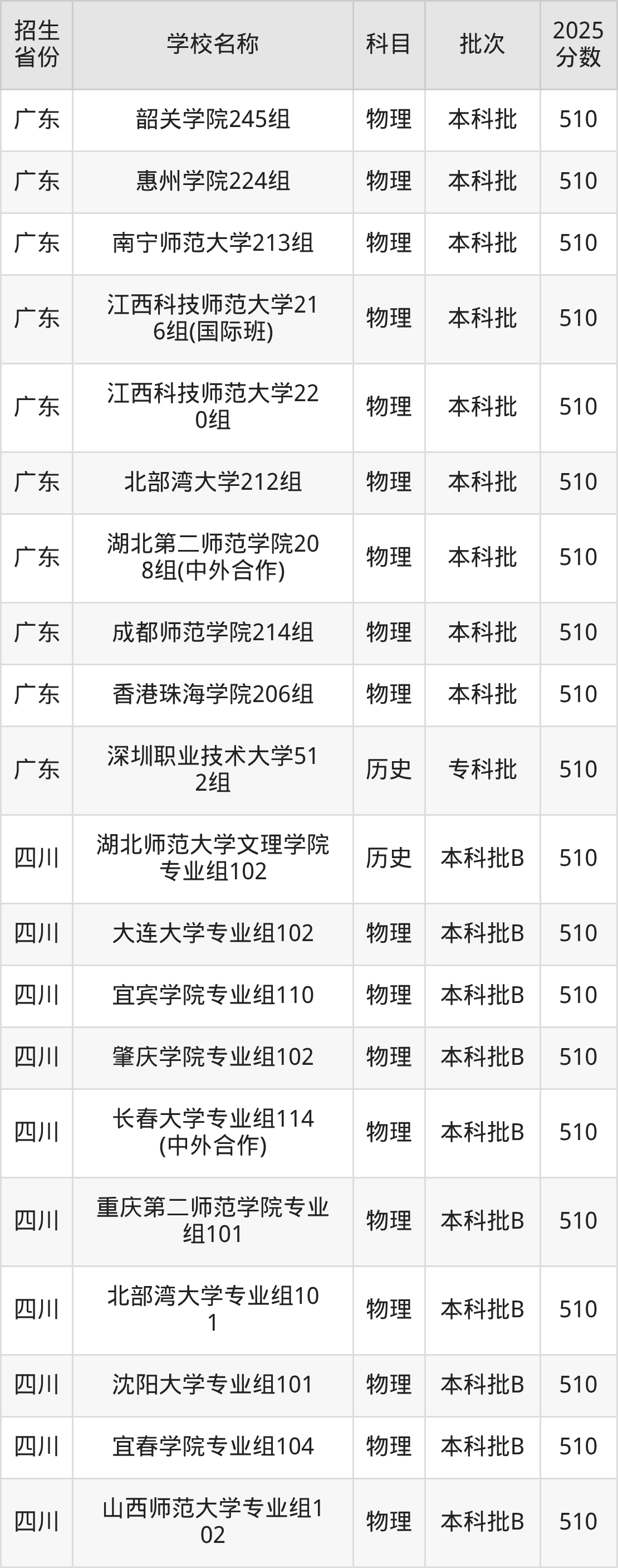 广东省物理组分数线是510分的文科大学有:上饶师范学院、湖北文理学院、韶关学院、惠州学院、南宁师范大学、江西科技师范大学、北部湾大学、湖北第二师范学院、成都师范学院、香港珠海学院。