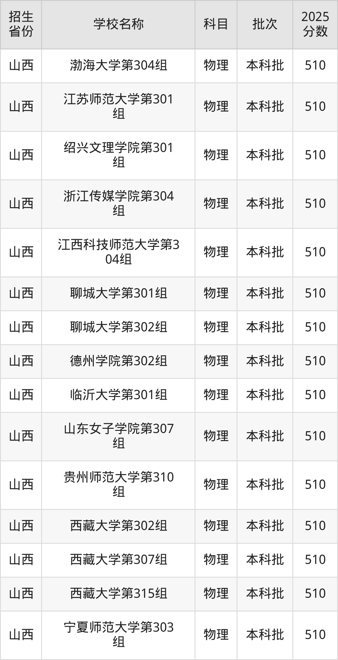 山西省物理组分数线是510分的文科大学有:内蒙古民族大学、渤海大学、江苏师范大学、绍兴大学、浙江传媒学院、江西科技师范大学、聊城大学、德州学院、临沂大学、山东女子学院。