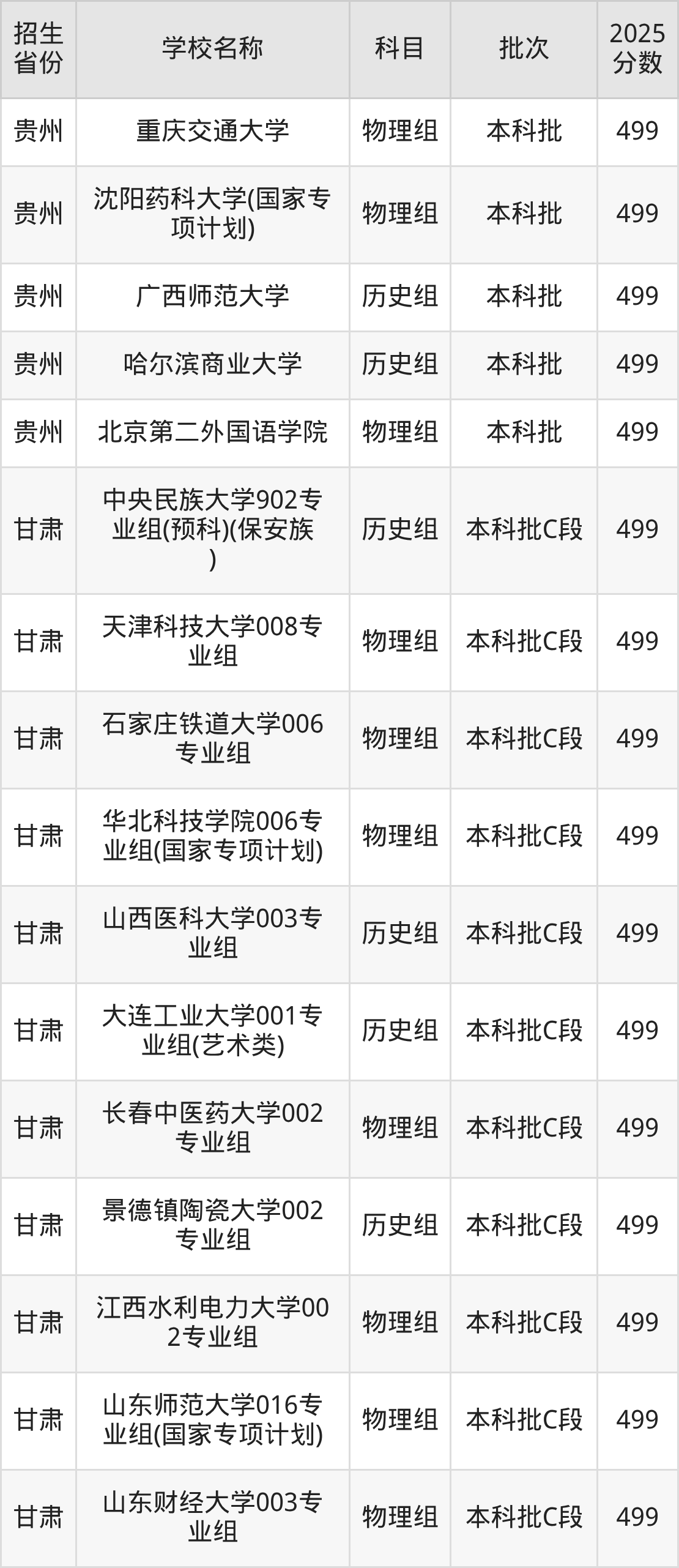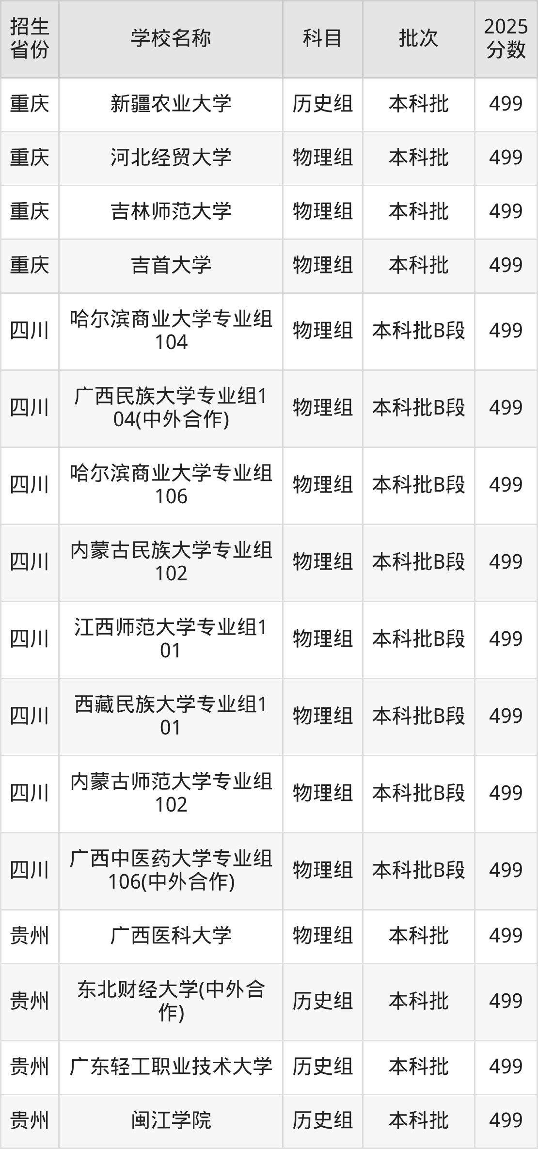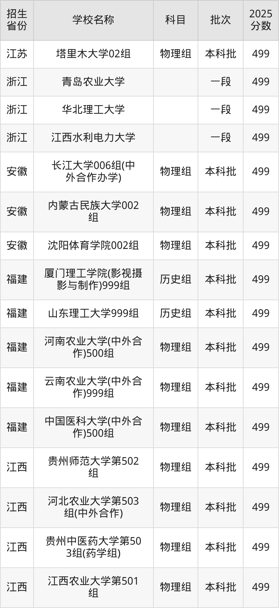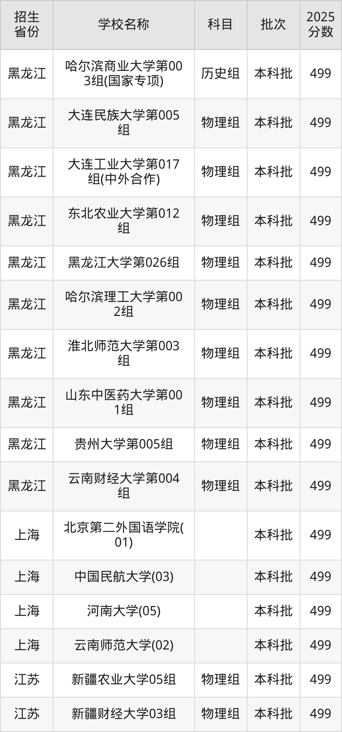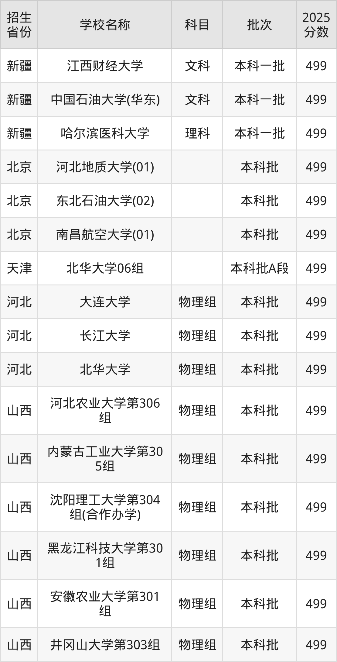 筛选全国各省2025年录取分数线为499分的重点大学如下: