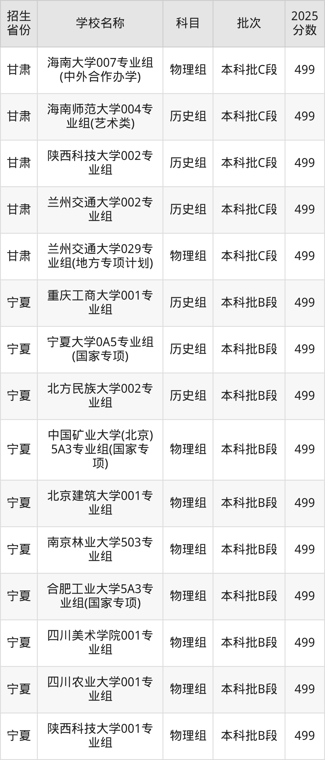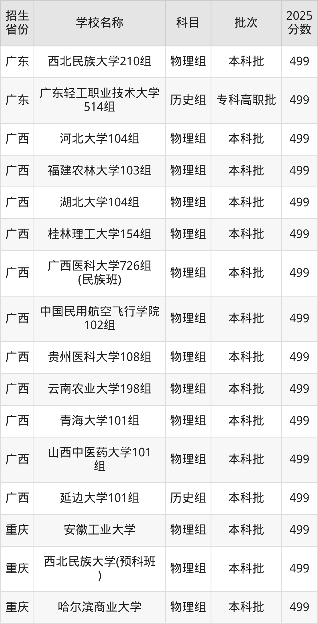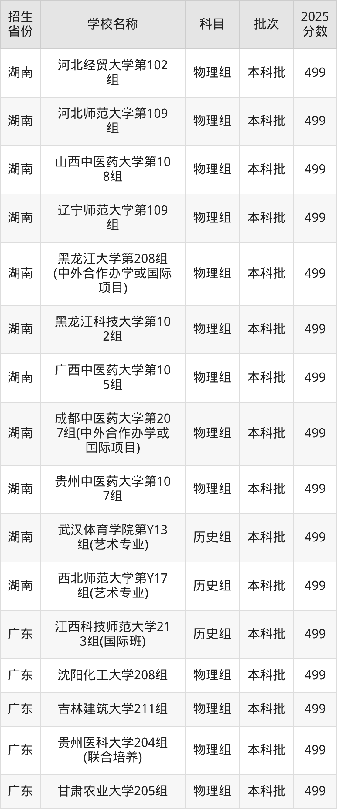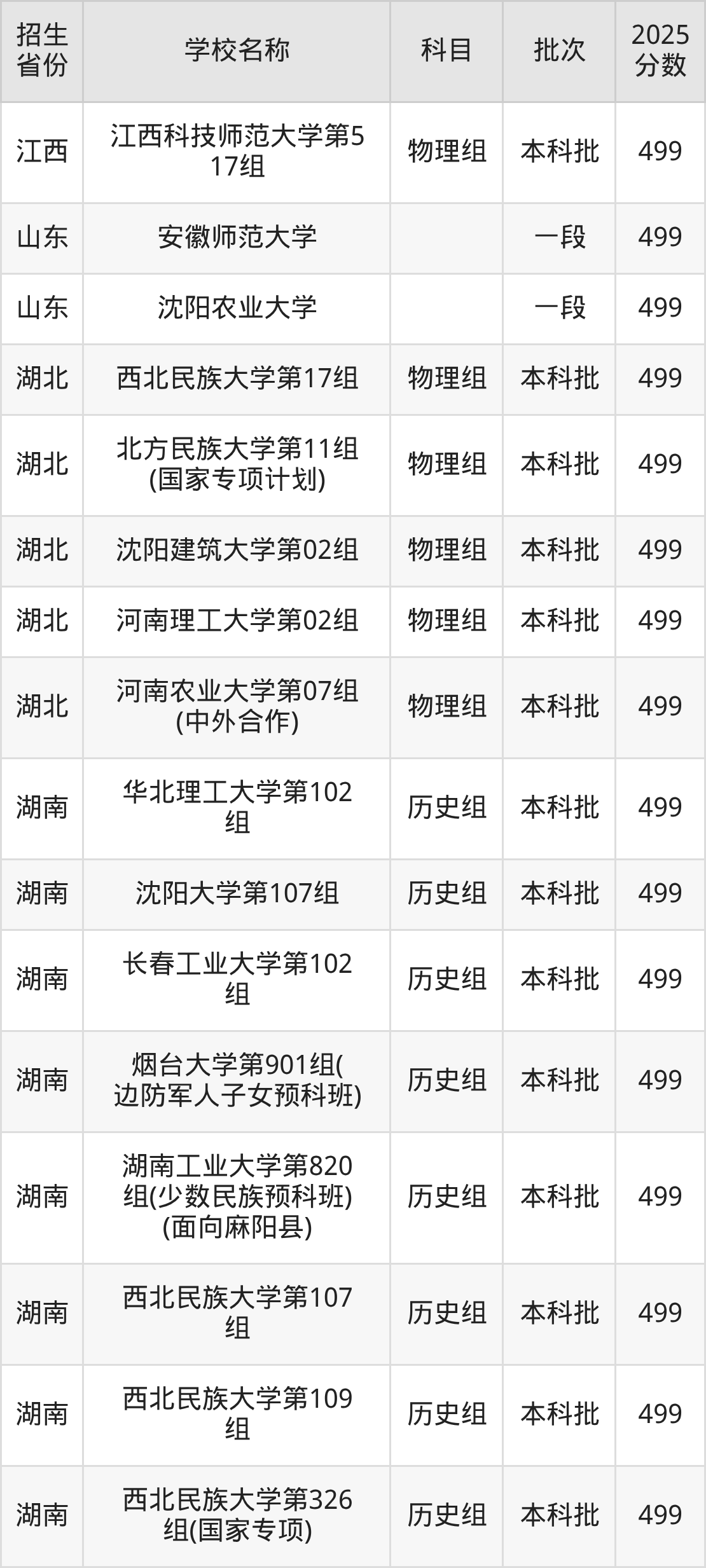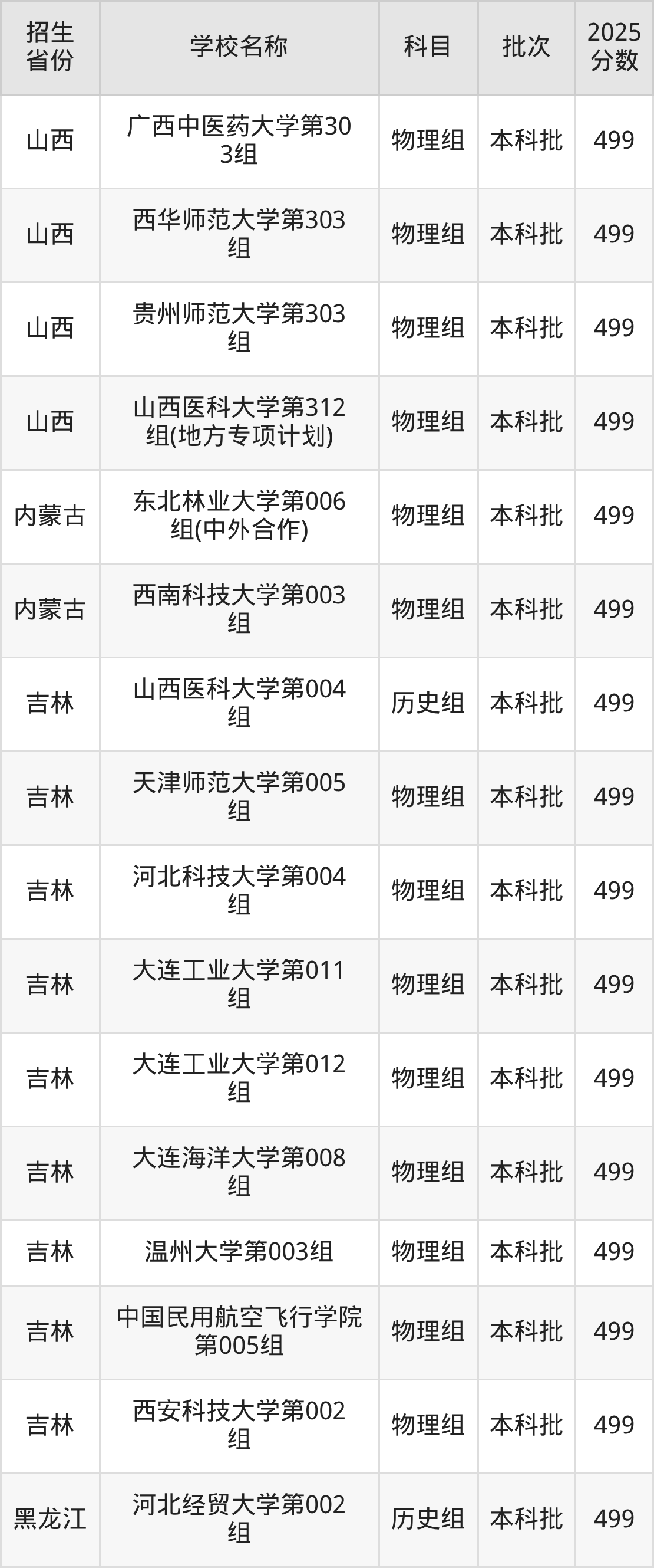 筛选全国各省2025年录取分数线为499分的重点大学如下: