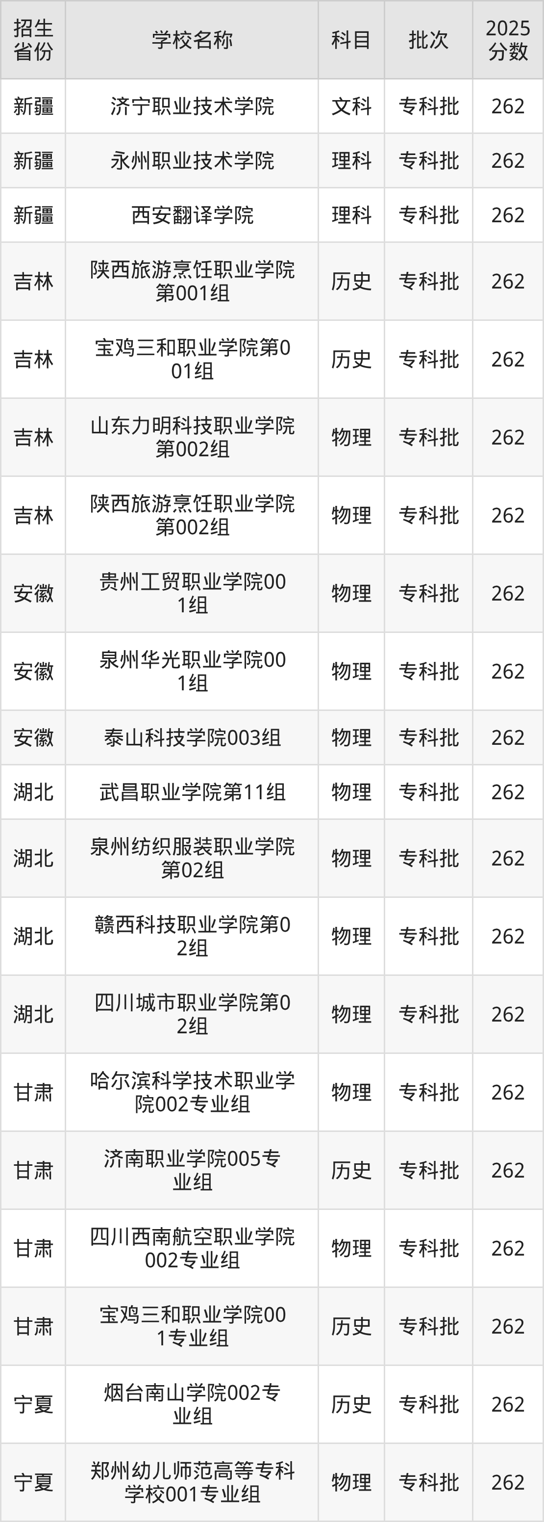 甘肃省历史组分数线是262分的文科大学有:济南职业学院、宝鸡三和职业学院。