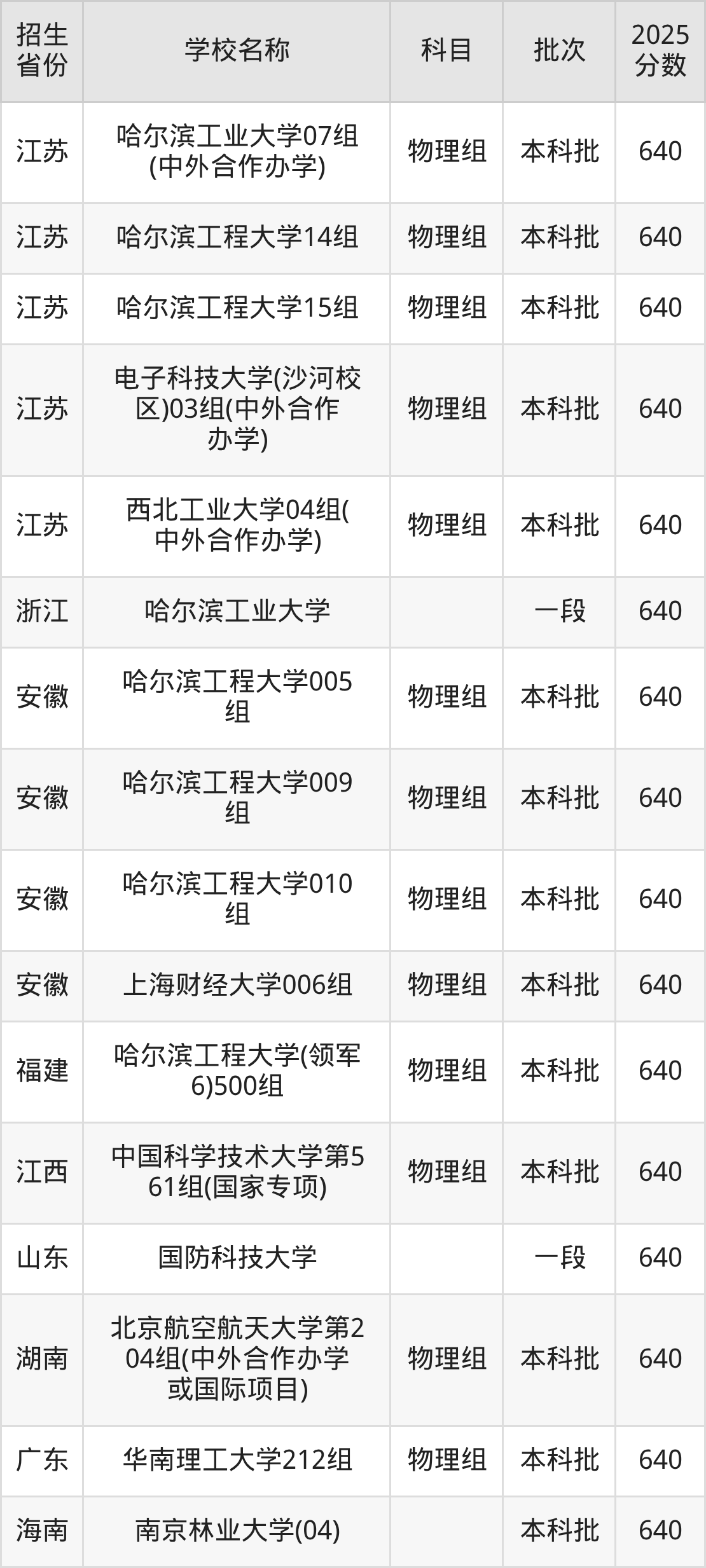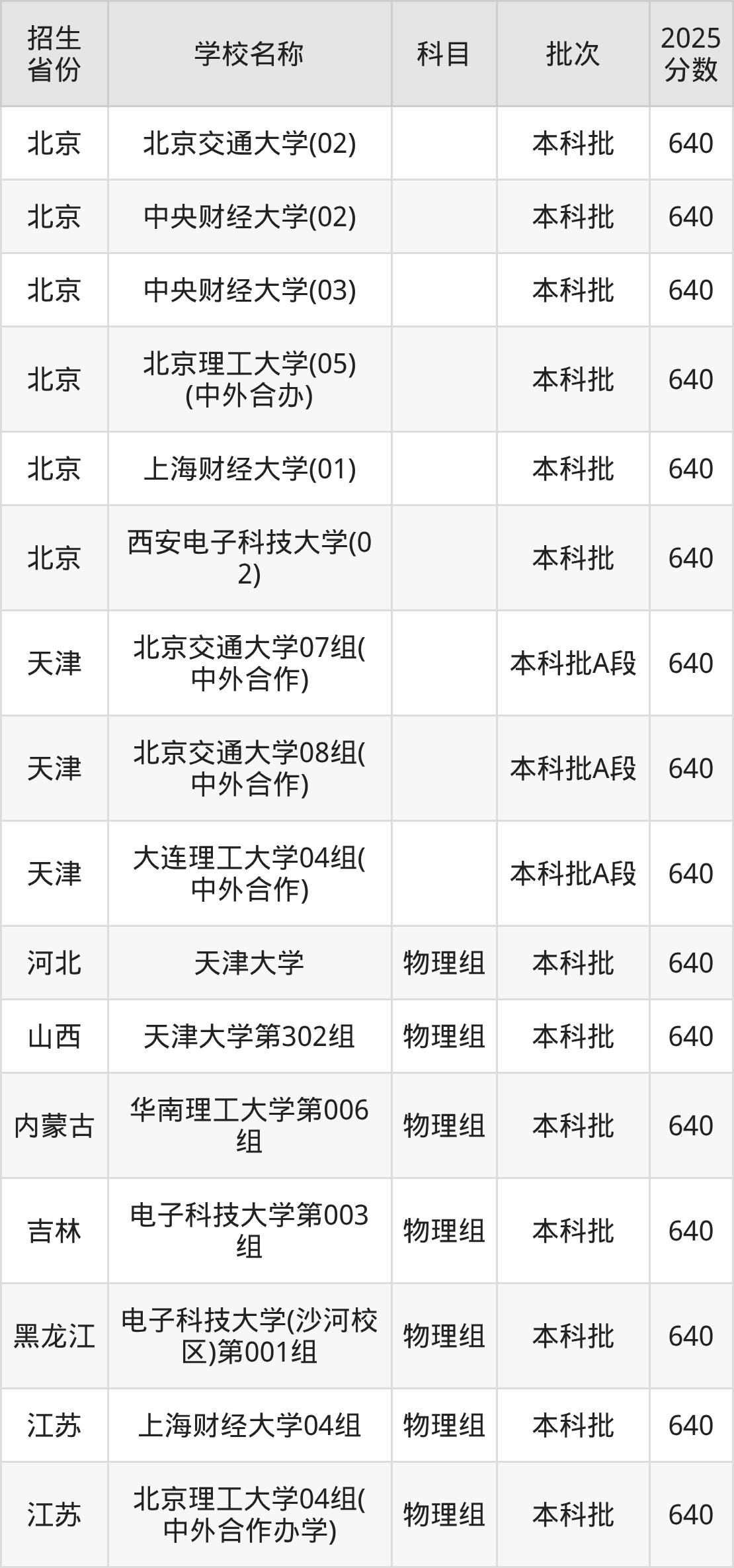 筛选全国各省2025年录取分数线为640分的理科大学如下: