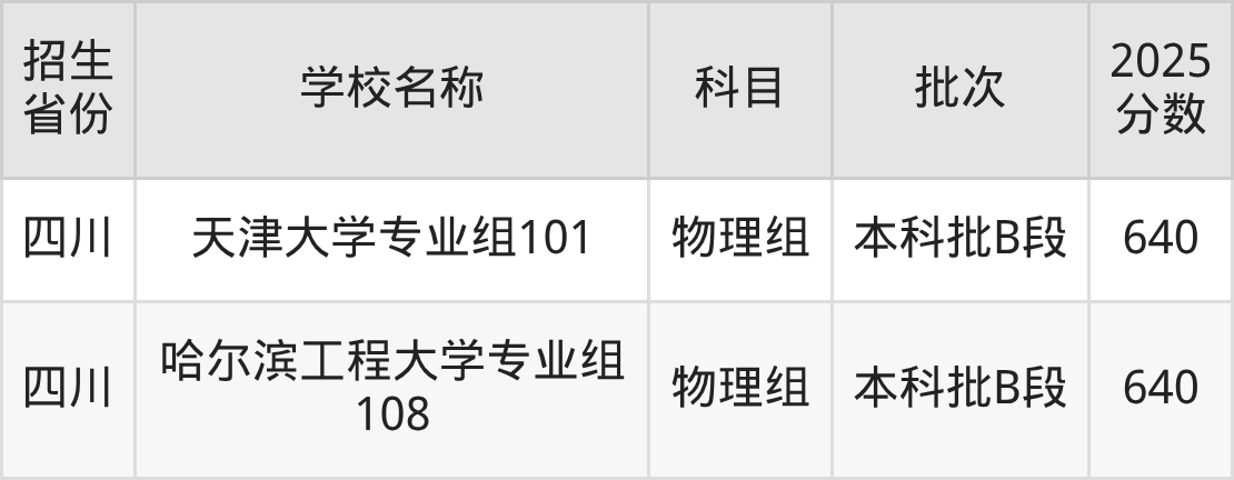 四川省物理组分数线是640分的理科大学有:天津大学、哈尔滨工程大学。