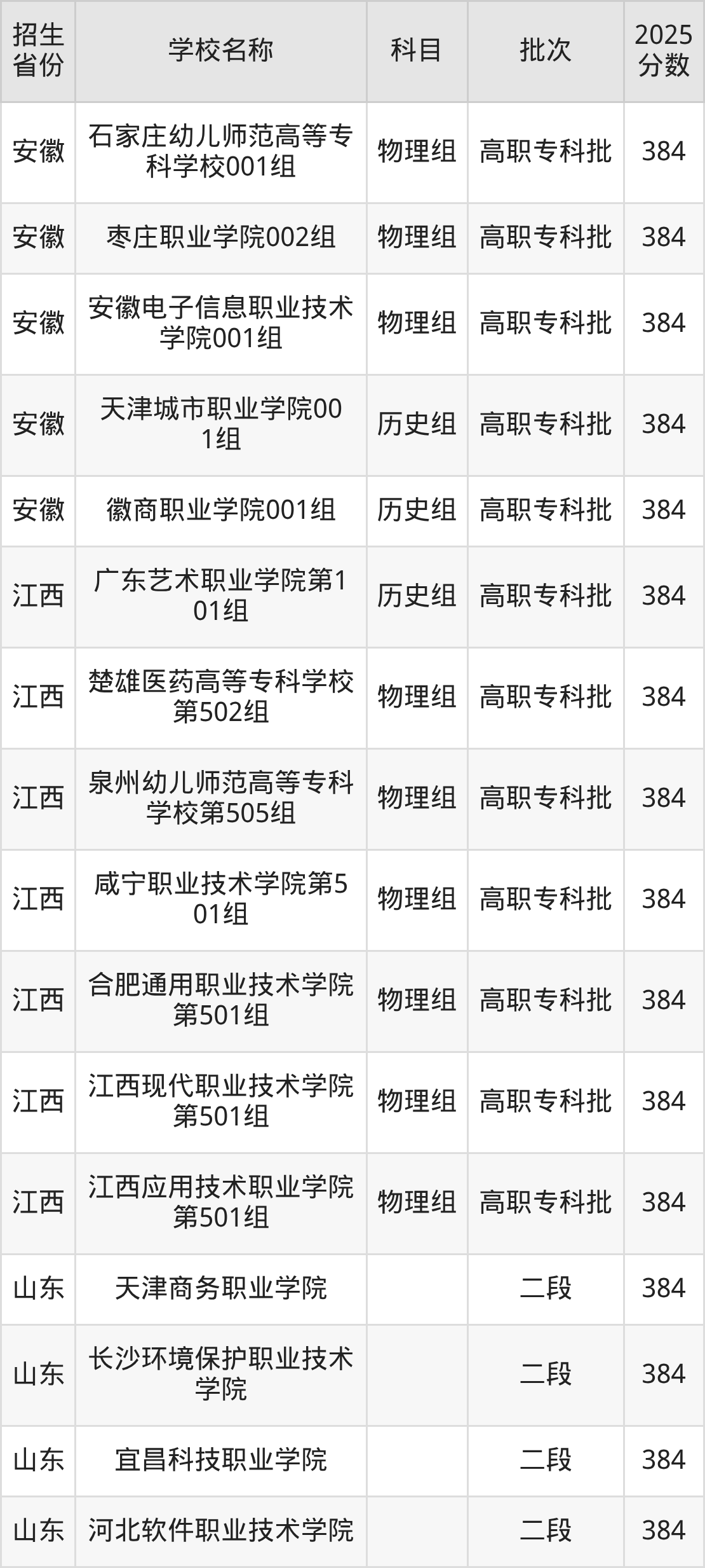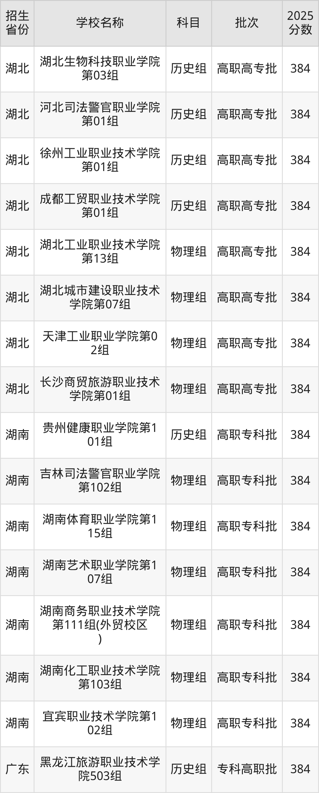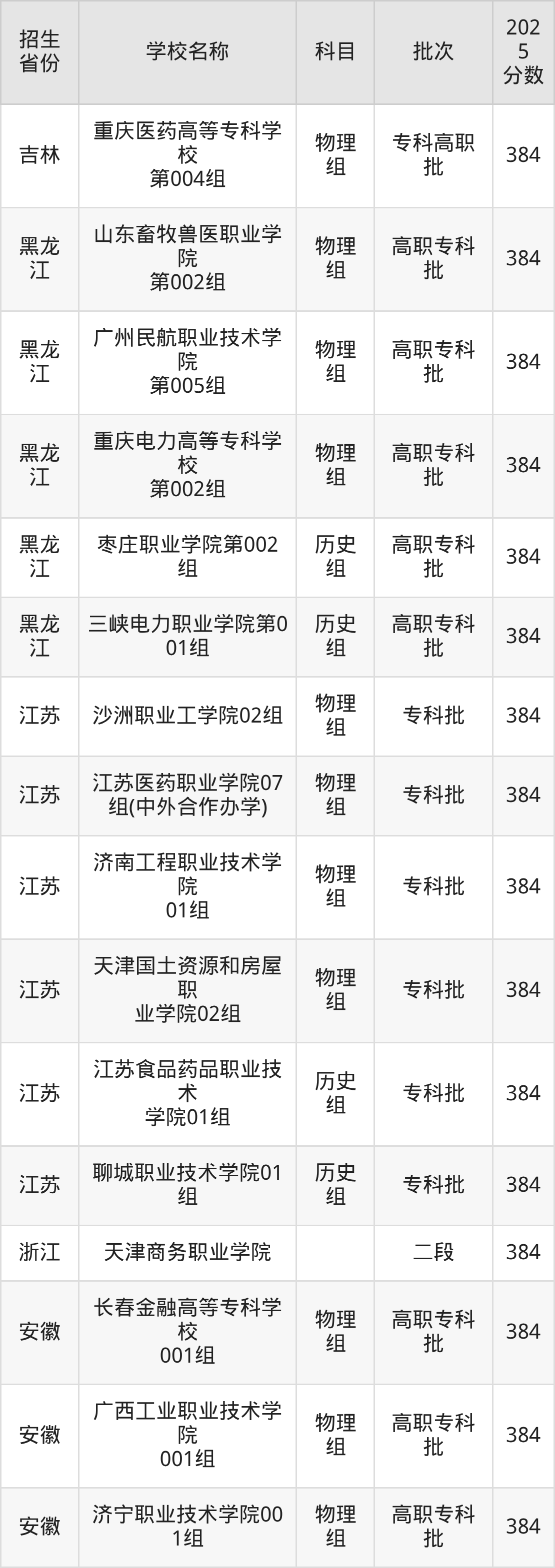 筛选全国各省2025年录取分数线为384分的公办专科大学如下: