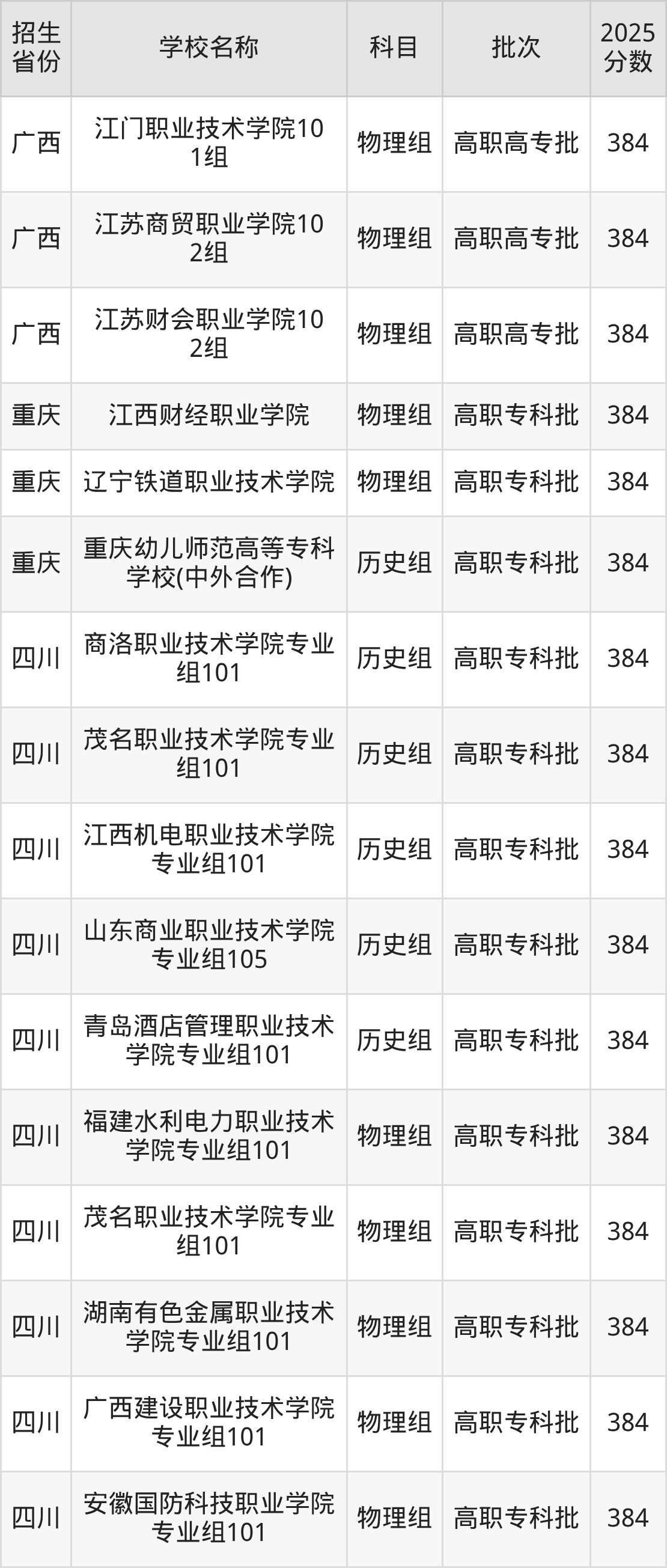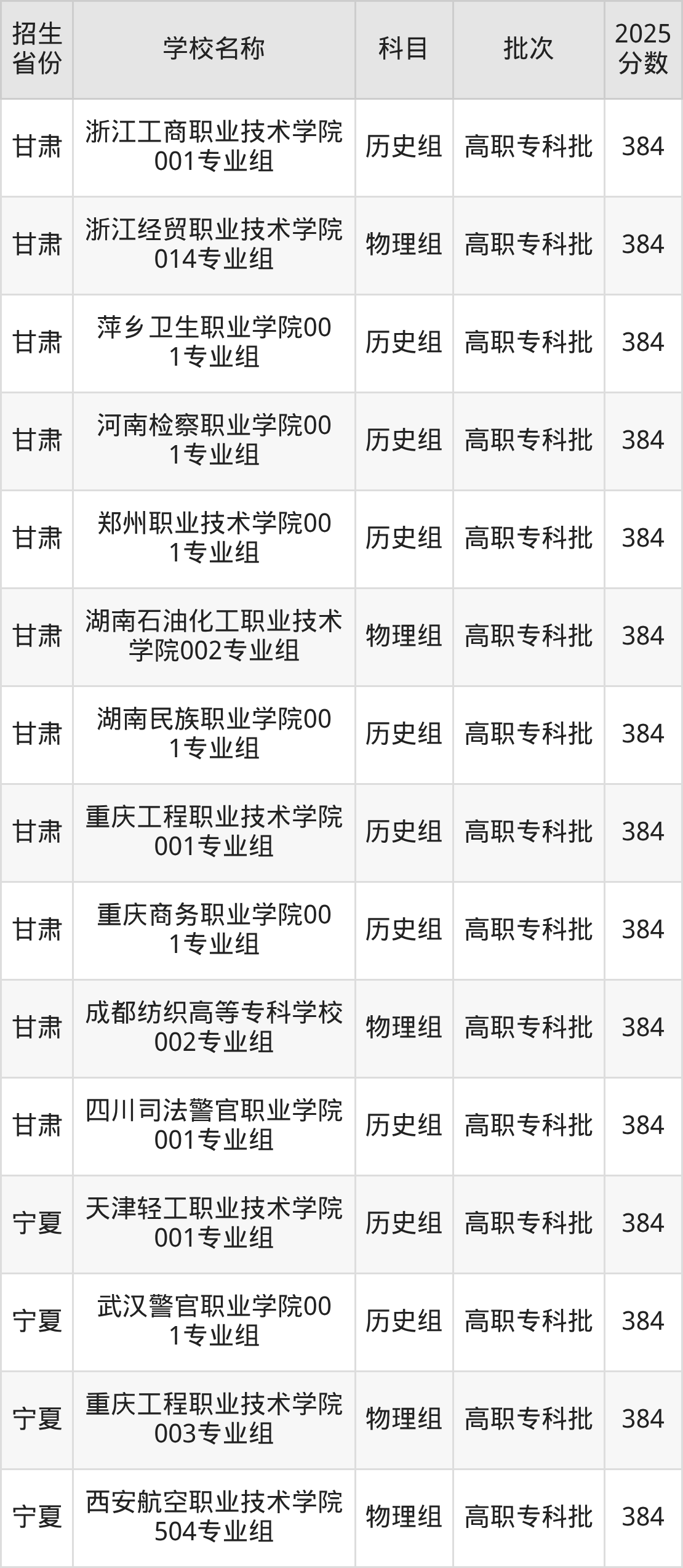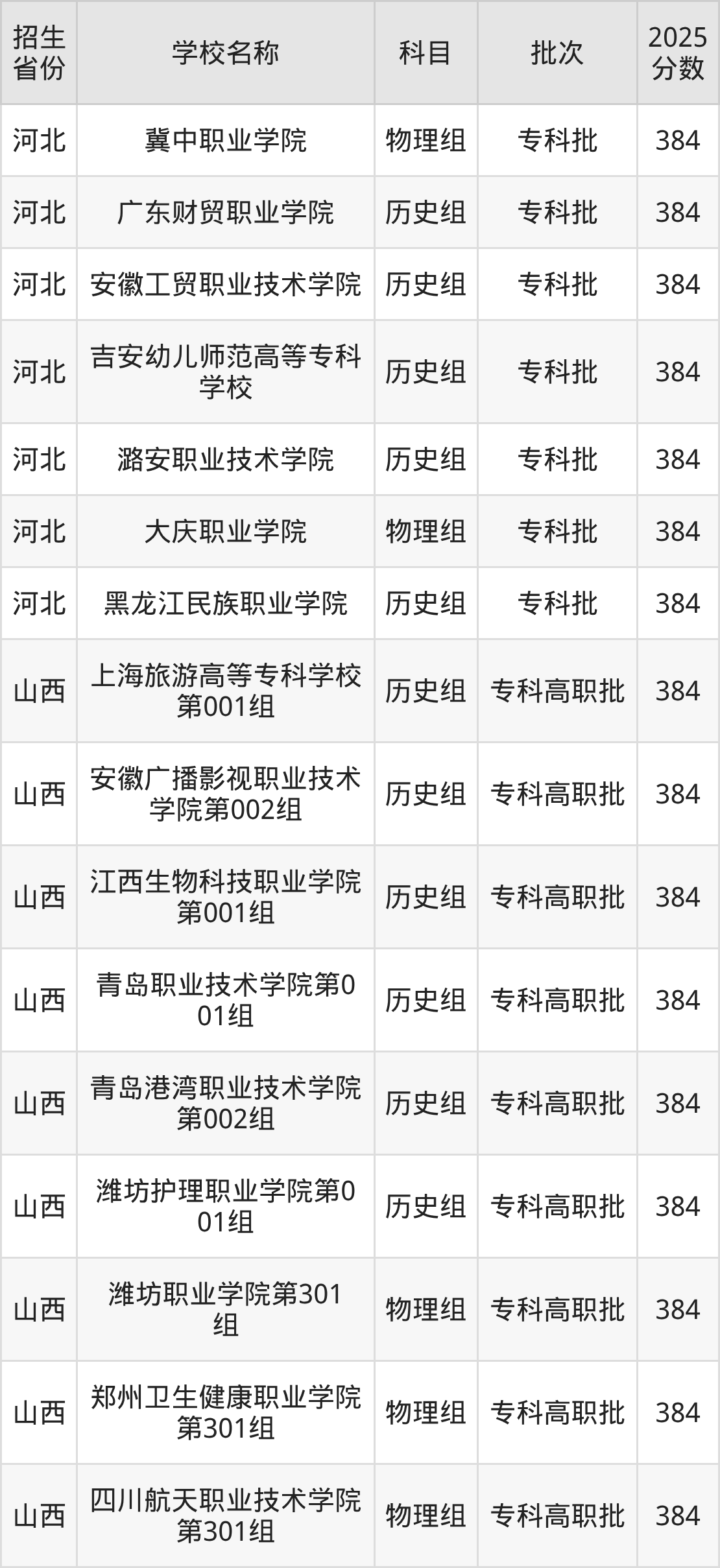 筛选全国各省2025年录取分数线为384分的公办专科大学如下: