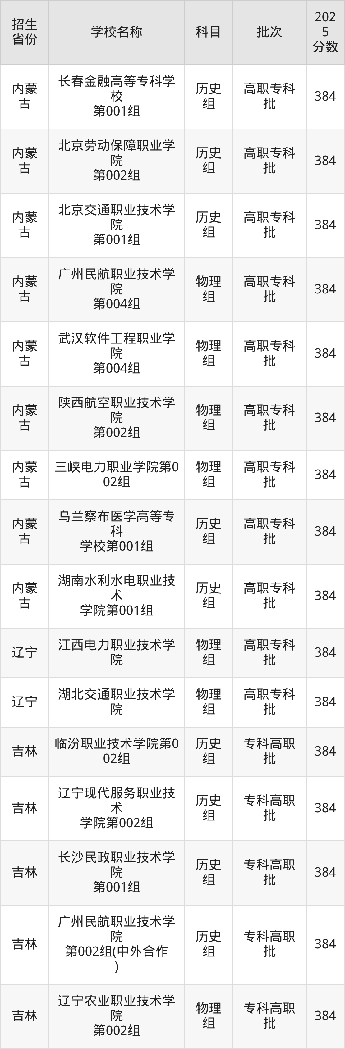 内蒙古自治区历史组分数线是384分的公办专科大学有:长春金融高等专科学校、北京劳动保障职业学院、北京交通职业技术学院、乌兰察布医学高等专科学校、湖南水利水电职业技术学院。