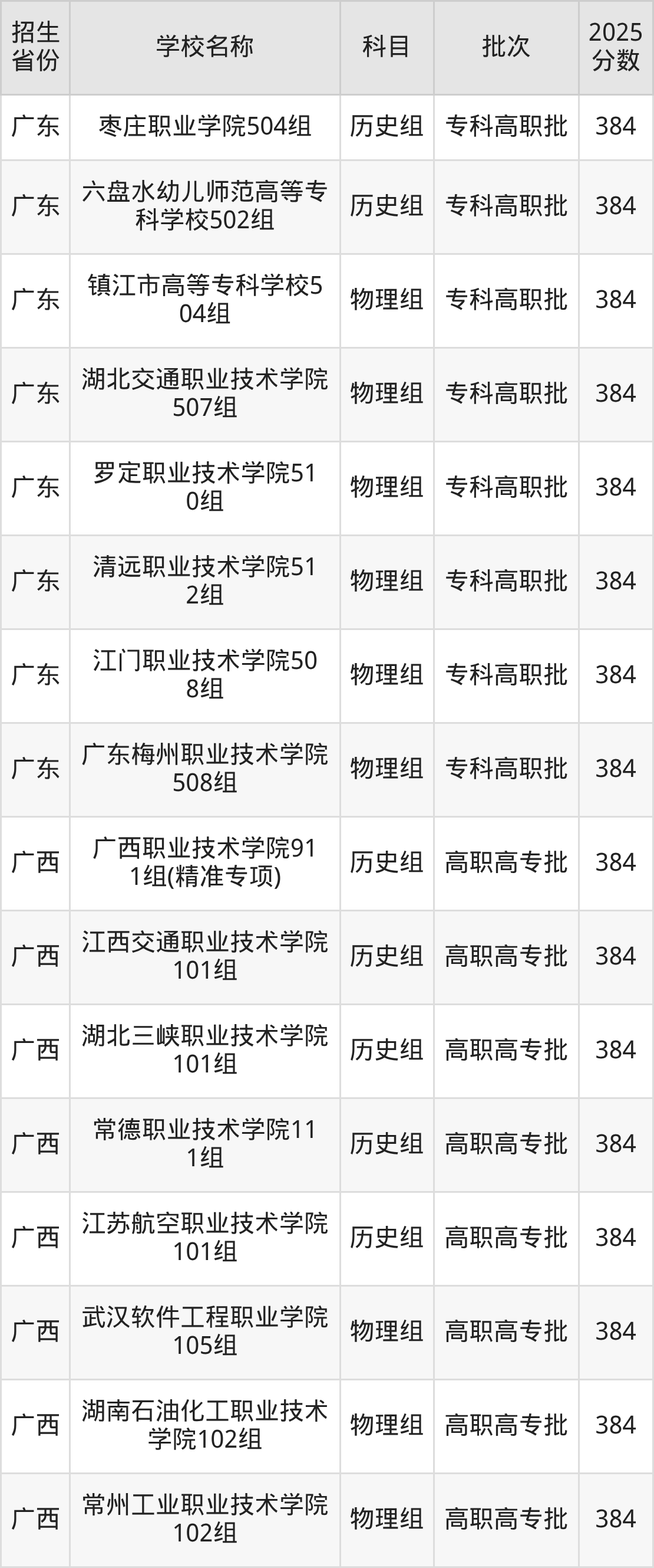 广东省历史组分数线是384分的公办专科大学有:黑龙江旅游职业技术学院、枣庄职业学院、六盘水幼儿师范高等专科学校。