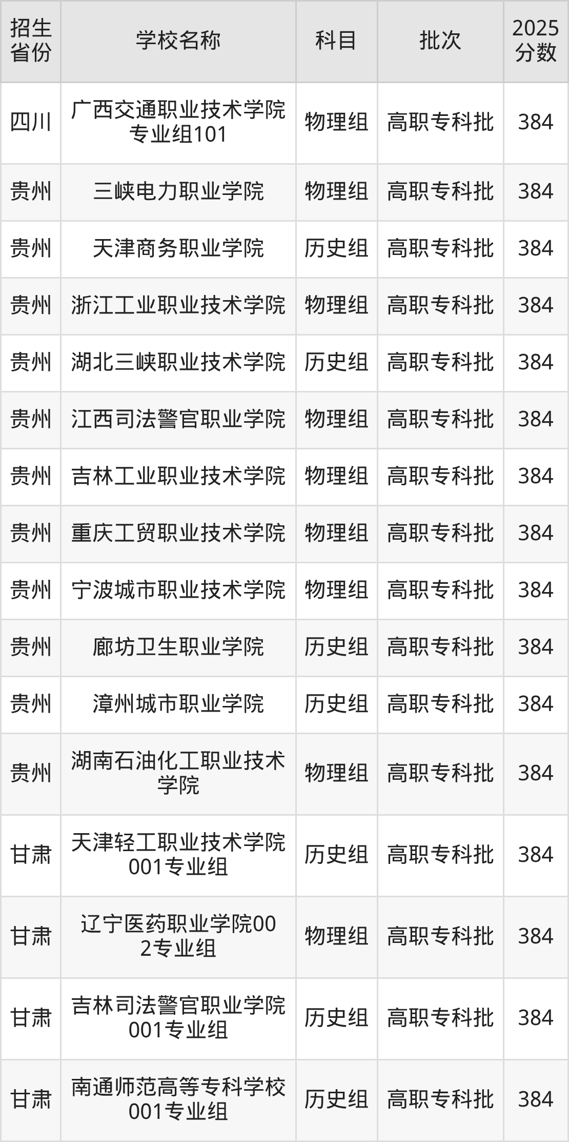 贵州省物理组分数线是384分的公办专科大学有:三峡电力职业学院、浙江工业职业技术学院、江西司法警官职业学院、吉林工业职业技术学院、重庆工贸职业技术学院、宁波城市职业技术学院、湖南石油化工职业技术学院。