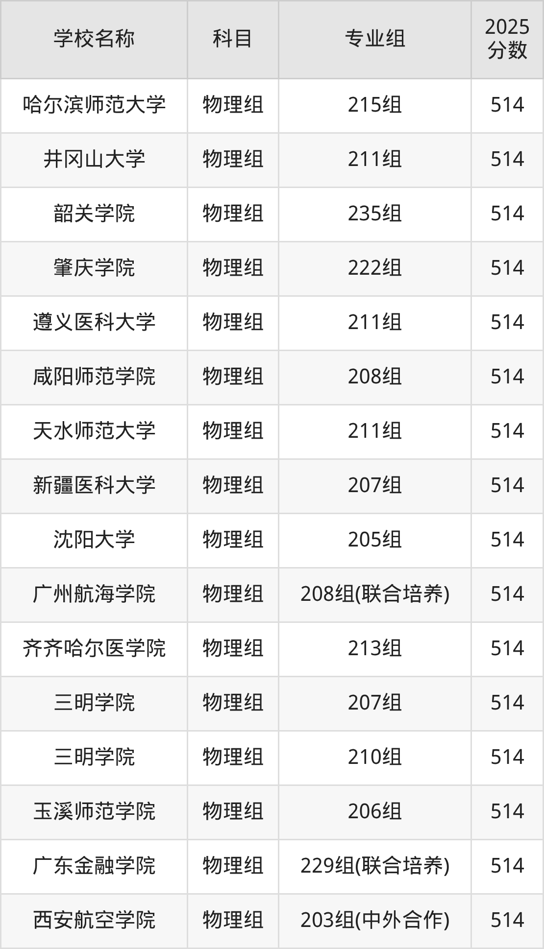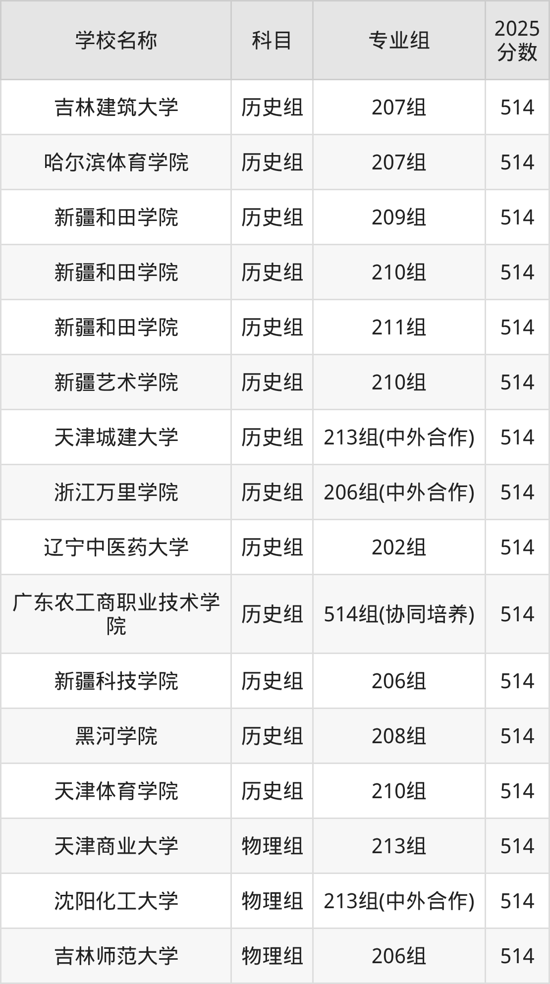 广东高考录取分数线在514分左右的公办院校专业组一共有37个,其中历史组有:吉林建筑大学(514分)、哈尔滨体育学院(514分)、新疆和田学院(514分),物理组有:天津商业大学(514分)、沈阳化工大学(514分)、吉林师范大学(514分)。