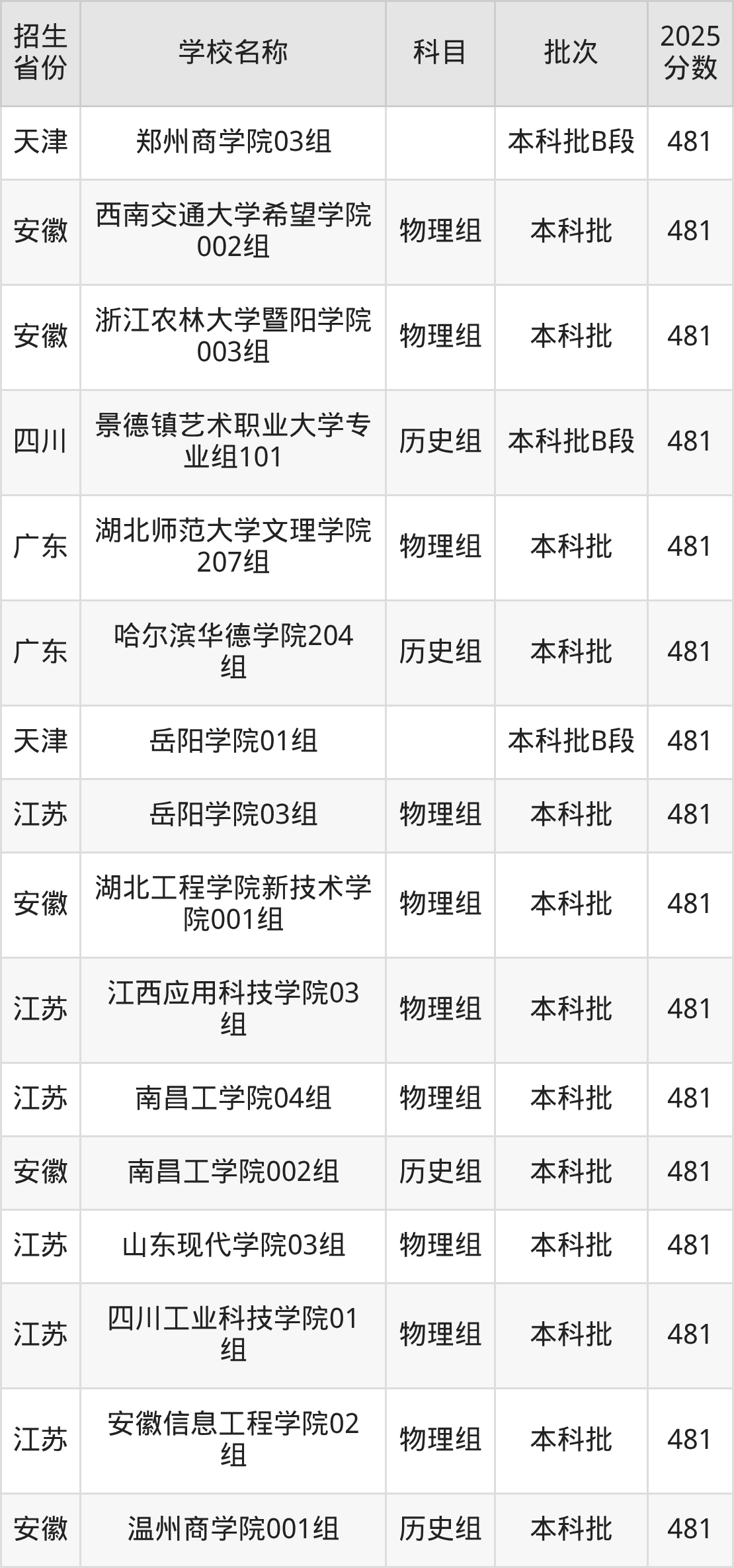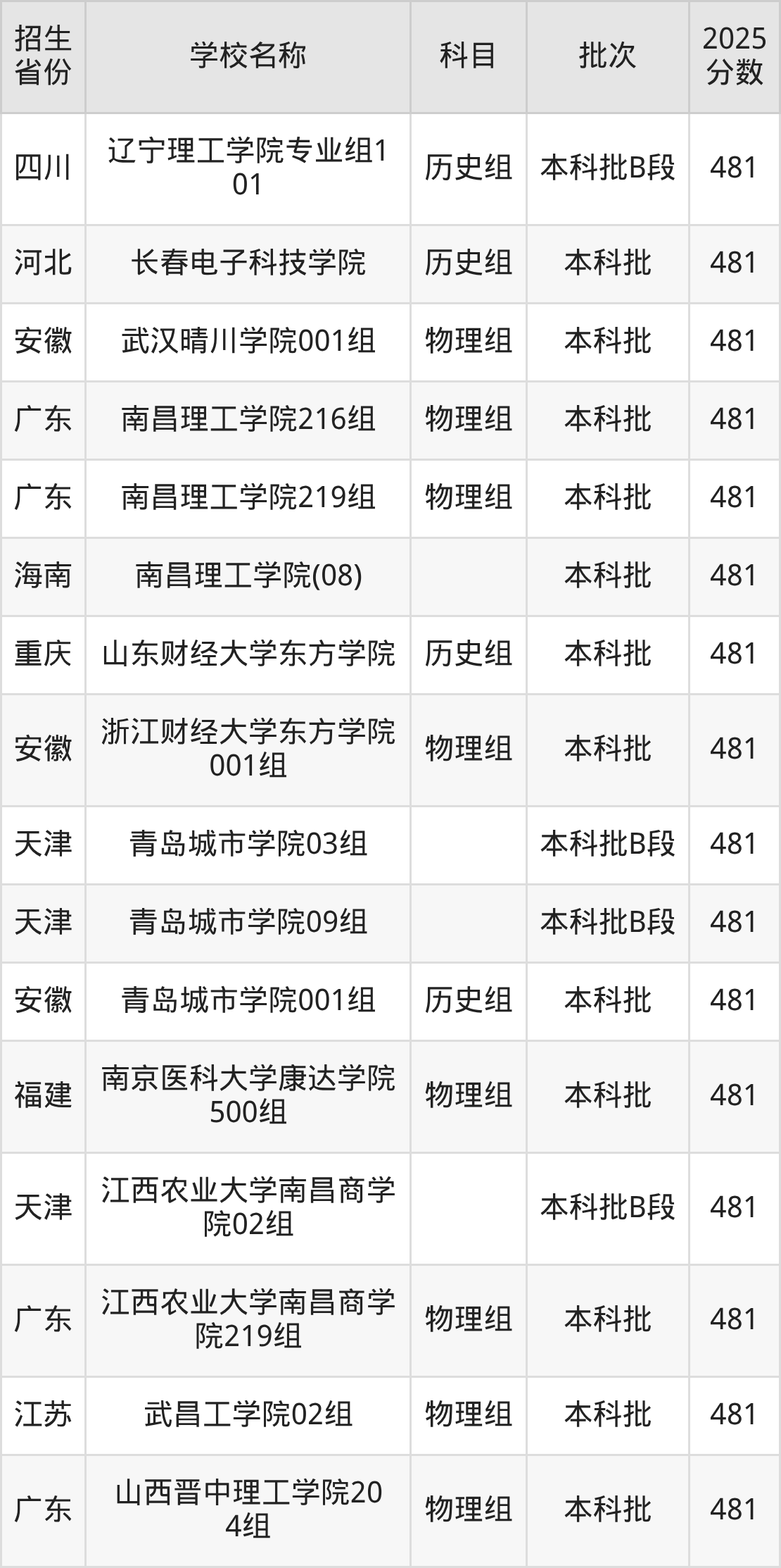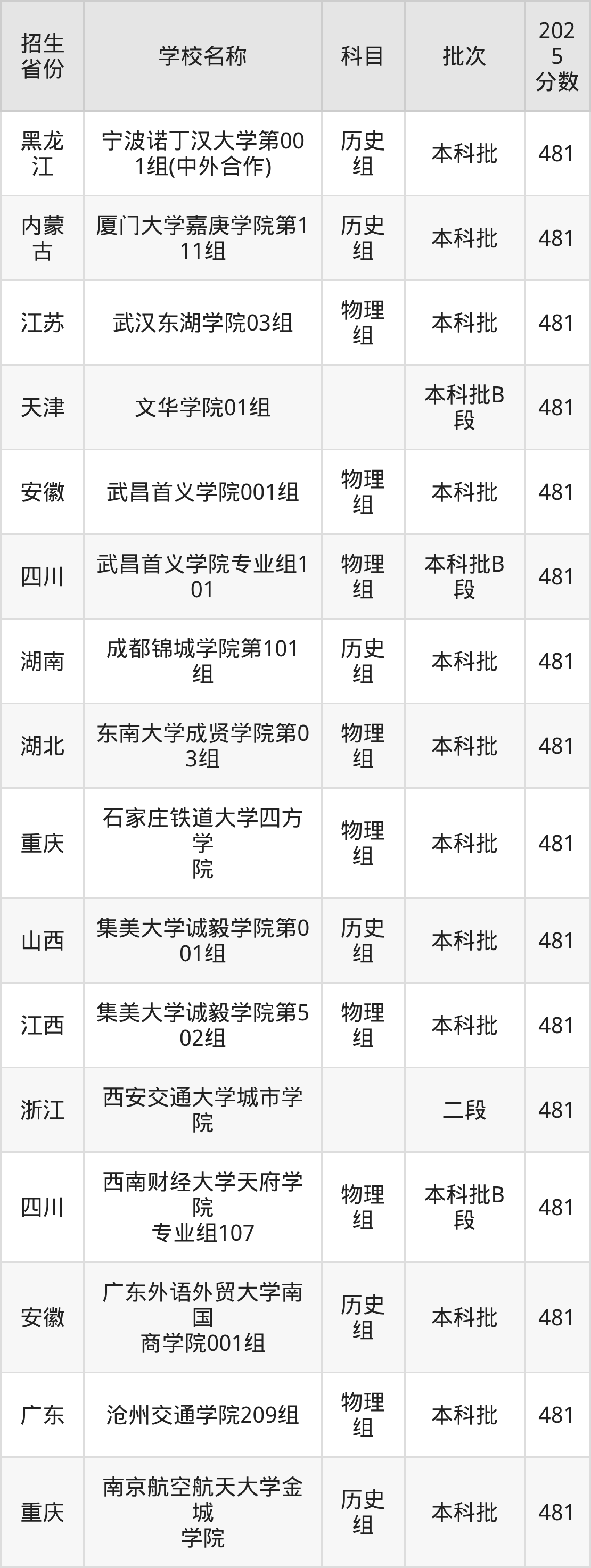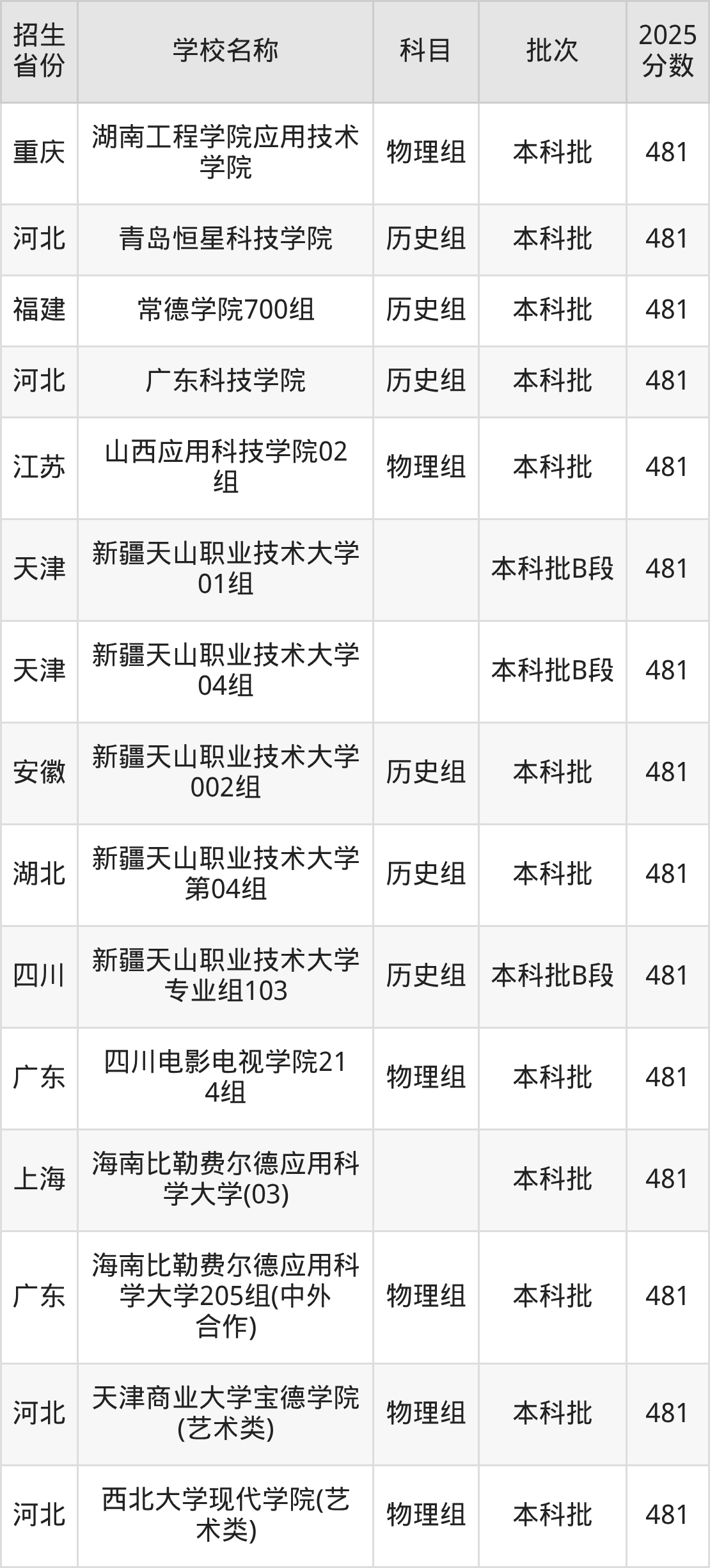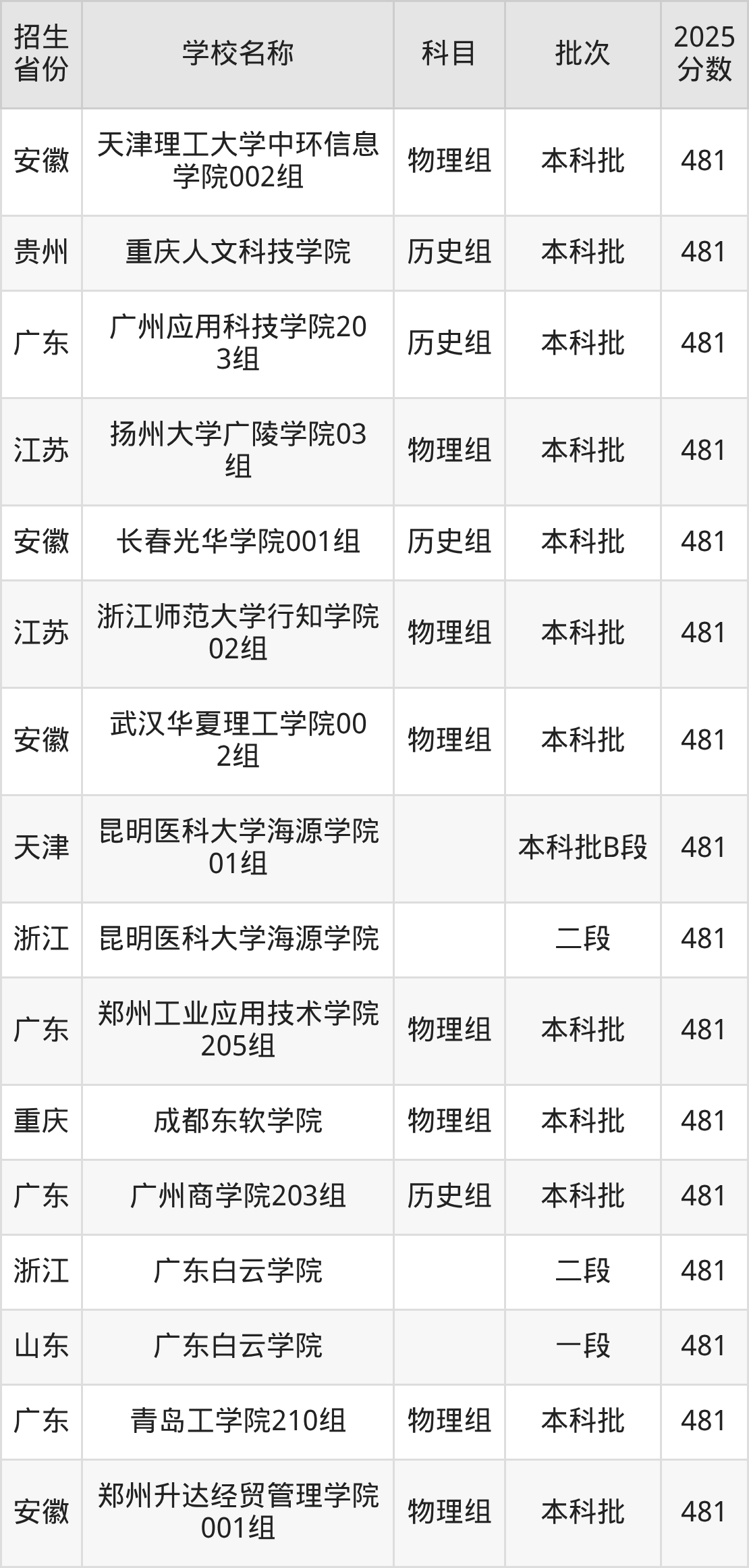 筛选全国各省2025年录取分数线为481分的二本民办大学如下: