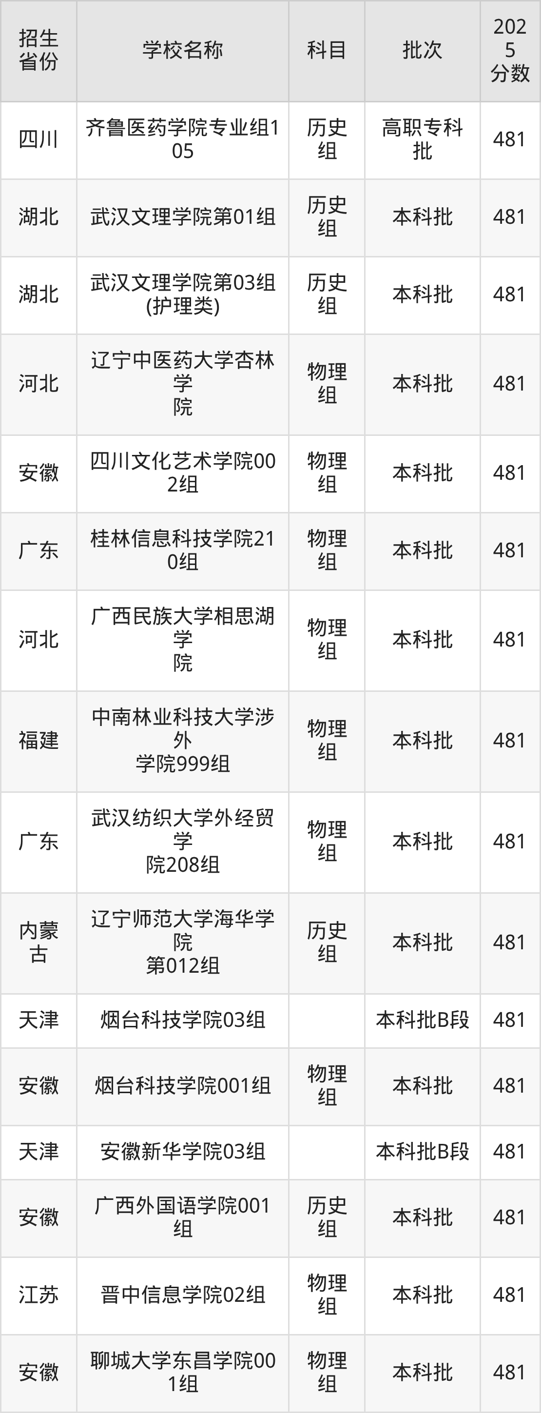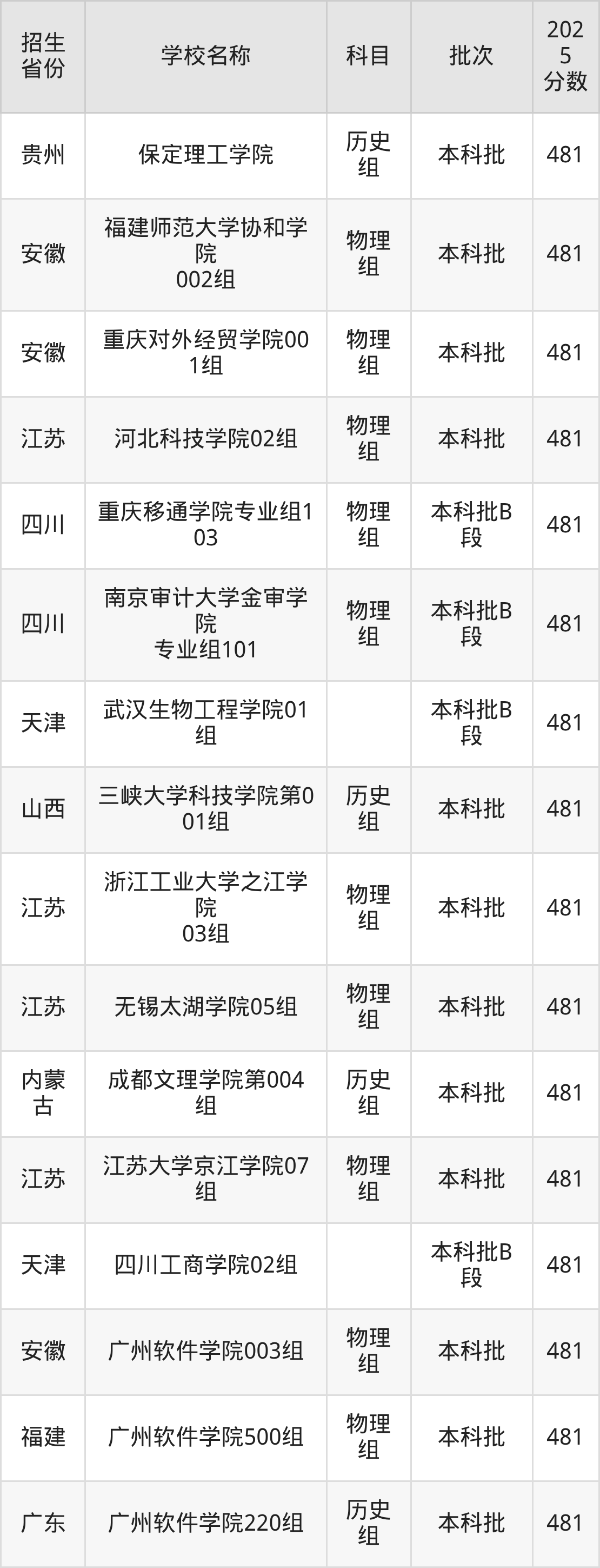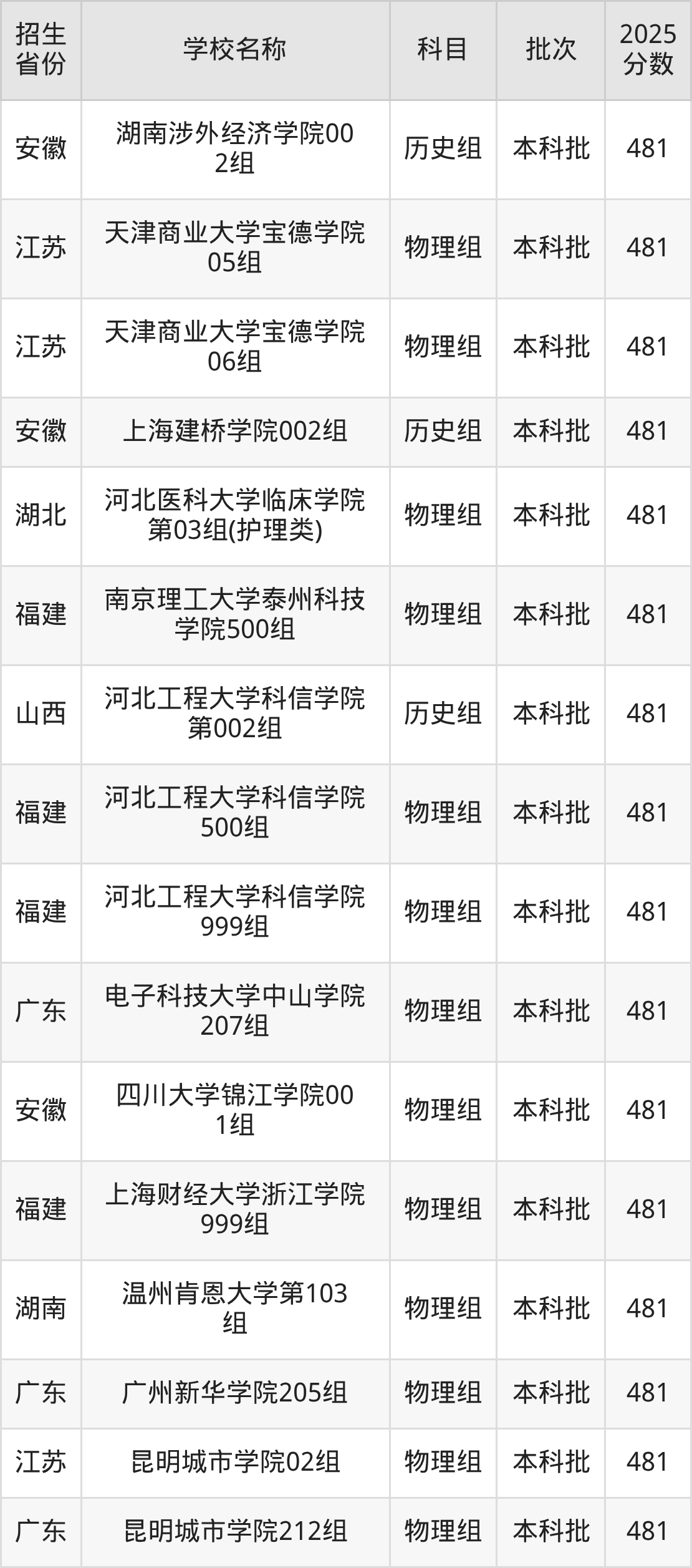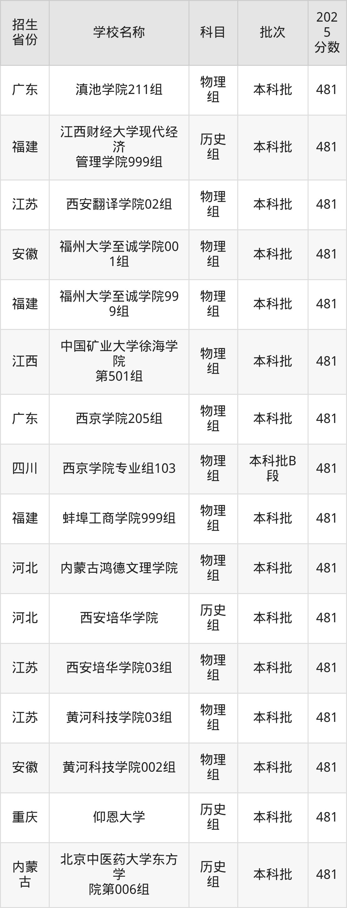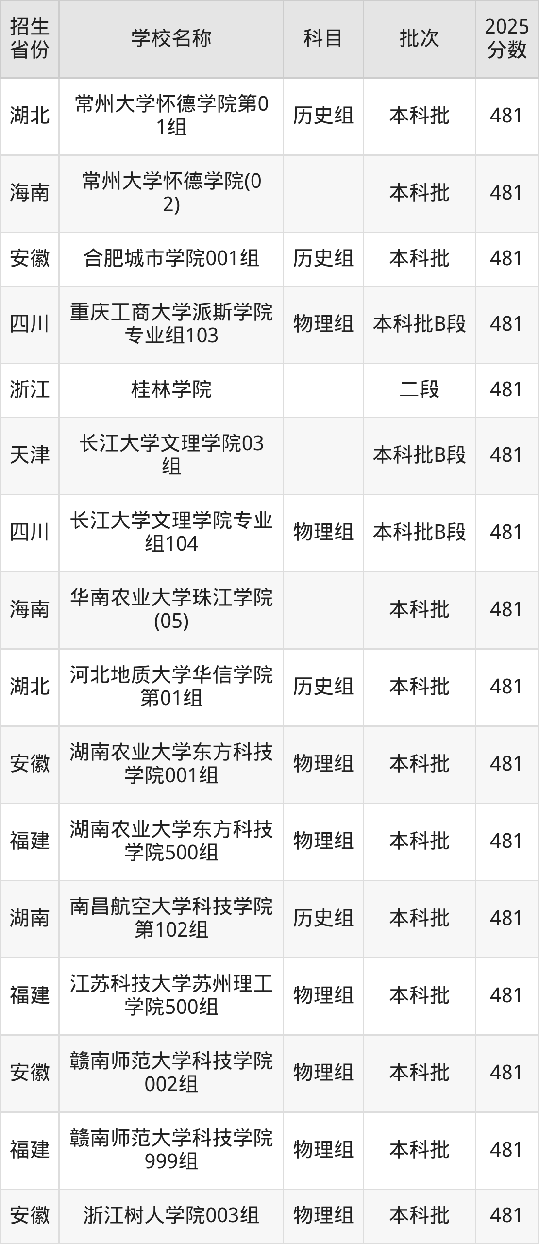 筛选全国各省2025年录取分数线为481分的二本民办大学如下: