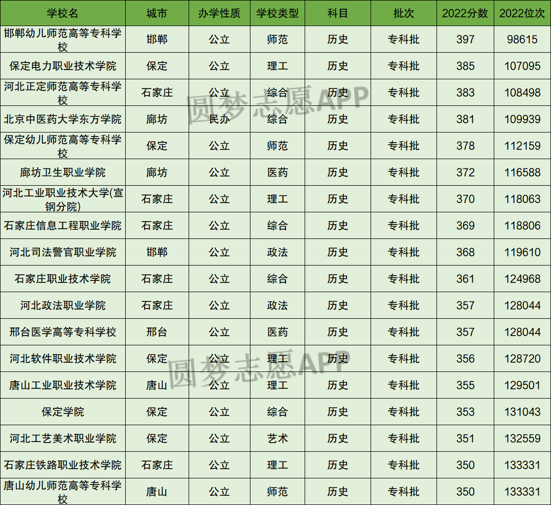 以下为2022年高考中河北省内历史类专业350分到400分的大学名单。