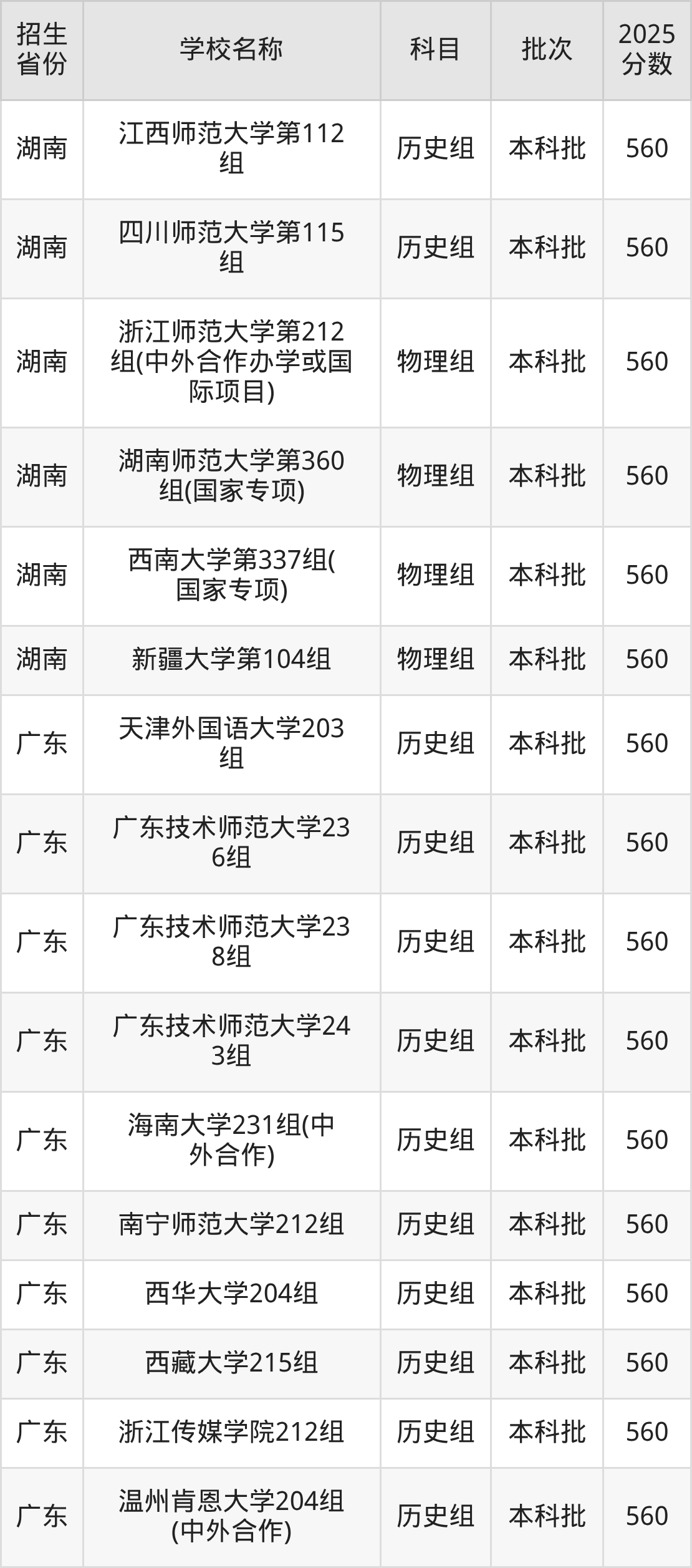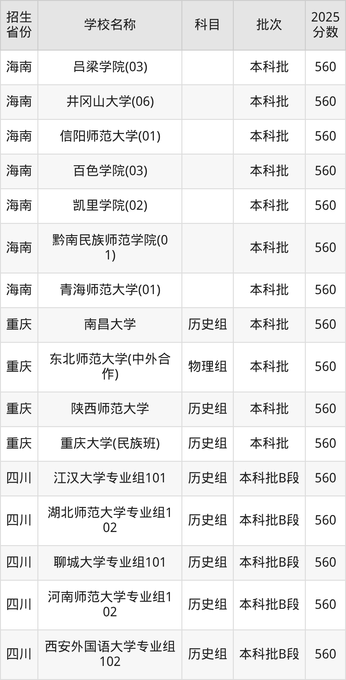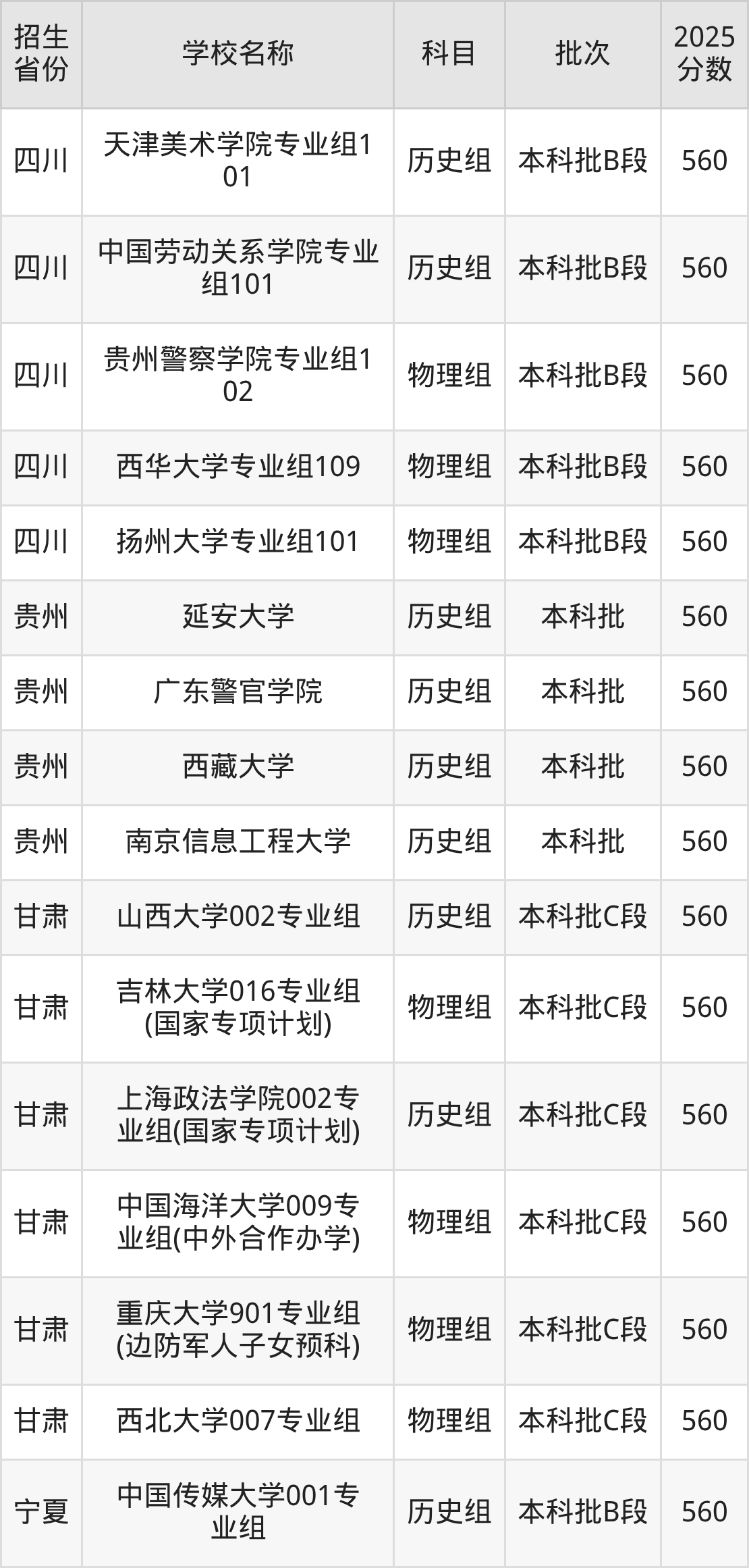 二、各省560分的文科大学名单