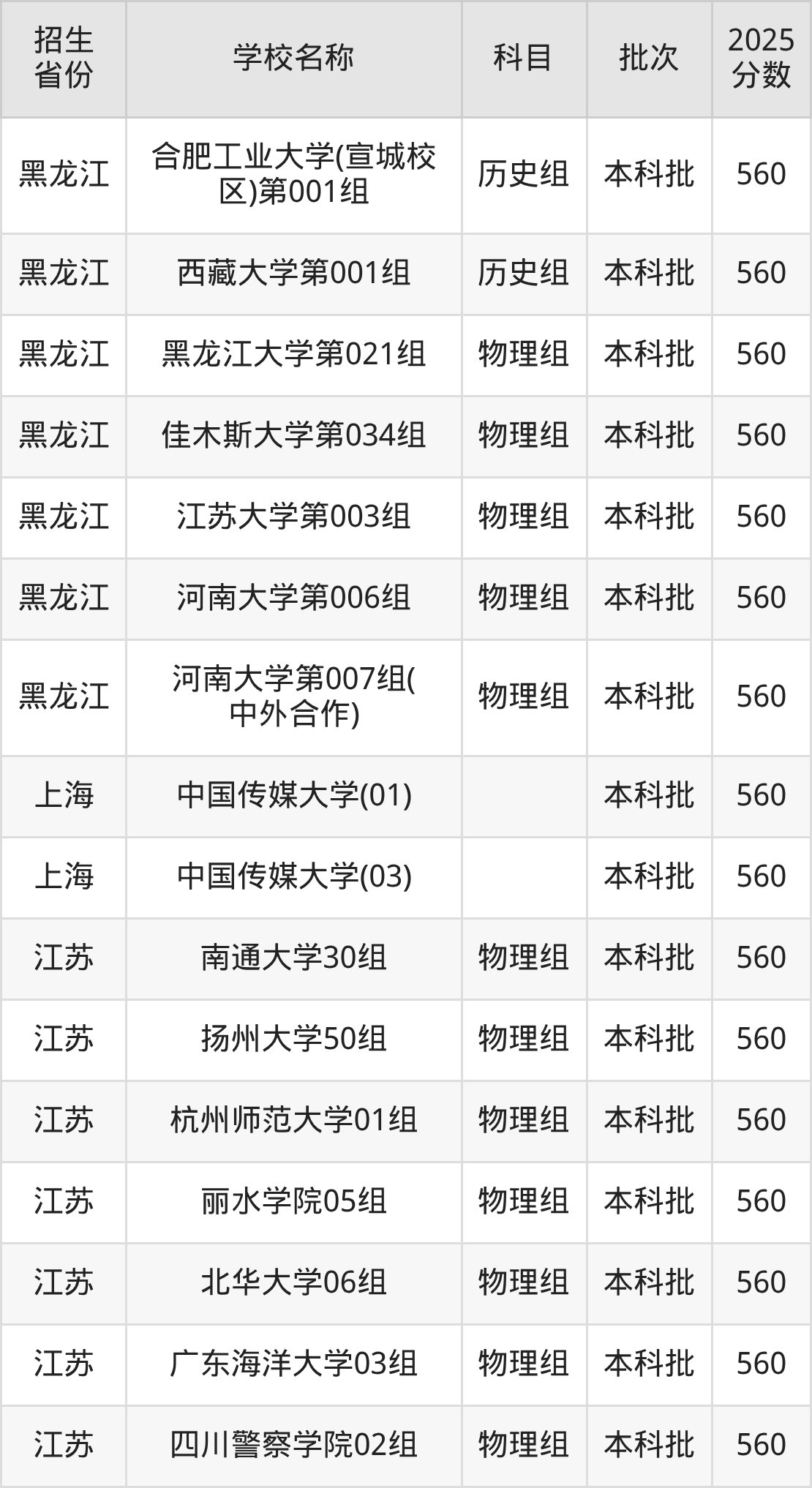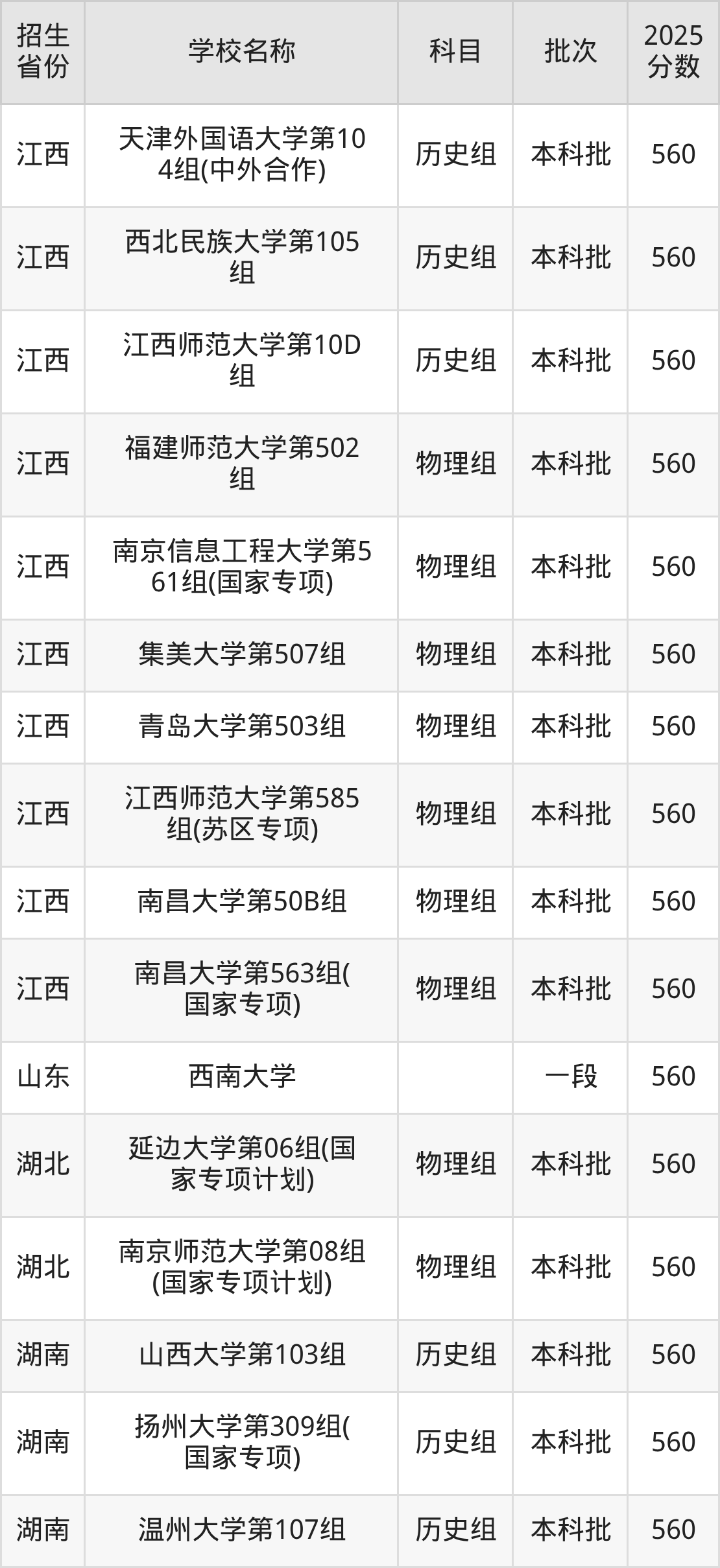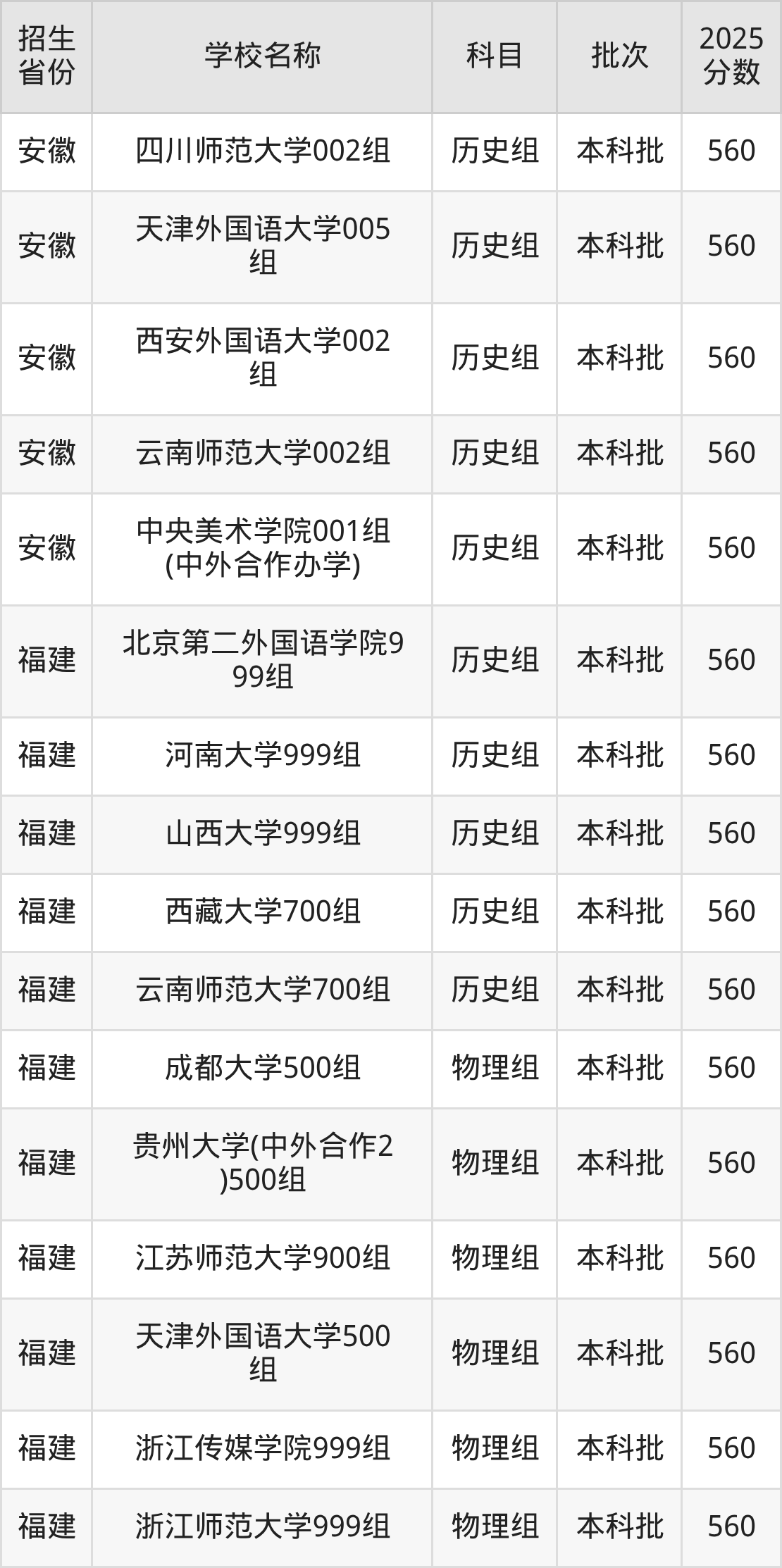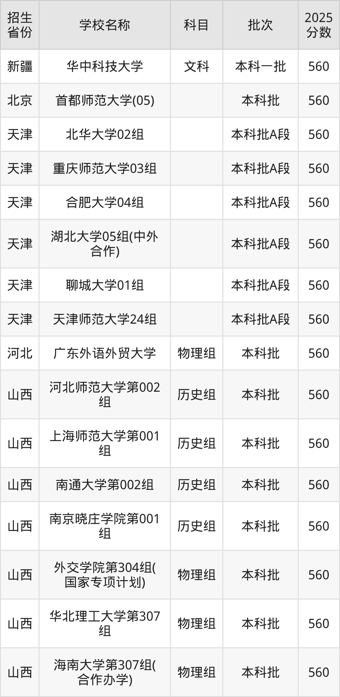 二、各省560分的文科大学名单