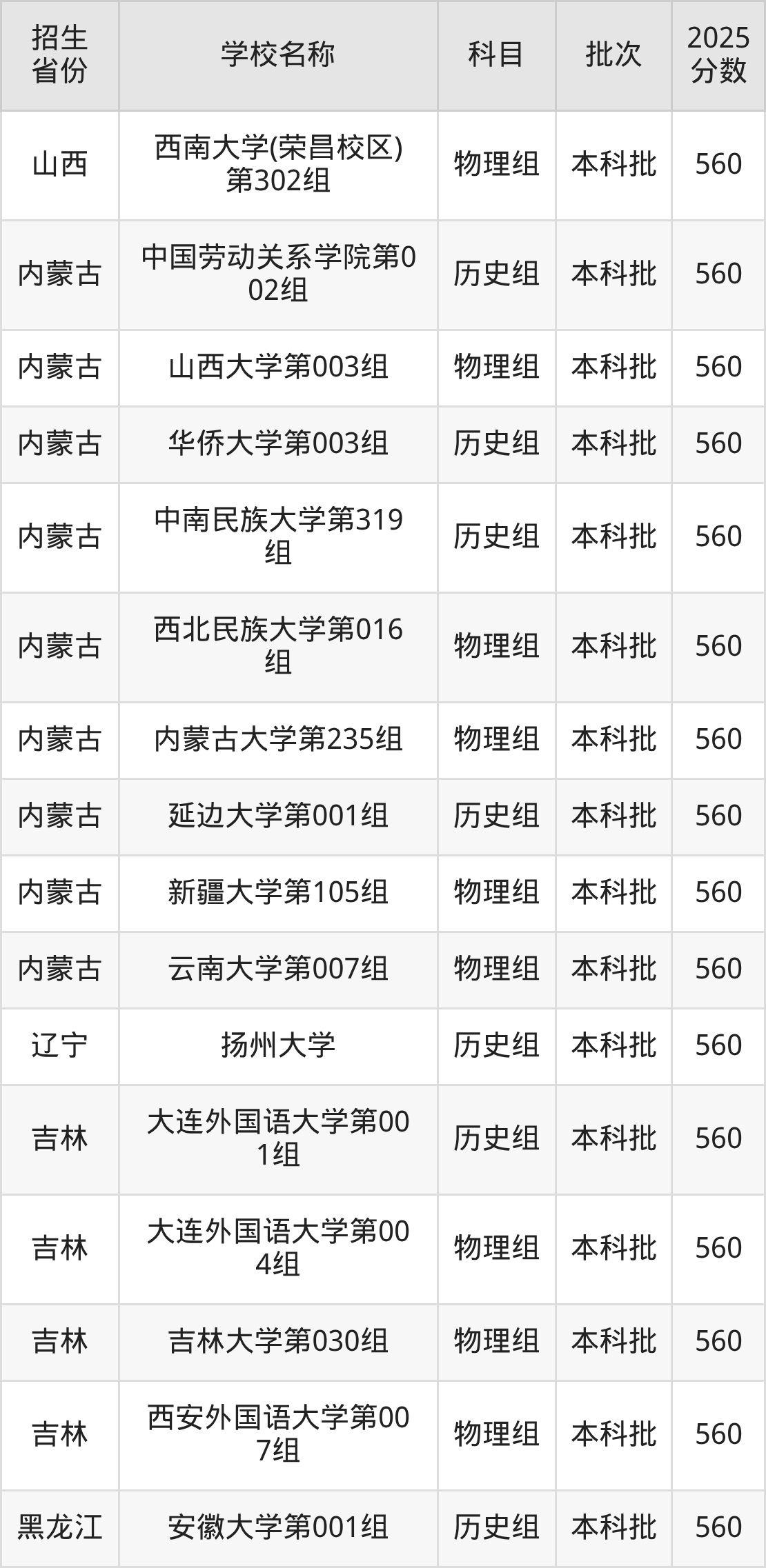 筛选全国各省2025年录取分数线为560分的文科大学如下: