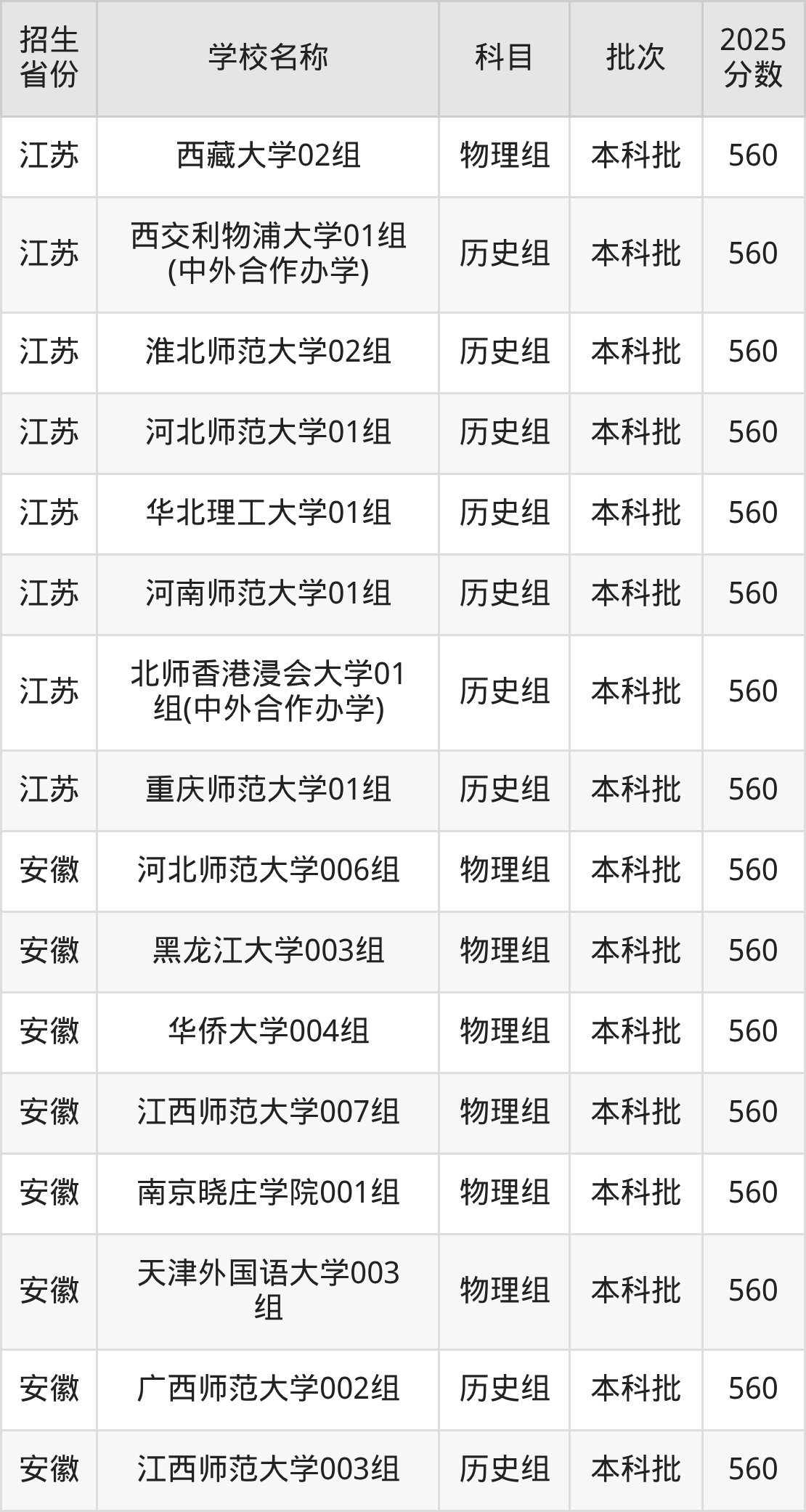 江苏省历史组分数线是560分的文科大学有:西交利物浦大学、淮北师范大学、河北师范大学、华北理工大学、河南师范大学、北师香港浸会大学、重庆师范大学。