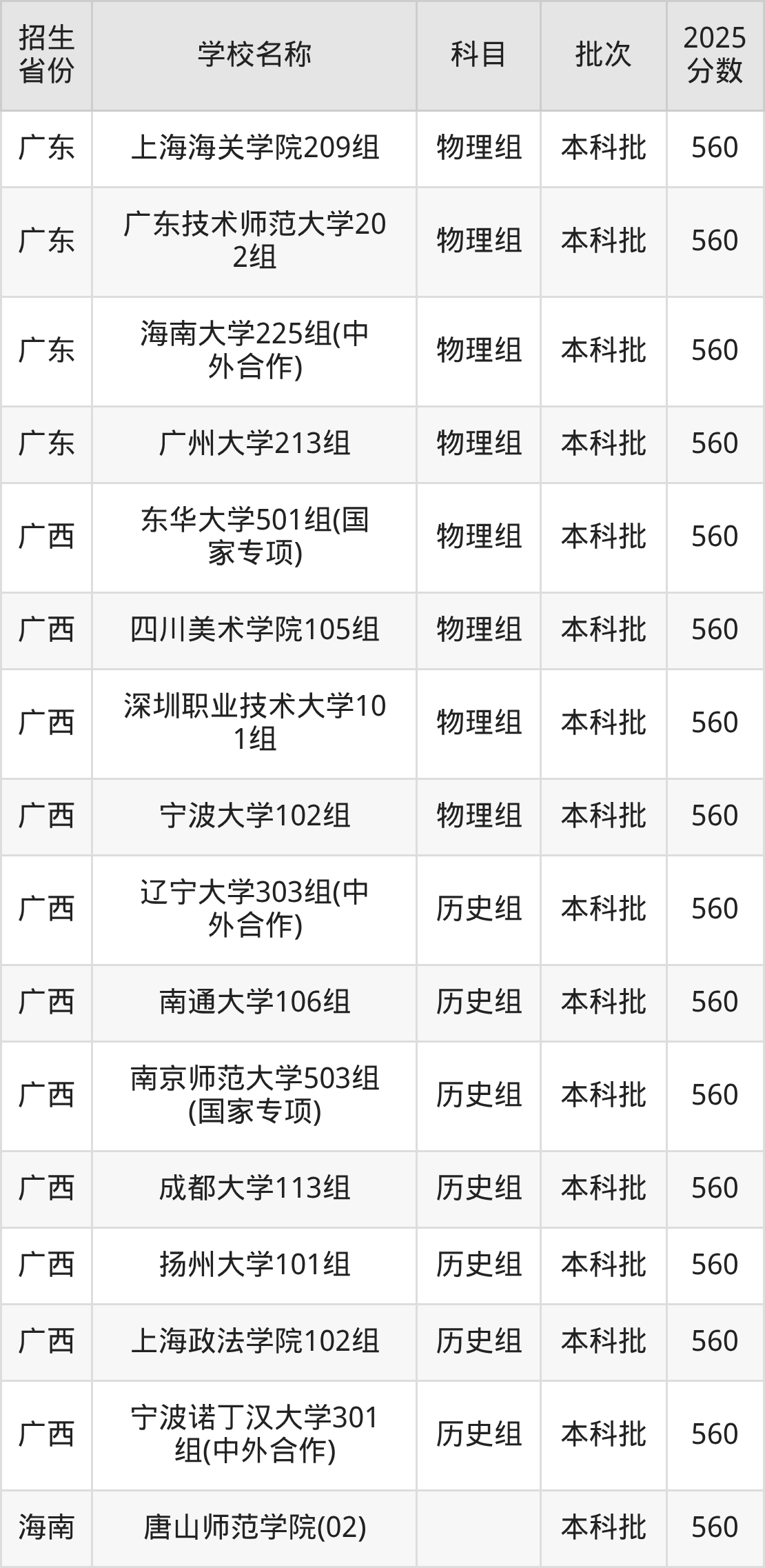 广西壮族自治区物理组分数线是560分的文科大学有:东华大学、四川美术学院、深圳职业技术大学、宁波大学。