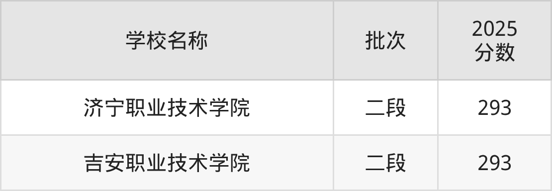 山东高考录取分数线在293分左右的公办大学一共有2所。分别是济宁职业技术学院(293分)、吉安职业技术学院(293分)