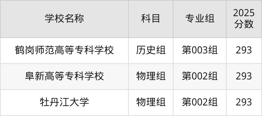 内蒙古高考录取分数线在293分左右的公办院校专业组一共有3个,其中历史组有:鹤岗师范高等专科学校(293分),物理组有:阜新高等专科学校(293分)、牡丹江大学(293分)。