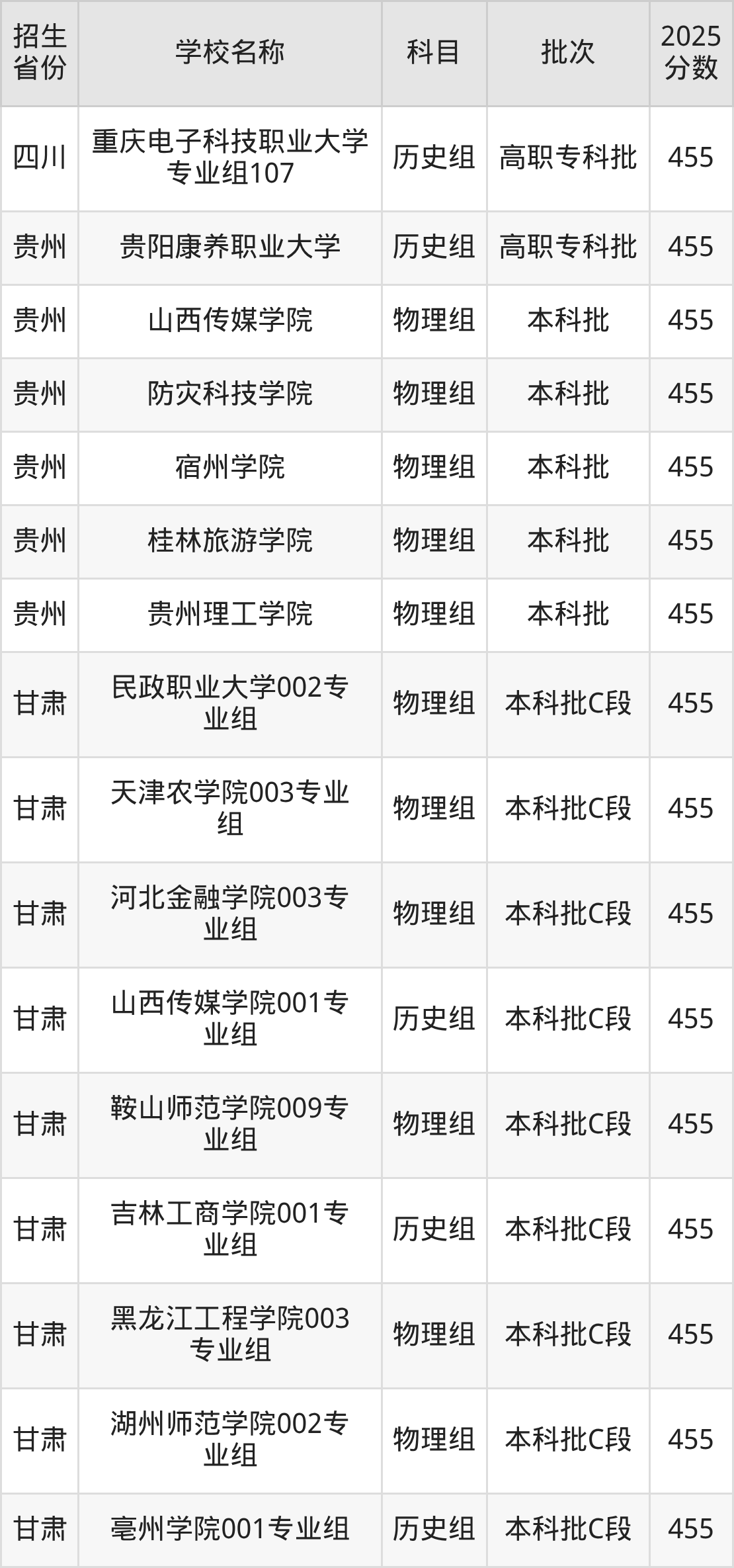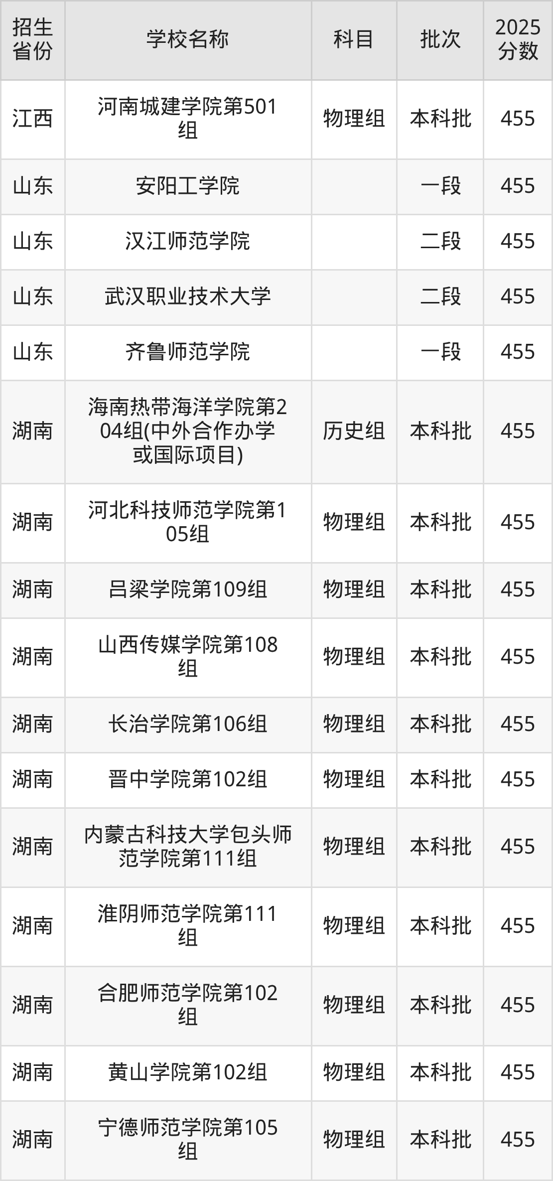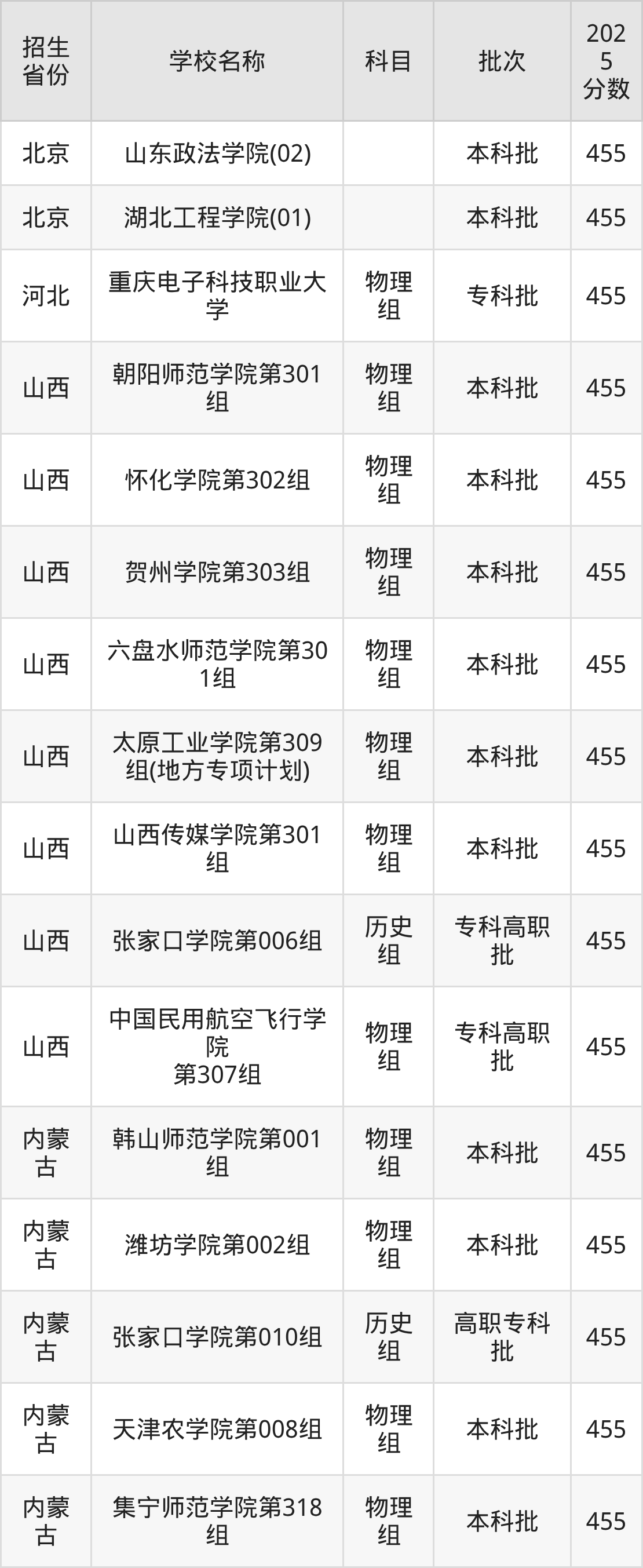 二、各省455分的二本公办大学名单