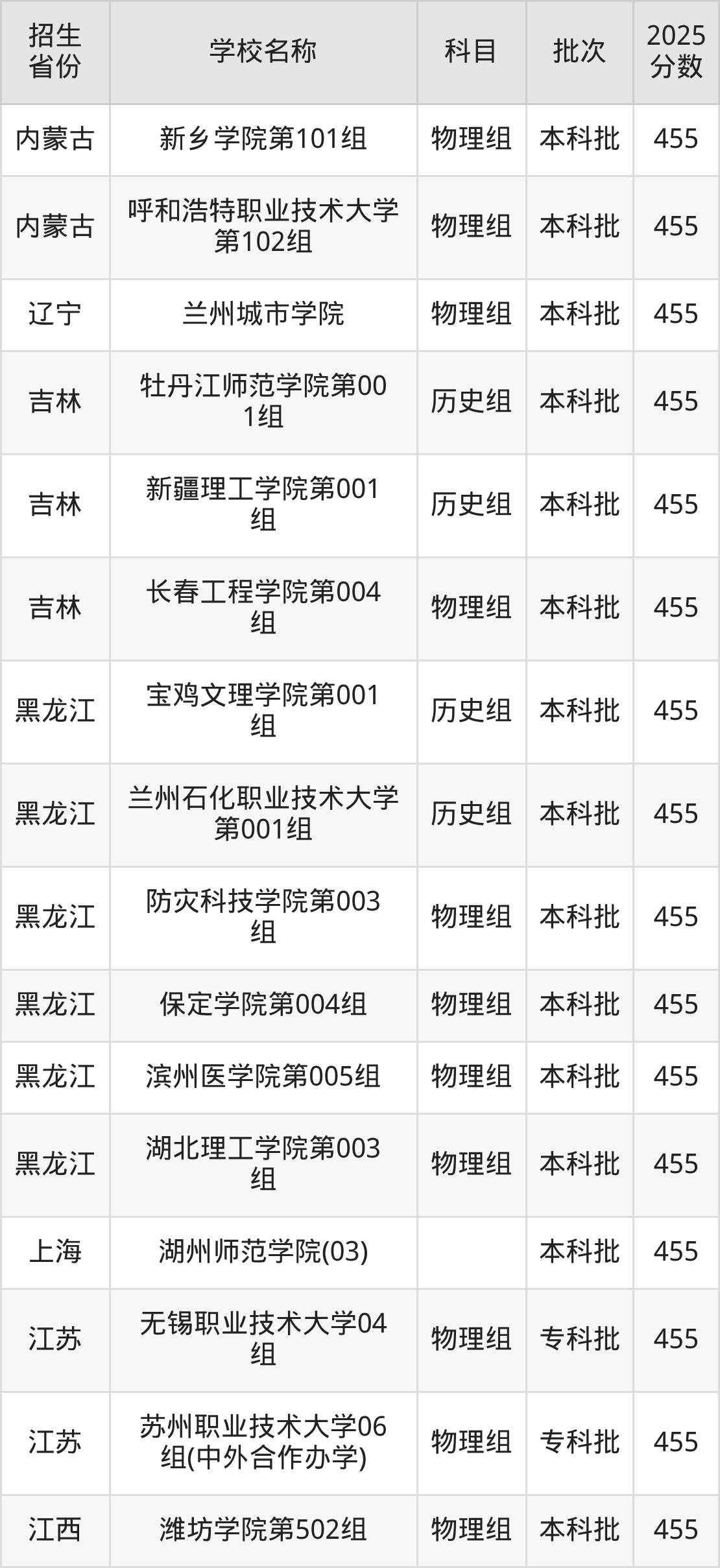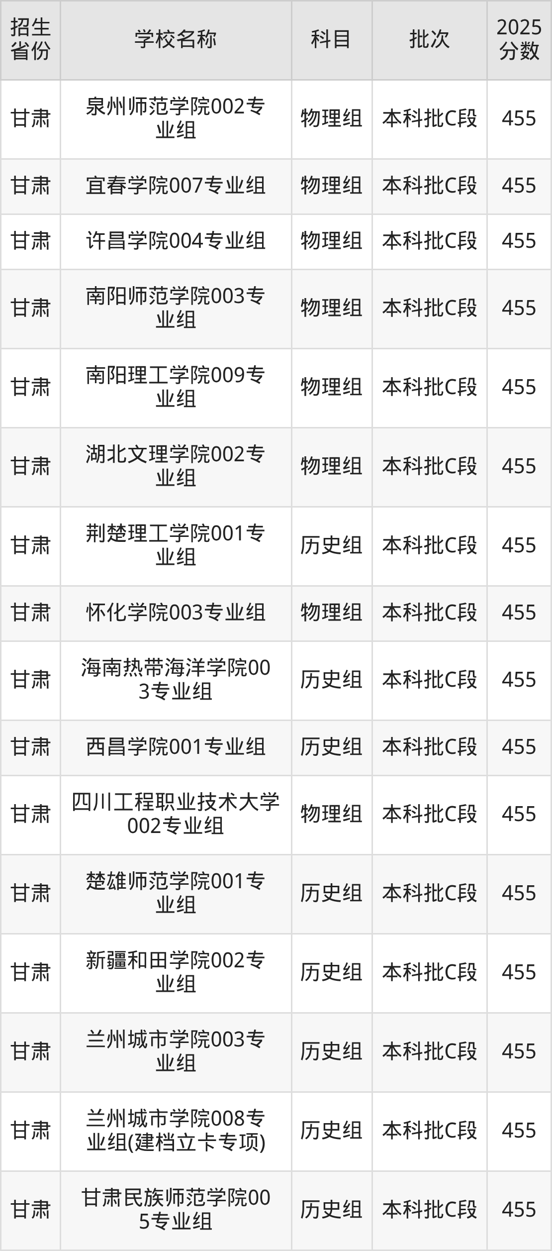 甘肃省物理组分数线是455分的二本公办大学有:民政职业大学、天津农学院、河北金融学院、鞍山师范学院、黑龙江工程学院、湖州师范学院、泉州师范学院、宜春学院、许昌学院、南阳师范学院。