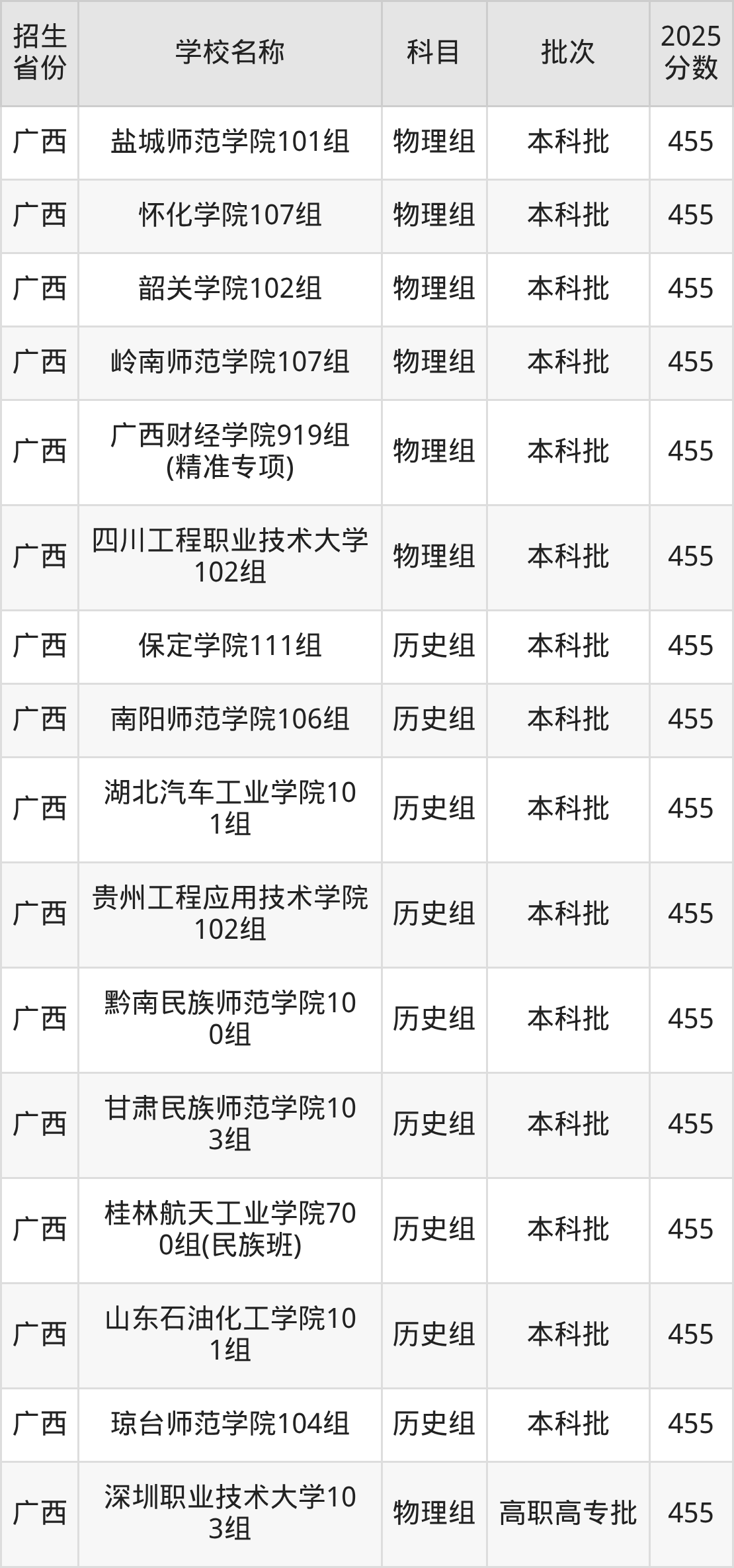 广西壮族自治区历史组分数线是455分的二本公办大学有:保定学院、南阳师范学院、湖北汽车工业学院、贵州工程应用技术学院、黔南民族师范学院、甘肃民族师范学院、桂林航天工业学院、山东石油化工学院、琼台师范学院。