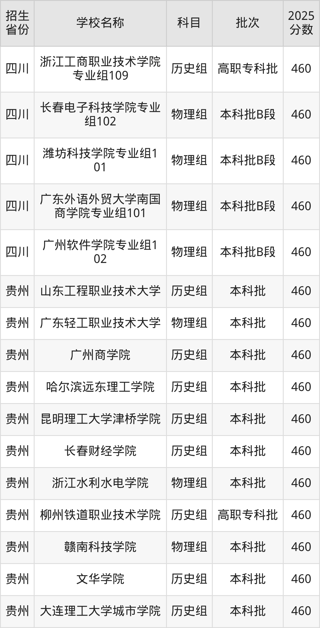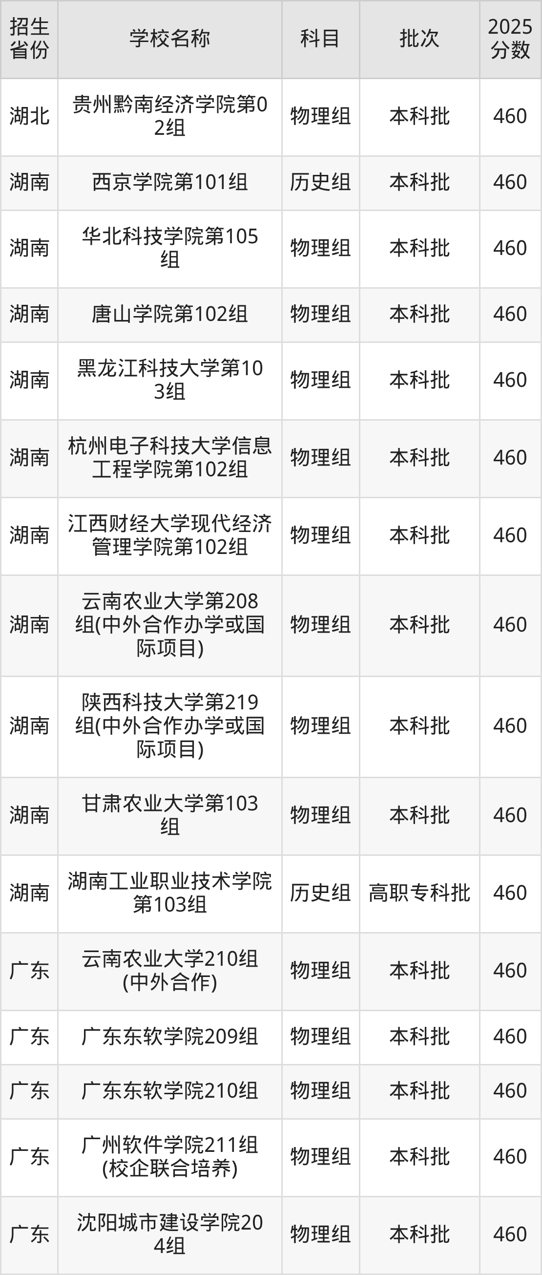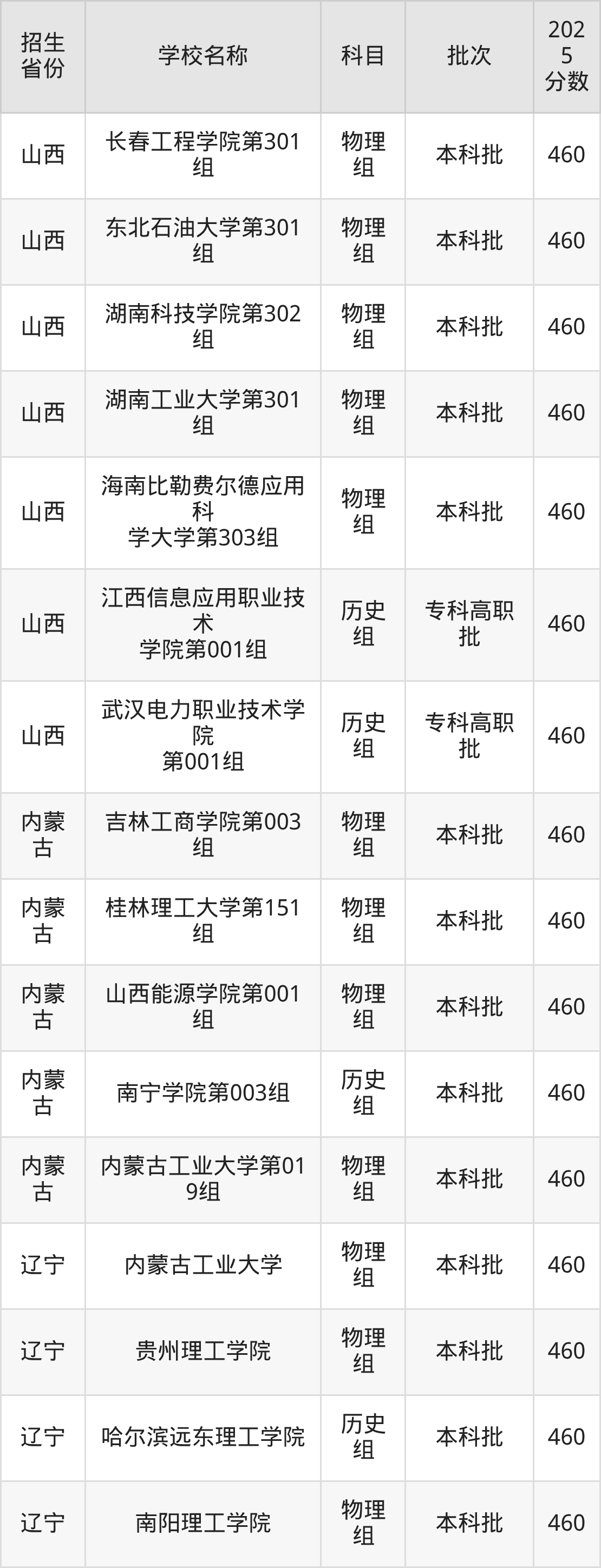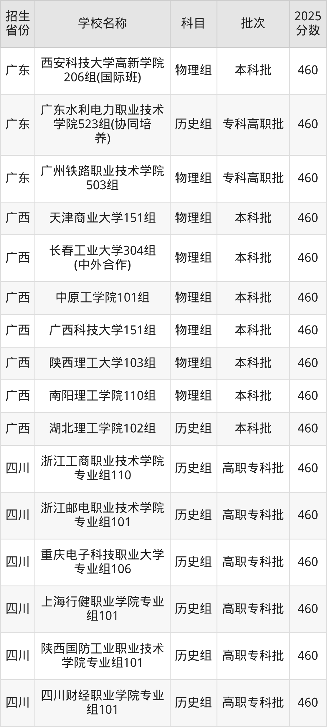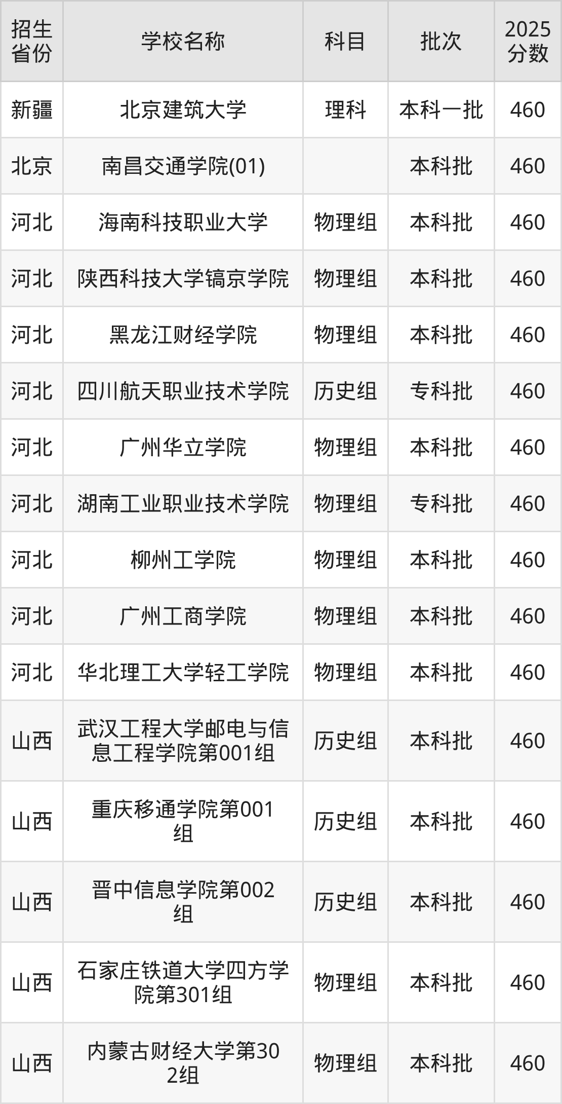 筛选全国各省2025年录取分数线为460分的理科大学如下: