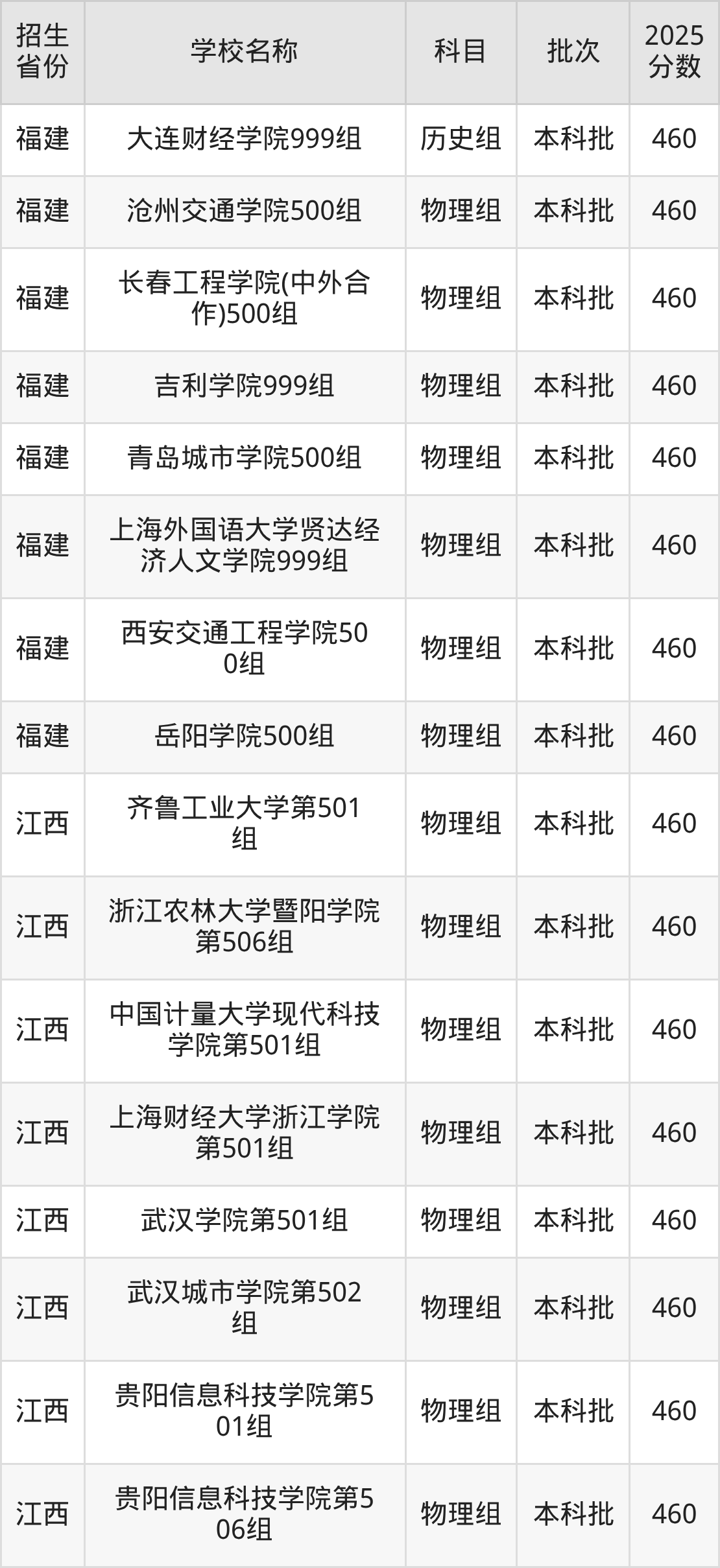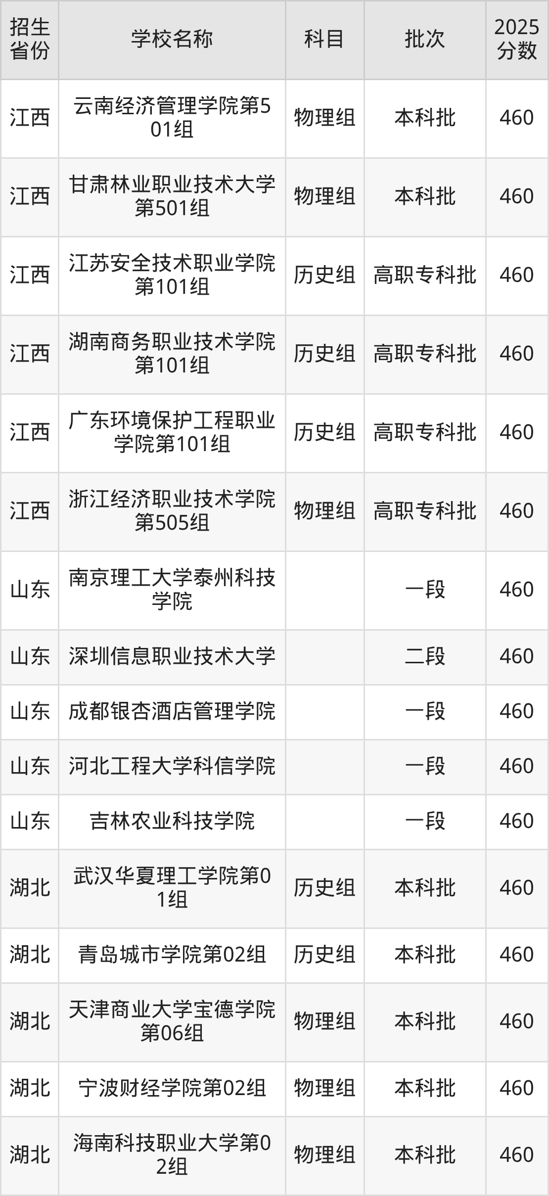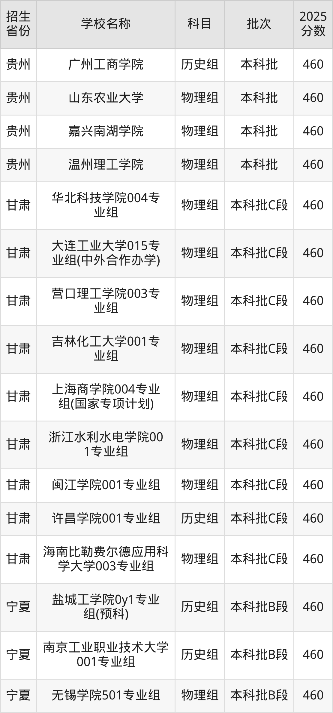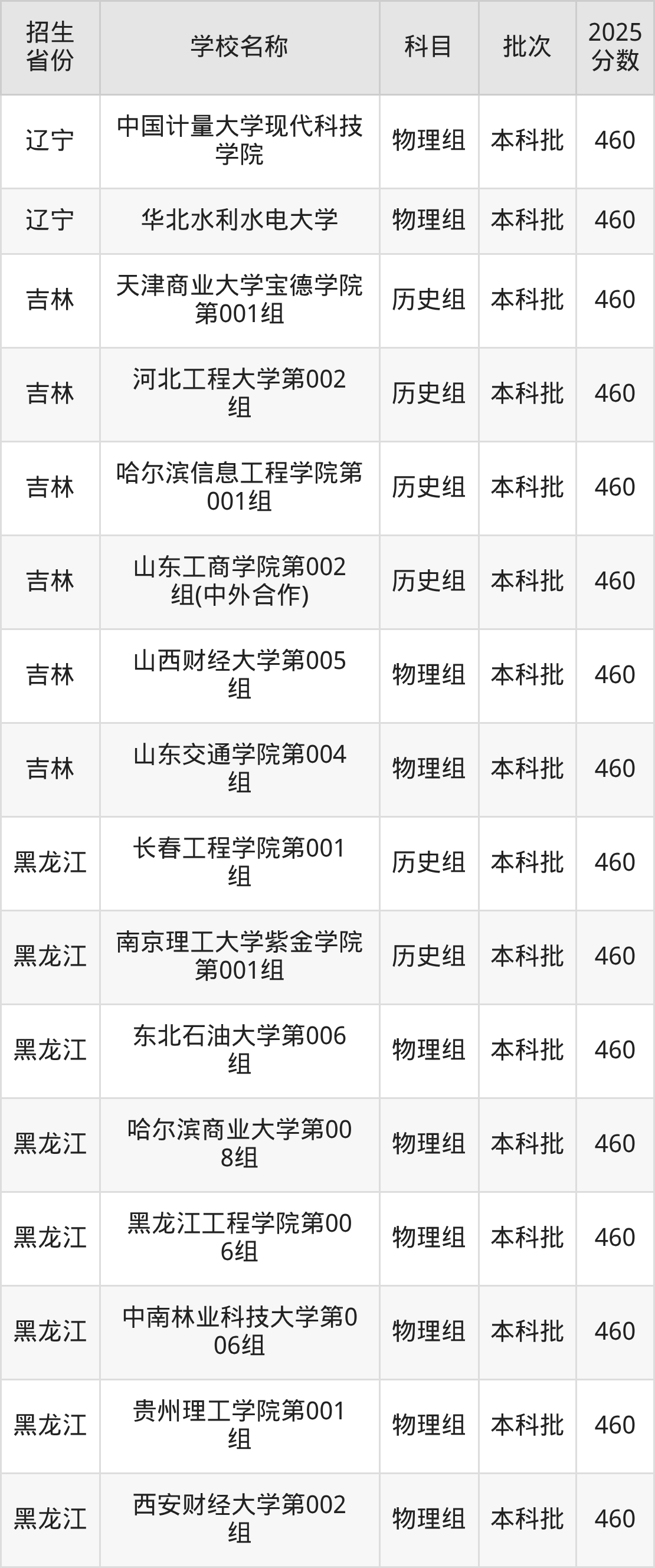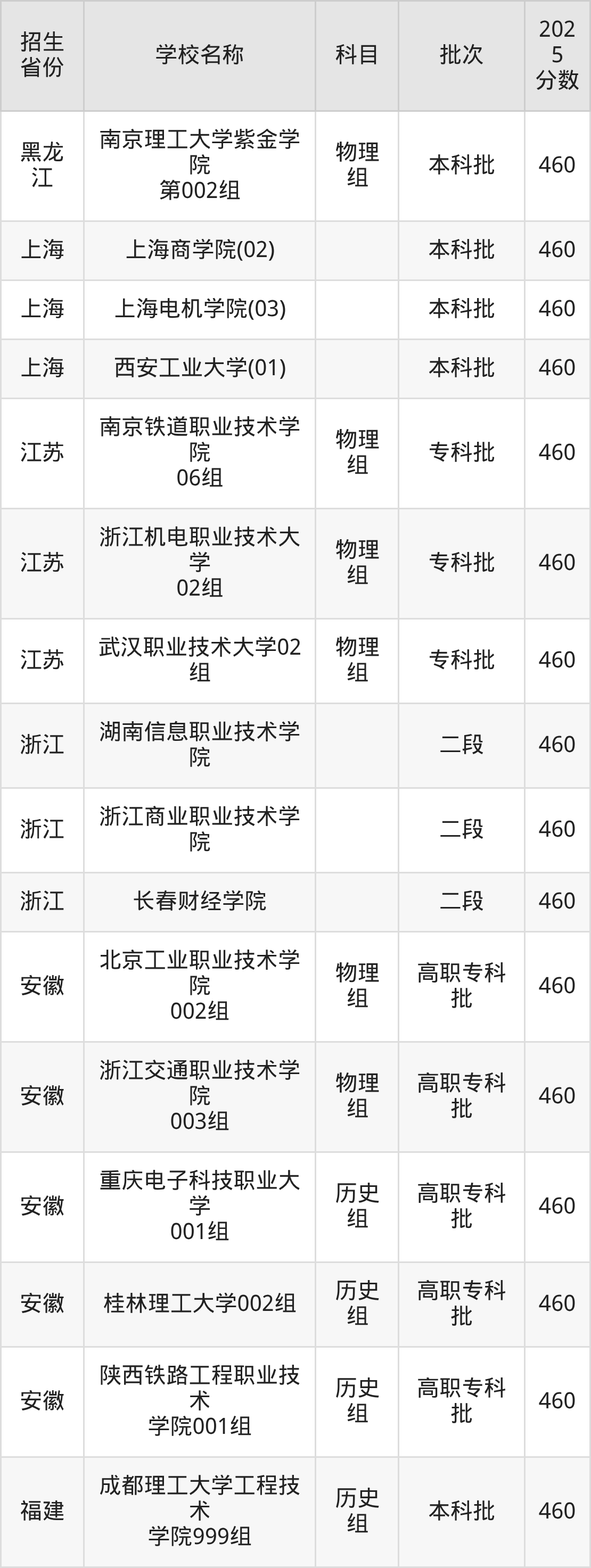 筛选全国各省2025年录取分数线为460分的理科大学如下: