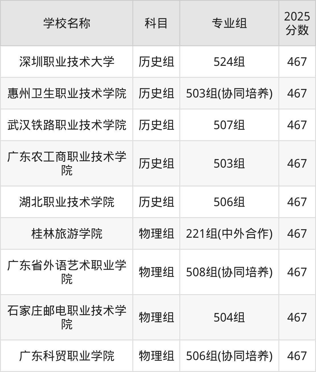 广东高考录取分数线在467分左右的公办院校专业组一共有9个,其中历史组有:深圳职业技术大学(467分)、惠州卫生职业技术学院(467分)、武汉铁路职业技术学院(467分),物理组有:桂林旅游学院(467分)、广东省外语艺术职业学院(467分)、石家庄邮电职业技术学院(467分)。