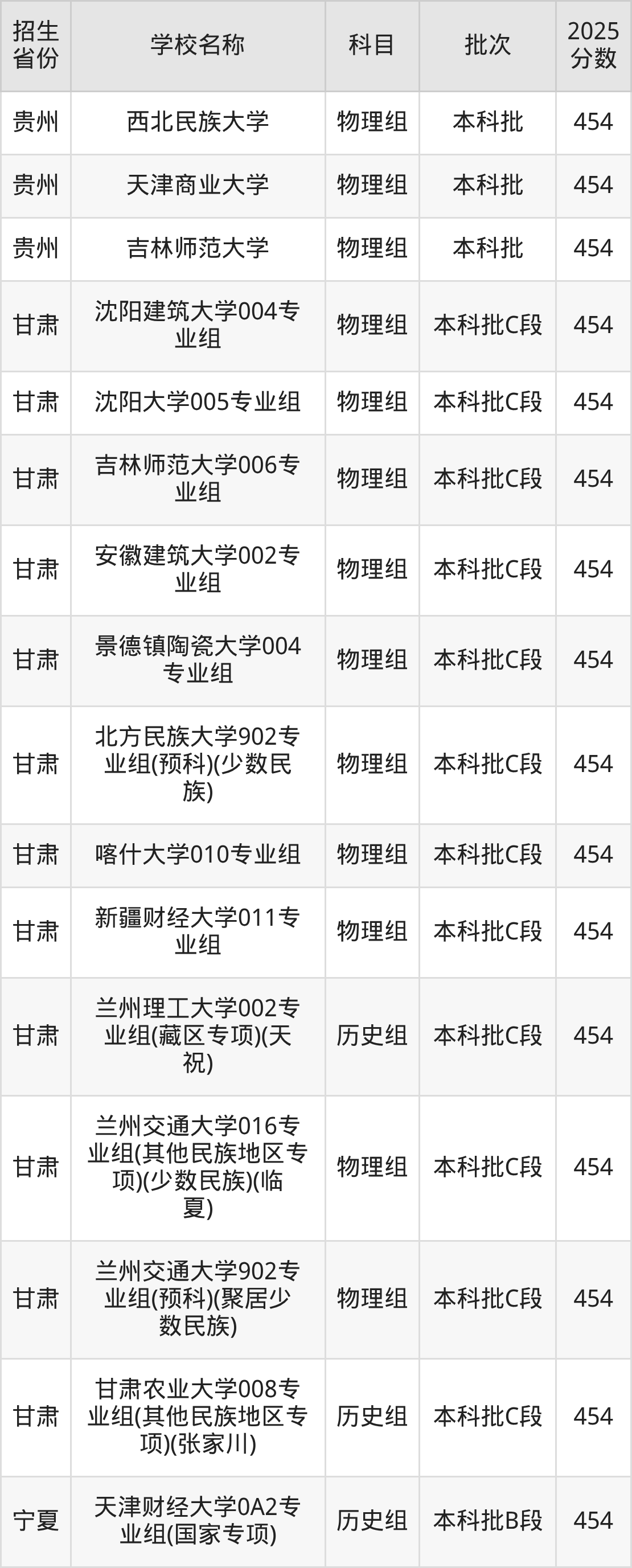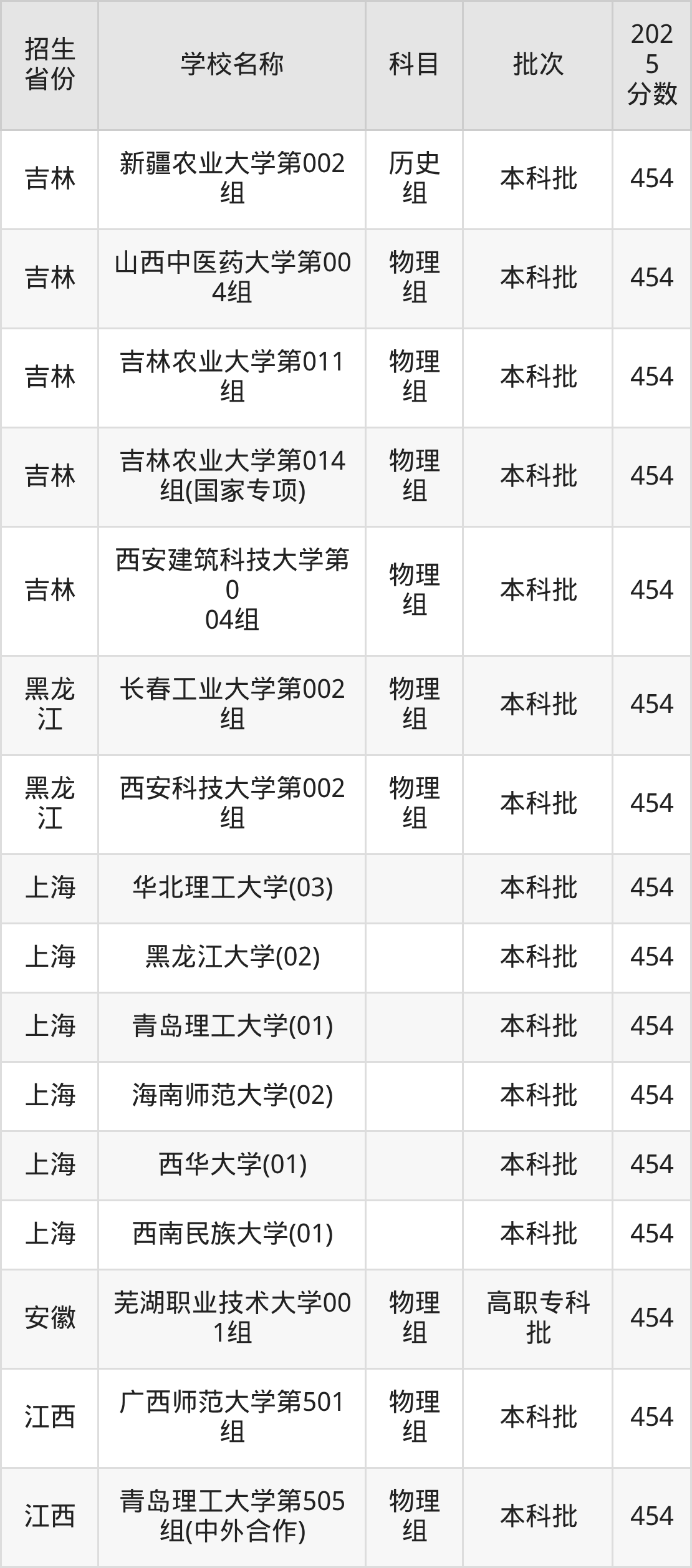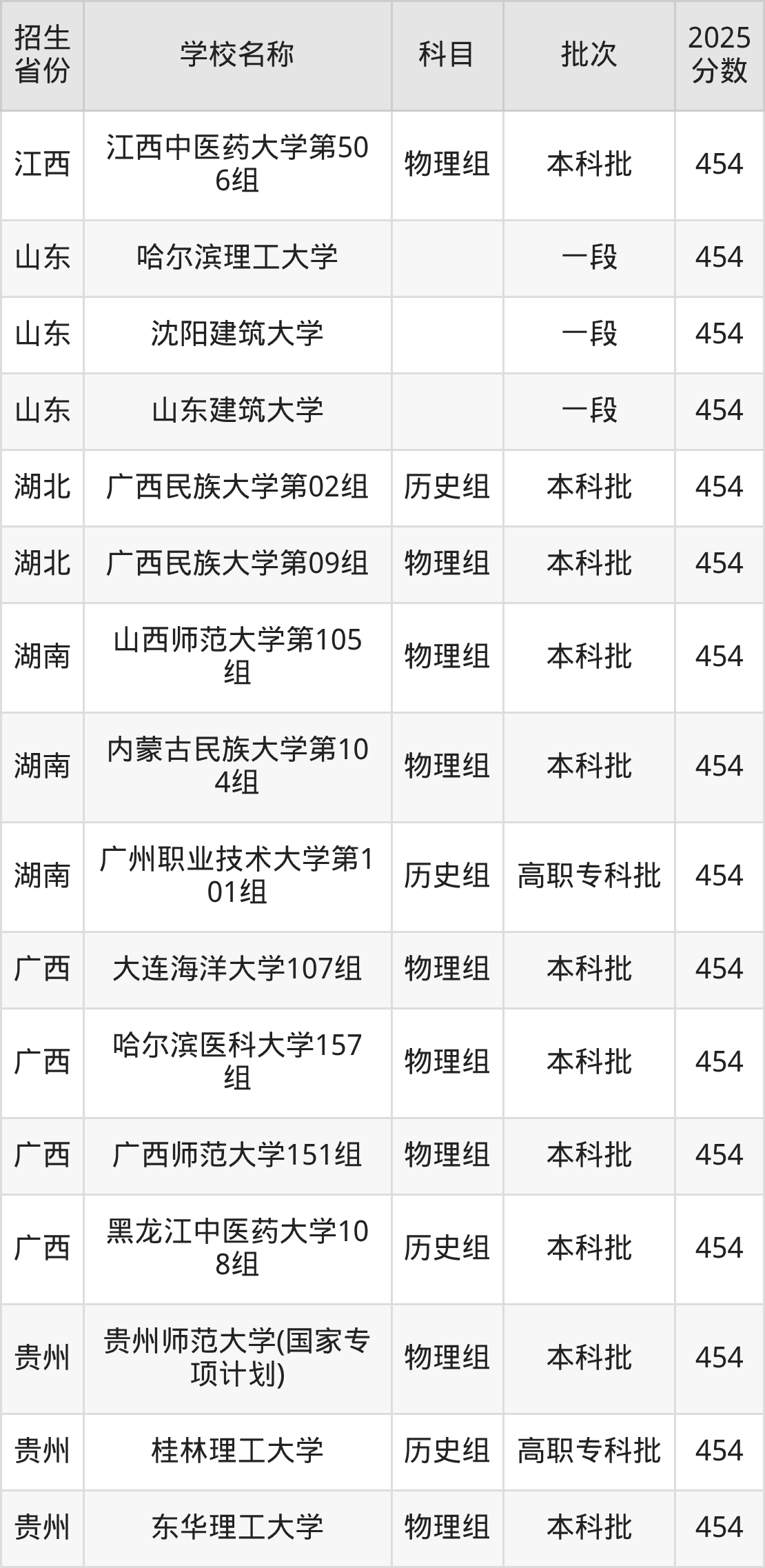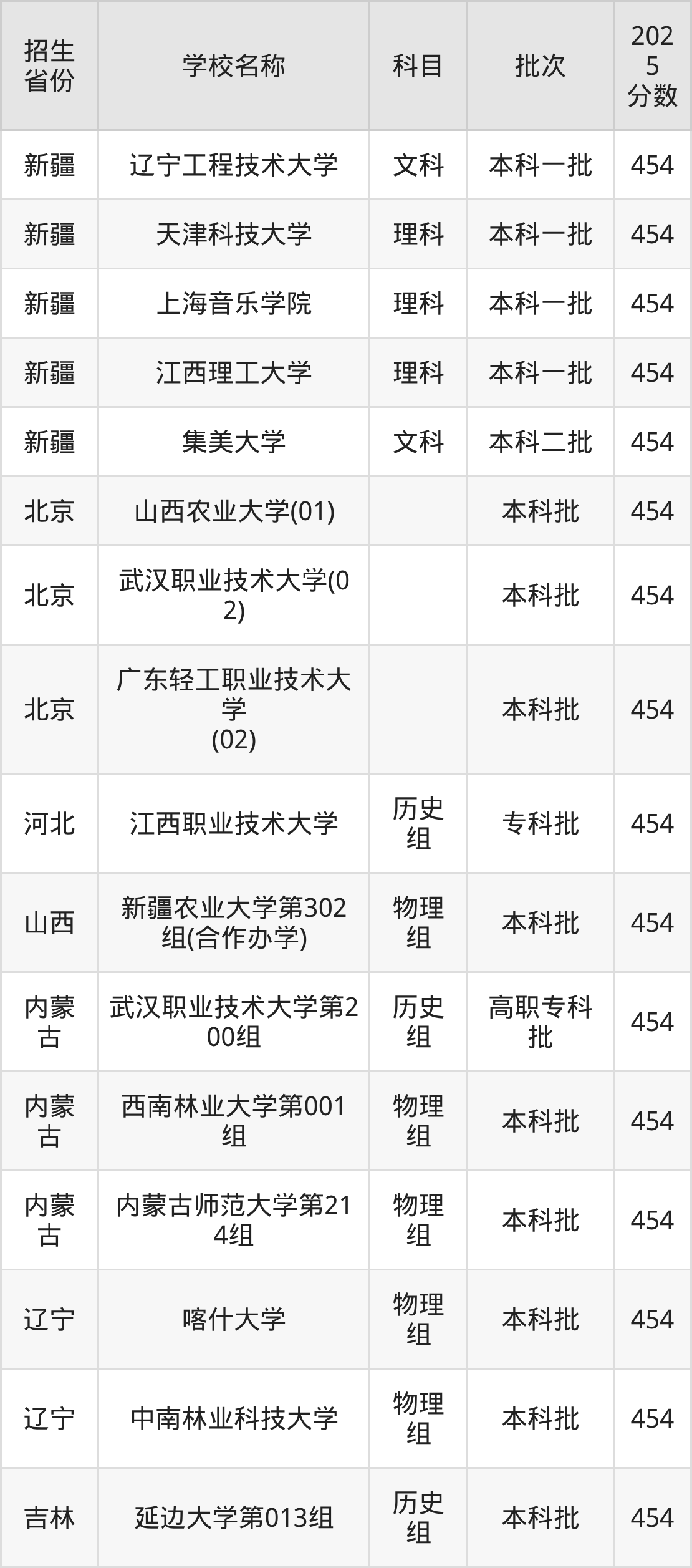 筛选全国各省2025年录取分数线为454分的重点大学如下: