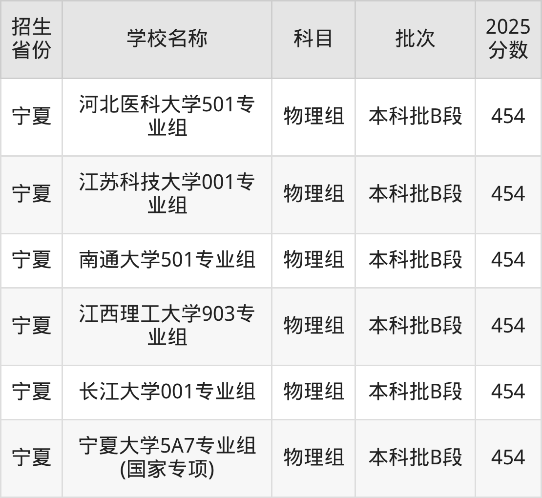 宁夏回族自治区物理组分数线是454分的重点大学有:河北医科大学、江苏科技大学、南通大学、江西理工大学、长江大学、宁夏大学。