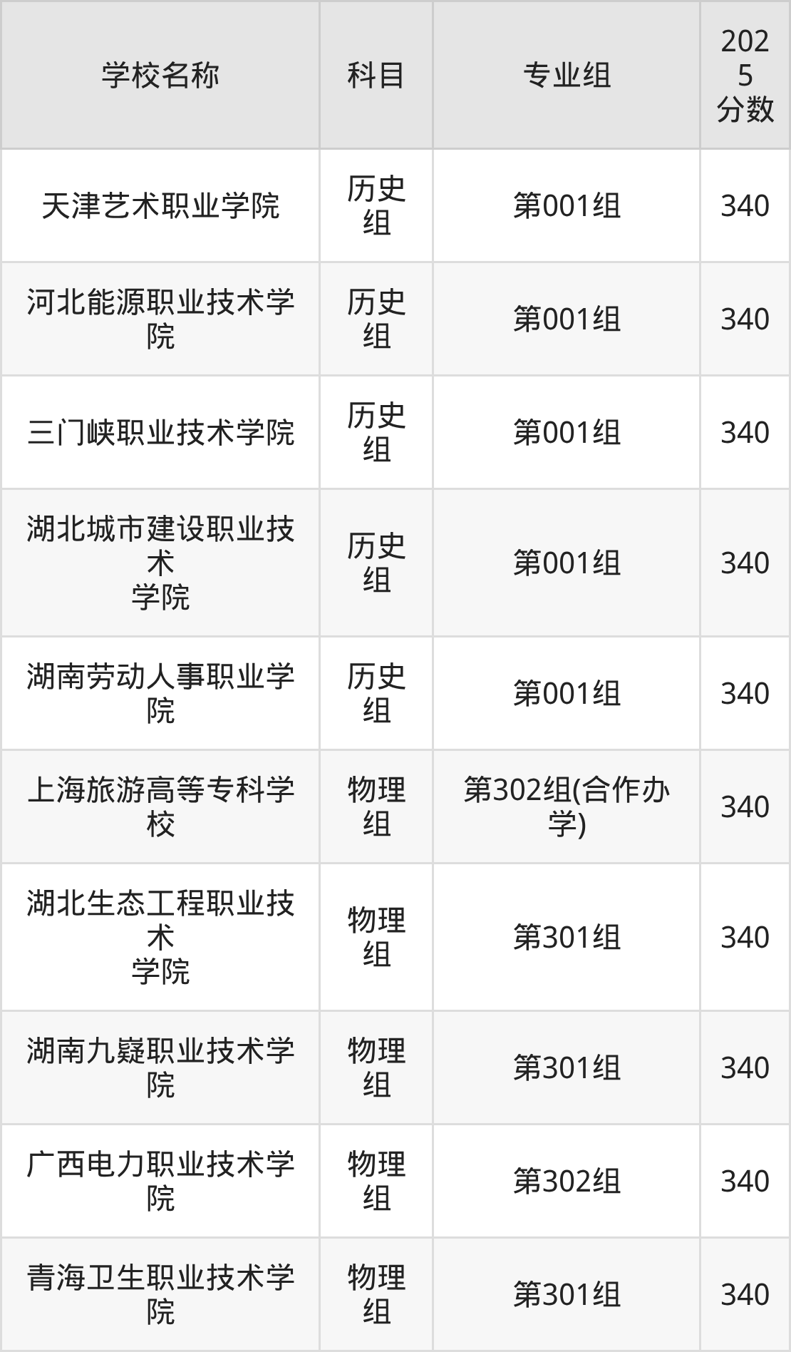 山西高考录取分数线在340分左右的公办院校专业组一共有10个,其中历史组有:天津艺术职业学院(340分)、河北能源职业技术学院(340分)、三门峡职业技术学院(340分),物理组有:上海旅游高等专科学校(340分)、湖北生态工程职业技术学院(340分)、湖南九嶷职业技术学院(340分)。