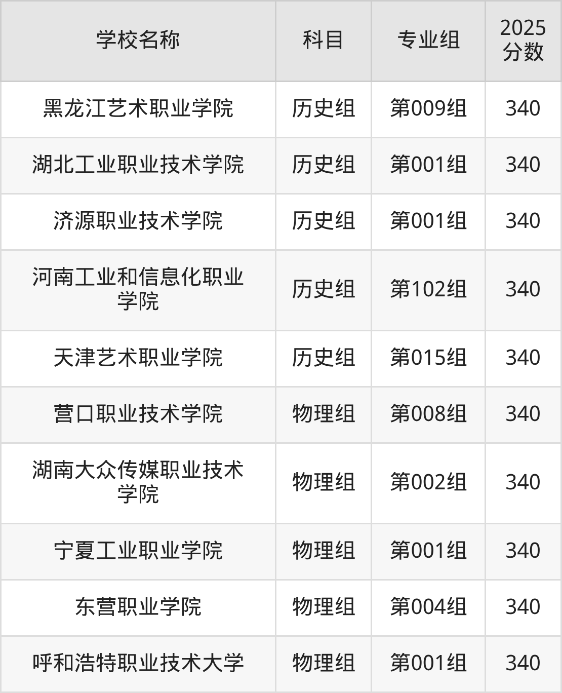 内蒙古高考录取分数线在340分左右的公办院校专业组一共有10个,其中历史组有:黑龙江艺术职业学院(340分)、湖北工业职业技术学院(340分)、济源职业技术学院(340分),物理组有:营口职业技术学院(340分)、湖南大众传媒职业技术学院(340分)、宁夏工业职业学院(340分)。