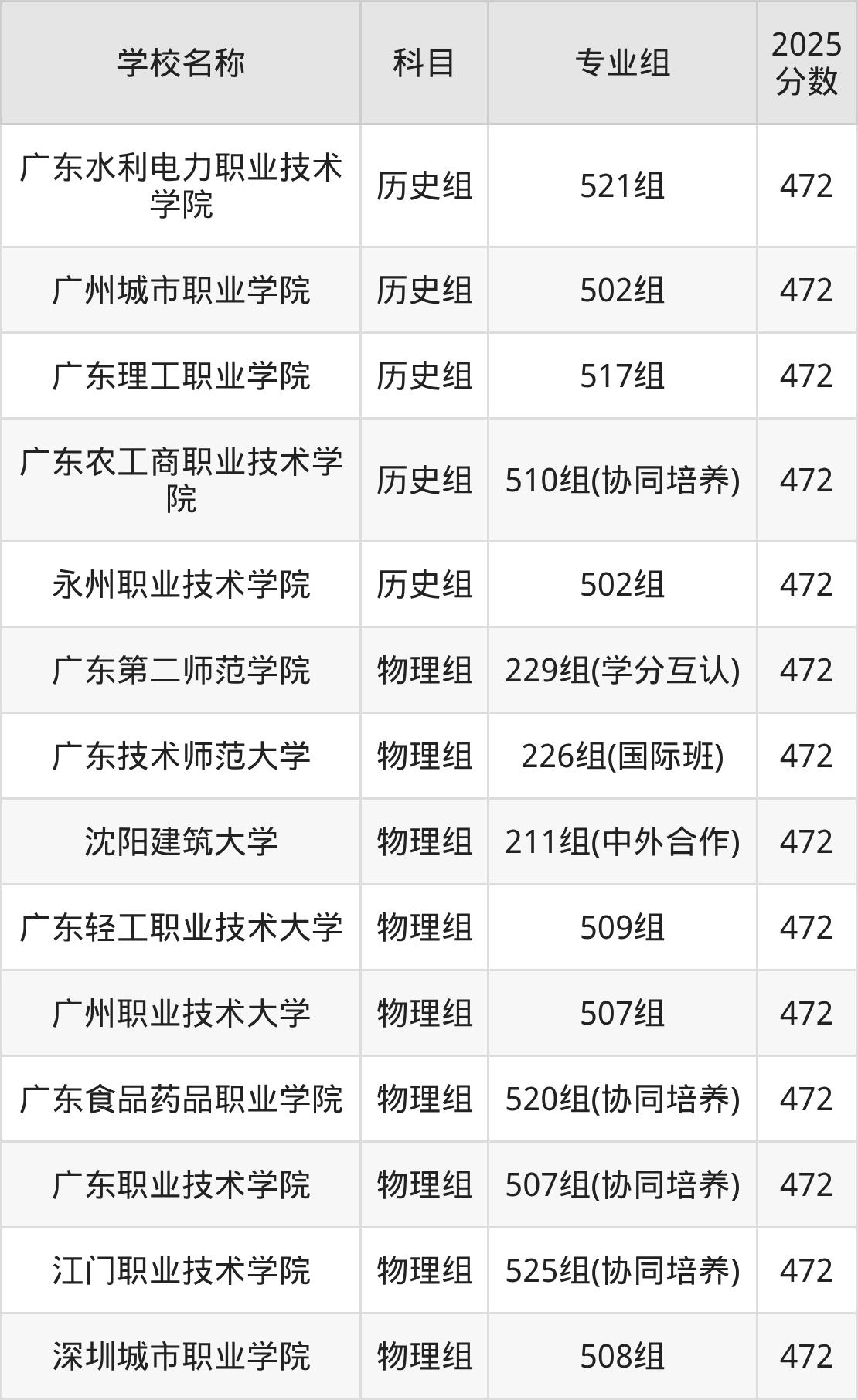 广东高考录取分数线在472分左右的公办院校专业组一共有14个,其中历史组有:广东水利电力职业技术学院(472分)、广州城市职业学院(472分)、广东理工职业学院(472分),物理组有:广东第二师范学院(472分)、广东技术师范大学(472分)、沈阳建筑大学(472分)。